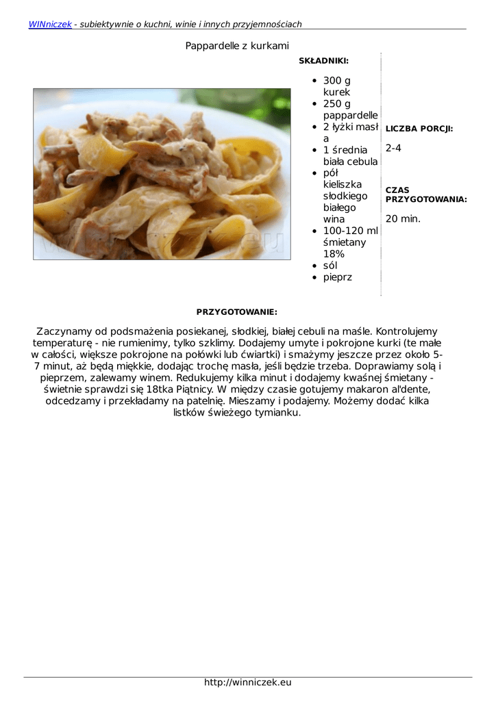 WINniczek - subiektywnie o kuchni, winie i innych przyjemnościach Pappardelle z kurkami SKŁADNIKI: 300 g kurek 250 g pappardelle 2 łyżki masł a 1 średnia biała cebula pół kieliszka słodkiego białego wina 100-120 ml śmietany 18% sól pieprz LICZBA PORCJI: 2-4 CZAS PRZYGOTOWANIA: 20 min. PRZYGOTOWANIE: Zaczynamy od podsmażenia posiekanej, słodkiej, białej cebuli na maśle. Kontrolujemy temperaturę - nie rumienimy, tylko szklimy. Dodajemy umyte i pokrojone kurki (te małe w całości, większe pokrojone na połówki lub ćwiartki) i smażymy jeszcze przez około 57 minut, aż będą miękkie, dodając trochę masła, jeśli będzie trzeba. Doprawiamy solą i pieprzem, zalewamy winem. Redukujemy kilka minut i dodajemy kwaśnej śmietany świetnie sprawdzi się 18tka Piątnicy. W między czasie gotujemy makaron al'dente, odcedzamy i przekładamy na patelnię. Mieszamy i podajemy. Możemy dodać kilka listków świeżego tymianku. http://winniczek.eu WINniczek - subiektywnie o kuchni, winie i innych przyjemnościach http://winniczek.eu
