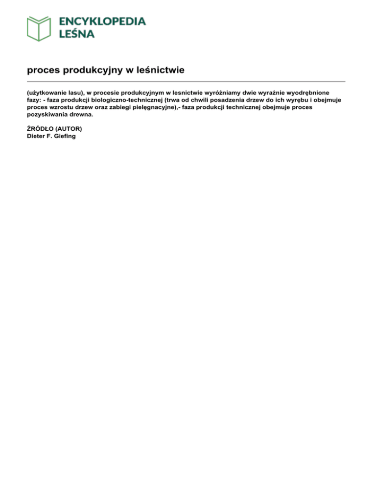 proces produkcyjny w leśnictwie (użytkowanie lasu), w procesie produkcyjnym w lesnictwie wyróżniamy dwie wyraźnie wyodrębnione fazy: - faza produkcji biologiczno-technicznej (trwa od chwili posadzenia drzew do ich wyrębu i obejmuje proces wzrostu drzew oraz zabiegi pielęgnacyjne),- faza produkcji technicznej obejmuje proces pozyskiwania drewna. ŹRÓDŁO (AUTOR) Dieter F. Giefing