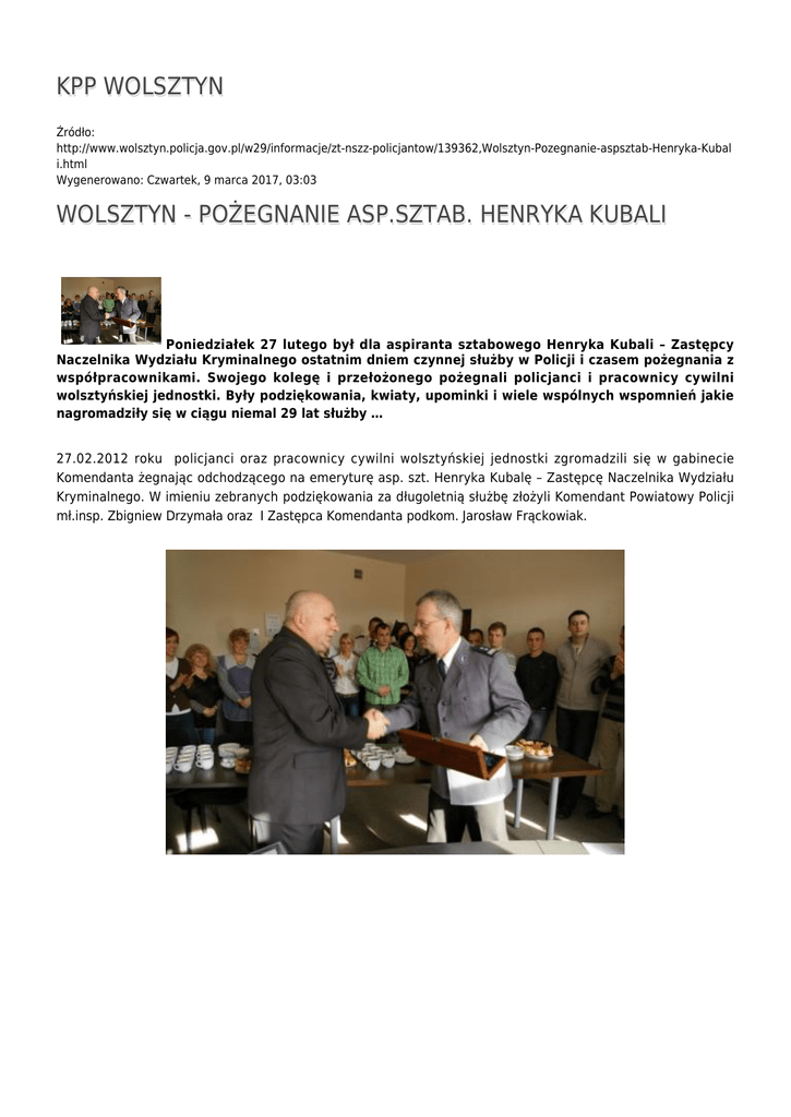 KPP WOLSZTYN Źródło: http://www.wolsztyn.policja.gov.pl/w29/informacje/zt-nszz-policjantow/139362,Wolsztyn-Pozegnanie-aspsztab-Henryka-Kubal i.html Wygenerowano: Czwartek, 9 marca 2017, 03:03 WOLSZTYN - POŻEGNANIE ASP.SZTAB. HENRYKA KUBALI Poniedziałek 27 lutego był dla aspiranta sztabowego Henryka Kubali – Zastępcy Naczelnika Wydziału Kryminalnego ostatnim dniem czynnej służby w Policji i czasem pożegnania z współpracownikami. Swojego kolegę i przełożonego pożegnali policjanci i pracownicy cywilni wolsztyńskiej jednostki. Były podziękowania, kwiaty, upominki i wiele wspólnych wspomnień jakie nagromadziły się w ciągu niemal 29 lat służby … 27.02.2012 roku policjanci oraz pracownicy cywilni wolsztyńskiej jednostki zgromadzili się w gabinecie Komendanta żegnając odchodzącego na emeryturę asp. szt. Henryka Kubalę – Zastępcę Naczelnika Wydziału Kryminalnego. W imieniu zebranych podziękowania za długoletnią służbę złożyli Komendant Powiatowy Policji mł.insp. Zbigniew Drzymała oraz I Zastępca Komendanta podkom. Jarosław Frąckowiak. Nie zabrakło również podziękowań złożonych osobiście przez koleżanki i kolegów, z którymi odchodzący na emeryturę pracował przez ostatnie lata. Do życzeń dołączył się także Naczelnik Wydziału Prewencji nadkom. Rafał Lewandowski oraz reprezentujący mundurowych związkowców Przewodniczący Zarządu Terenowego NSZZ Policjantów w Wolsztynie Piotr Horowski. Szacowny emeryt podziękował wszystkim za obecność i złożone życzenia, które skierowano pod jego adresem. Jak zapewnił, były one dla niego dowodem uznania i sympatii, na które pracował przez niemal 29 lat swojej służby. W tym czasie przeszedł kolejne szczeble policyjnej kariery, począwszy od służby patrolowej, poprzez służbę dzielnicowego aż do pracy w Wydziale Kryminalnym, za pracę którego był odpowiedzialny przez ostatni rok zajmując stanowisko Zastępcy Naczelnika. Uroczystość była okazją nie tylko do podziękowań ale także wspomnień związanych ze służbą i planów na bliższą i dalszą przyszłość, których jak się okazało jest bardzo dużo. Jedną z pierwszych rzeczy jakie zaplanował świeżo upieczony emeryt będzie wędkowanie, na które zawsze brakło czasu. Życzymy taaakiej ryby Panie Naczelniku! Ocena: 0/5 (0) Tweetnij