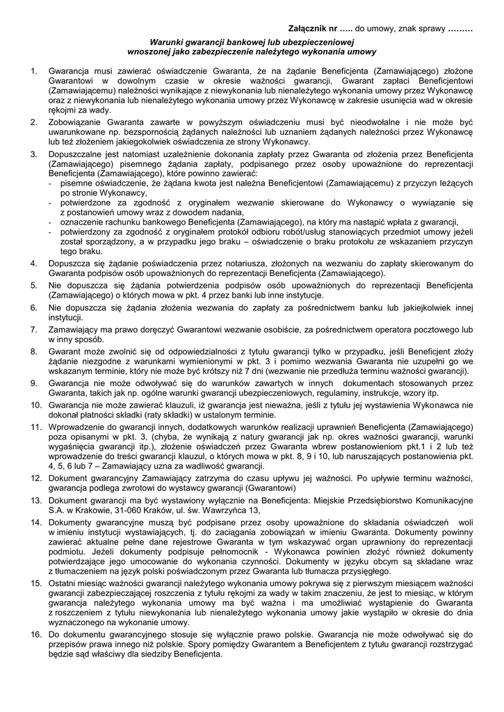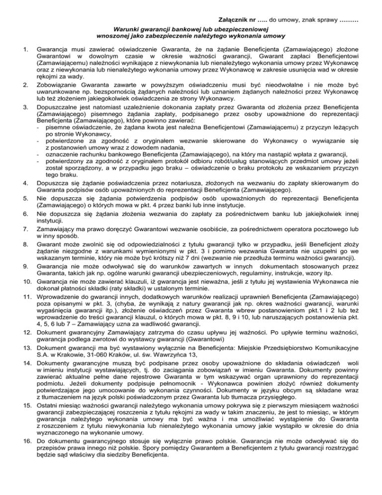 Załącznik nr ….. do umowy, znak sprawy ……… Warunki gwarancji bankowej lub ubezpieczeniowej wnoszonej jako zabezpieczenie należytego wykonania umowy 1. 2. 3. 4. 5. 6. 7. 8. 9. 10. 11. 12. 13. 14. 15. 16. Gwarancja musi zawierać oświadczenie Gwaranta, że na żądanie Beneficjenta (Zamawiającego) złożone Gwarantowi w dowolnym czasie w okresie ważności gwarancji, Gwarant zapłaci Beneficjentowi (Zamawiającemu) należności wynikające z niewykonania lub nienależytego wykonania umowy przez Wykonawcę oraz z niewykonania lub nienależytego wykonania umowy przez Wykonawcę w zakresie usunięcia wad w okresie rękojmi za wady. Zobowiązanie Gwaranta zawarte w powyższym oświadczeniu musi być nieodwołalne i nie może być uwarunkowane np. bezspornością żądanych należności lub uznaniem żądanych należności przez Wykonawcę lub też złożeniem jakiegokolwiek oświadczenia ze strony Wykonawcy. Dopuszczalne jest natomiast uzależnienie dokonania zapłaty przez Gwaranta od złożenia przez Beneficjenta (Zamawiającego) pisemnego żądania zapłaty, podpisanego przez osoby upoważnione do reprezentacji Beneficjenta (Zamawiającego), które powinno zawierać: - pisemne oświadczenie, że żądana kwota jest należna Beneficjentowi (Zamawiającemu) z przyczyn leżących po stronie Wykonawcy, - potwierdzone za zgodność z oryginałem wezwanie skierowane do Wykonawcy o wywiązanie się z postanowień umowy wraz z dowodem nadania, - oznaczenie rachunku bankowego Beneficjenta (Zamawiającego), na który ma nastąpić wpłata z gwarancji, - potwierdzony za zgodność z oryginałem protokół odbioru robót/usług stanowiących przedmiot umowy jeżeli został sporządzony, a w przypadku jego braku – oświadczenie o braku protokołu ze wskazaniem przyczyn tego braku. Dopuszcza się żądanie poświadczenia przez notariusza, złożonych na wezwaniu do zapłaty skierowanym do Gwaranta podpisów osób upoważnionych do reprezentacji Beneficjenta (Zamawiającego). Nie dopuszcza się żądania potwierdzenia podpisów osób upoważnionych do reprezentacji Beneficjenta (Zamawiającego) o których mowa w pkt. 4 przez banki lub inne instytucje. Nie dopuszcza się żądania złożenia wezwania do zapłaty za pośrednictwem banku lub jakiejkolwiek innej instytucji. Zamawiający ma prawo doręczyć Gwarantowi wezwanie osobiście, za pośrednictwem operatora pocztowego lub w inny sposób. Gwarant może zwolnić się od odpowiedzialności z tytułu gwarancji tylko w przypadku, jeśli Beneficjent złoży żądanie niezgodne z warunkami wymienionymi w pkt. 3 i pomimo wezwania Gwaranta nie uzupełni go we wskazanym terminie, który nie może być krótszy niż 7 dni (wezwanie nie przedłuża terminu ważności gwarancji). Gwarancja nie może odwoływać się do warunków zawartych w innych dokumentach stosowanych przez Gwaranta, takich jak np. ogólne warunki gwarancji ubezpieczeniowych, regulaminy, instrukcje, wzory itp. Gwarancja nie może zawierać klauzuli, iż gwarancja jest nieważna, jeśli z tytułu jej wystawienia Wykonawca nie dokonał płatności składki (raty składki) w ustalonym terminie. Wprowadzenie do gwarancji innych, dodatkowych warunków realizacji uprawnień Beneficjenta (Zamawiającego) poza opisanymi w pkt. 3, (chyba, że wynikają z natury gwarancji jak np. okres ważności gwarancji, warunki wygaśnięcia gwarancji itp.), złożenie oświadczeń przez Gwaranta wbrew postanowieniom pkt.1 i 2 lub też wprowadzenie do treści gwarancji klauzul, o których mowa w pkt. 8, 9 i 10, lub naruszających postanowienia pkt. 4, 5, 6 lub 7 – Zamawiający uzna za wadliwość gwarancji. Dokument gwarancyjny Zamawiający zatrzyma do czasu upływu jej ważności. Po upływie terminu ważności, gwarancja podlega zwrotowi do wystawcy gwarancji (Gwarantowi) Dokument gwarancji ma być wystawiony wyłącznie na Beneficjenta: Miejskie Przedsiębiorstwo Komunikacyjne S.A. w Krakowie, 31-060 Kraków, ul. św. Wawrzyńca 13, Dokumenty gwarancyjne muszą być podpisane przez osoby upoważnione do składania oświadczeń woli w imieniu instytucji wystawiających, tj. do zaciągania zobowiązań w imieniu Gwaranta. Dokumenty powinny zawierać aktualne pełne dane rejestrowe Gwaranta w tym wskazywać organ uprawniony do reprezentacji podmiotu. Jeżeli dokumenty podpisuje pełnomocnik - Wykonawca powinien złożyć również dokumenty potwierdzające jego umocowanie do wykonania czynności. Dokumenty w języku obcym są składane wraz z tłumaczeniem na język polski poświadczonym przez Gwaranta lub tłumacza przysięgłego. Ostatni miesiąc ważności gwarancji należytego wykonania umowy pokrywa się z pierwszym miesiącem ważności gwarancji zabezpieczającej roszczenia z tytułu rękojmi za wady w takim znaczeniu, że jest to miesiąc, w którym gwarancja należytego wykonania umowy ma być ważna i ma umożliwiać wystąpienie do Gwaranta z roszczeniem z tytułu niewykonania lub nienależytego wykonania umowy jakie wystąpiło w okresie do dnia wyznaczonego na wykonanie umowy. Do dokumentu gwarancyjnego stosuje się wyłącznie prawo polskie. Gwarancja nie może odwoływać się do przepisów prawa innego niż polskie. Spory pomiędzy Gwarantem a Beneficjentem z tytułu gwarancji rozstrzygać będzie sąd właściwy dla siedziby Beneficjenta. Załącznik nr ….. do umowy, znak sprawy ……… Warunki poręczeń zabezpieczających należyte wykonanie umowy Użyte w regulaminie określenia oznaczają: a) Dłużnik (Wykonawca) – Wykonawca, który złożył zlecenie udzielenia Poręczenia b) Poręczenie – umowa, przygotowana przez Poręczyciela zgodnie ze zleceniem i niniejszym regulaminem, w której Poręczyciel zobowiązuje się względem wierzyciela wykonać zobowiązanie na warunkach poręczenia na wypadek, gdyby Dłużnik nie wykonał zobowiązania określonego w poręczeniu c) Poręczyciel – bank, spółdzielcza kasa oszczędnościowo-kredytowa lub podmioty, o których mowa w a