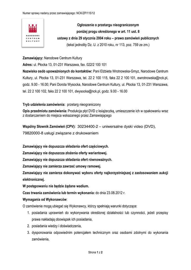 Numer sprawy nadany przez zamawiającego: NCK/ZP/115/12 Ogłoszenie o przetargu nieograniczonym poniżej progu określonego w art. 11 ust. 8 ustawy z dnia 29 stycznia 2004 roku – prawo zamówień publicznych (tekst jednolity Dz. U. z 2010 roku, nr 113, poz. 759 ze zm.) Zamawiający: Narodowe Centrum Kultury Adres: ul. Płocka 13, 01-231 Warszawa, fax. 022/2 100 101 Nazwiska osób upoważnionych do kontaktów: Pani Elżbieta Wrotnowska-Gmyz, Narodowe Centrum Kultury, ul. Płocka 13, 01-231 Warszawa, tel. 22 2 100 115, faks 22 2 100 101, [email protected], godz. 9.00 - 16.00; Pani Dorota Wysocka, Narodowe Centrum Kultury, ul. Płocka 13, 01-231 Warszawa, tel. 22 2 100 102, faks 22 2 100 101, [email protected], godz. 9.00 - 16.00 Tryb udzielenia zamówienia: przetarg nieograniczony Opis przedmiotu zamówienia: Produkcja płyt DVD z książeczką, umieszczenie ich w opakowaniu wraz z dostarczeniem do miejsca wskazanego przez Zamawiającego Wspólny Słownik Zamówień (CPV): 30234400-2 – uniwersalne dyski video (DVD), 79820000-8 usługi związane z drukowaniem Zamawiający nie dopuszcza składania ofert częściowych. Zamawiający nie dopuszcza złożenia oferty wariantowej. Zamawiający nie dopuszcza składania ofert równoważnych. Zamawiający nie zamierza zawrzeć umowy ramowej. Zamawiający nie zamierza dokonywać wyboru oferty najkorzystniejszej z zastosowaniem aukcji elektronicznej. W postępowaniu nie będzie żądane wadium. Czas trwania zamówienia lub termin wykonania: do dnia 23.08.2012 r. Wymagania od Wykonawców: O zamówienie mogą ubiegać się Wykonawcy, którzy spełniają warunki dotyczące: 1. posiadania uprawnień do wykonywania określonej działalności lub czynności, jeżeli przepisy prawa nakładają obowiązek ich posiadania, 2. posiadania wiedzy i doświadczenia, 3. dysponowania odpowiednim potencjałem technicznym oraz osobami zdolnymi do wykonania zamówienia, Strona 1 z 2 Numer sprawy nadany przez zamawiającego: NCK/ZP/115/12 4. sytuacji ekonomicznej i finansowej. 5. nie podlegania wykluczeniu z postępowania na podstawie art. 24 ust. 1 upzp. Opis sposobu dokonania oceny spełniania warunków udziału w postępowaniu Ocena spełniania warunków udziału w postępowaniu zostanie dokonana na podstawie dokumentów i informacji złożonych przez Wykonawcę oraz Oświadczenia stanowiącego załącznik nr 2 do Specyfikacji Istotnych Warunków Zamówienia. Ocena będzie dokonana metodą: spełnia – nie spełnia. Kryteria oceny ofert: Kryterium Znaczenie Cena brutto za Produkcja płyt DVD z książeczką, umieszczenie ich w opakowaniu wraz z dostarczeniem do miejsca wskazanego przez Zamawiającego Razem 100% 100 % Termin składania ofert: do dnia 30.07.2012 r., do godziny 13.00 w Narodowym Centrum Kultury, ul. Płocka 13, 01–231 Warszawa, w recepcji. Termin związania z ofertą: 30 dni licząc od upływu terminu składania ofert. Określenie sposobu uzyskania specyfikacji istotnych warunków zamówienia oraz adres strony internetowej, na której została zamieszczona Specyfikacja Istotnych Warunków Zamówienia: Specyfikacja istotnych warunków zamówienia jest dostępna w siedzibie Zamawiającego w Narodowym Centrum Kultury Specyfikacja Istotnych Warunków Zamówienia została zamieszczona na stronie internetowej Zamawiającego www.nck.pl Data wywieszenia: 20.07.2012 r. Edward Chudzik Zastępca Dyrektora Narodowego Centrum Kultury Strona 2 z 2