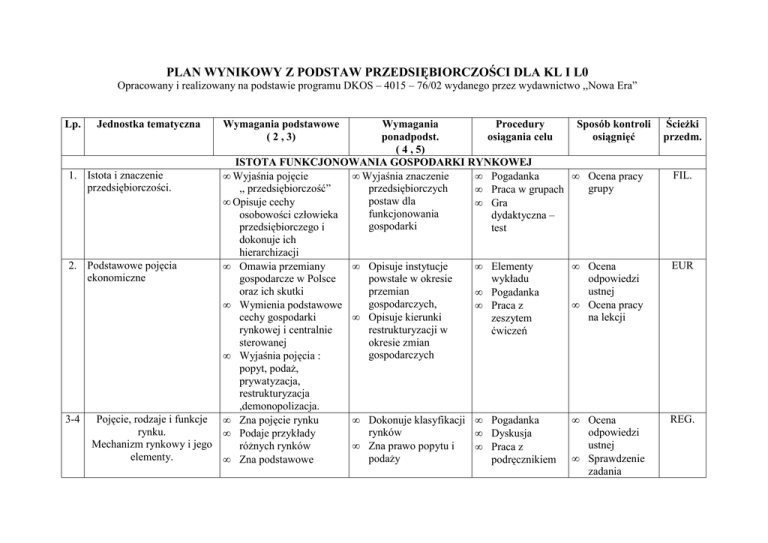 PLAN WYNIKOWY Z PODSTAW PRZEDSIĘBIORCZOŚCI DLA KL I L0 Opracowany i realizowany na podstawie programu DKOS – 4015 – 76/02 wydanego przez wydawnictwo ,,Nowa Era” Lp. Jednostka tematyczna 1. Istota i znaczenie przedsiębiorczości. • • 2. Podstawowe pojęcia ekonomiczne • • • 3-4 Pojęcie, rodzaje i funkcje • rynku. • Mechanizm rynkowy i jego elementy. • Wymagania Procedury ponadpodst. osiągania celu ( 4 , 5) ISTOTA FUNKCJONOWANIA GOSPODARKI RYNKOWEJ Wyjaśnia pojęcie • Wyjaśnia znaczenie • Pogadanka ,, przedsiębiorczość” przedsiębiorczych • Praca w grupach postaw dla Opisuje cechy • Gra funkcjonowania osobowości człowieka dydaktyczna – gospodarki przedsiębiorczego i test dokonuje ich hierarchizacji Omawia przemiany • Opisuje instytucje • Elementy gospodarcze w Polsce powstałe w okresie wykładu oraz ich skutki przemian • Pogadanka gospodarczych, Wymienia podstawowe • Praca z cechy gospodarki • Opisuje kierunki zeszytem rynkowej i centralnie restrukturyzacji w ćwiczeń sterowanej okresie zmian gospodarczych Wyjaśnia pojęcia : popyt, podaż, prywatyzacja, restrukturyzacja ,demonopolizacja. Zna pojęcie rynku • Dokonuje klasyfikacji • Pogadanka rynków Podaje przykłady • Dyskusja różnych rynków • Zna prawo popytu i • Praca z podaży podręcznikiem Zna podstawowe Sposób kontroli osiągnięć Ścieżki przedm. • Ocena pracy grupy FIL. • Ocena odpowiedzi ustnej Ocena pracy na lekcji EUR Ocena odpowiedzi ustnej Sprawdzenie zadania REG. Wymagania podstawowe ( 2 , 3) • • • funkcje rynku na podstawie rynków lokalnych 5. Podstawowe podmioty w gospodarce rynkowej. • • • • 6-7 Giełda Papierów wartościowych. Akcje i obligacje. • • • • Wymienia podstawowe podmioty gospodarki rynkowej • Określa ich znaczenie i funkcje Podaje źródła dochodów i kierunki wydatków gospodarstw domowych Wyjaśnia pojęcia : budżet, dochód, zysk, spółdzielnia, spółka Zna i rozumie pojęcia : • rynek kapitałowy, papier wartościowy( akcja, obligacja, weksel, indeks giełdowy) Wymienia rodzaje akcji • • • Wyjaśnia zasadę funkcjonowania mechanizmu rynk. Klasyfikuje przedsiębiorstwa wg różnych kryteriów Omawia funkcje i zasady działania różnych instytucji finansowych domowego • • • Wyjaśnia cel i • mechanizm • funkcjonowania giełd, w tym Giełdy Papierów • Wartościowych Czyta ze zrozumieniem tabele z notowaniami giełdowymi Wyszukuje w różnych źródłach informacje giełdowe i komunikaty spółek Opisuje pracę maklera • Elementy wykładu i pogadanki • Praca w grupach Praca z podręcznikiem i danymi statystycznymi Pogadanka Praca z materiałami pomocniczymi Praca z zeszytem ćwiczeń • Ocena odpowiedzi ustnej Ocena pracy na lekcji Sprawdzenie i ocena zadania domowego • FIL 8. Budżet gospodarstwa domowego. • • 9 – Budżet państwa. 10 Budżet jednostek samorządowych. . • • • 11 giełdowego Analizuje strukturę • Ocenia zdolnośc • dochodów i wydatków rodziny do swojej rodziny zaciągnięcia kredytu Ustala źródła • Wymienia i opisuje • potencjalnych podstawowe sposoby oszczędności w lokowania i budżecie domowym inwestowania oszczędności Podaje źródła • Omawia zasady • dochodów o kierunki konstruowania • wydatków budżetu budżetu państwa • państwa i jednostek • Wyszukuje w samorządowych dostępnych źródłach • założenia budżetowe Wymienia podstawowe zasady konstrukcji na bieżący rok i budżetu państwa sprawozdania z wykonania budżetu za Wyjaśnia pojęcia :dług lata ubiegłe publiczny, deficyt budżetowy itp. • Uzasadnia konieczność decentralizacji finansów państwa Powtórzenie i sprawdzian wiadomości Elementy • dyskusji i burzy mózgów Praca z • zeszytem ćwiczeń • • Pogadanka Praca w grupach Praca z danymi statystycznymi • Zeszyt ćwiczeń Ocena prezentacji na temat GPW Sprawdzenie zadania domowego Ocena pracy na lekcji Ocena odpowiedzi ustnej Ocena referatu na temat budżety gminy REG II . KOMUNIKACJA INTERPERSONALNA 12, Znaczenie i rodzaje 13 komunikacji społecznej. Bariery komunikacji. • • Rozróżnia komunikaty • werbalne i niewerbalne Odczytuje • podstawowe Wymienia cechy • dobrego nadawcy i • odbiorcy Wykorzystuje techniki • komunikacji werbalnej i Pogadanka Praca z podręcznikiem Drama • Ocena pracy na lekcji – udział w dyskusji i dramie FIL ZDR • • 14 Poznaj samego siebie. • • • 15 Rodzaje zachowań. • • 16 Postawa asertywna. • • komunikaty niewerbalne Wymienia • najważniejsze cechy komunikatu niewerbalnego Identyfikuje bariery w komunikacji Definiuje pojęcie • osobowości Opisuje różne typy • osobowości Ocenia mocne i słabe strony swojej osobowości Wyjaśnia pojęcia: egoizm, konformizm Wyjaśnia na czym polega postawa bierna, agresywna, manipulacyjna • Wyjaśnia cechy postawy asertywnej Podaje przykłady asertywnych zachowań i ich skutki • • • • niewerbalnej w różnych • sytuacjach życiowych Wskazuje czynniki sprzyjające porozumiewaniu się Dokonuje autoprezentacji Dokonuje trafnej i uzasadnionej samooceny • • • Dyskusja Dyskusja Pogadanka Drama • • • Analizuje mocne i słabe strony swojej osobowości Ocenia swoje predyspozycje Wyjaśnia przyczyny i skutki różnych postaw wobec problemów Zna prawa asertywności Reaguje asertywnie w kilku sytuacjach problemowych w warunkach symulacyjnych • • • • Wykład z elementami dyskusji Praca z zeszytem ćwiczeń • Praca z podręcznikiem Inscenizacja • • Ocena odpowiedzi ustnej Ocena aktywnej pracy na lekcji Sprawdzenie zeszytu ćwiczeń Ocena odpowiedzi ustnej Kartkówka Ocena uczniów biorących udział w inscenizacji FIL 17 Praca zespołowa • • • 18 Rozwiązywanie konfliktów. • • • 19 Prowadzenie negocjacji. • • Wymienia zalety i wady pracy zespołowej Rozumie rosnące znaczenie pracy zespołowej Wyjaśnia role lidera zespołu i in