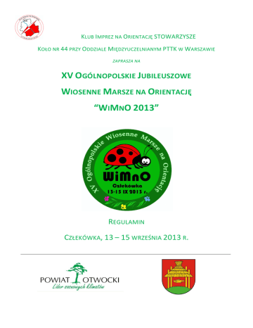KLUB IMPREZ NA ORIENTACJĘ STOWARZYSZE KOŁO NR 44 PRZY ODDZIALE MIĘDZYUCZELNIANYM PTTK W WARSZAWIE ZAPRASZA NA XV OGÓLNOPOLSKIE JUBILEUSZOWE WIOSENNE MARSZE NA ORIENTACJĘ “WIMNO 2013” REGULAMIN CZŁEKÓWKA, 13 – 15 WRZEŚNIA 2013 R. 1. T ERMIN I MIEJSCE Rajd na orientację odbędzie się w dniach 13-15 września 2013 roku (piątek – niedziela) w okolicach Człekówki, na terenie gminy Kołbiel, powiat otwocki, województwo mazowieckie - nadleśnictwo Celestynów. 2. O RGANIZATOR Klub InO STOWARZYSZE Koło nr 44 przy Oddziale Międzyuczelnianym PTTK w Warszawie 3. W SPÓŁORGANIZATOR Szkoła Podstawowa w Człekówce - http://www.szpcz.npx.pl 4. P ATRONAT HONOROWY Pani Bogumiała Więckowska – Starosta Powiatu Otwockiego - http://www.powiat-otwocki.pl Pan Adam Budyta - Wójt Gminy Kołbiel - http://www.kolbiel.pl 5. C ELE R AJDU popularyzacja turystycznych marszów na orientację, jako doskonałej formy niekonwencjonalnego wypoczynku poznanie walorów turystycznych gminy Kołbiel i powiatu otwockiego praktyczne potwierdzenie własnych umiejętności orientacji w terenie oraz posługiwania się mapą i kompasem podnoszenie ogólnej sprawności fizycznej uczestników rozwijanie zamiłowania do uprawiania turystyki kwalifikowanej, sportu i rekreacji 6. K OMITET ORGANIZACYJNY Kierownik Imprezy: Dariusz Walczyna Sędzia Główny: Barbara Szmyt, Przodownik InO nr 660 Budowniczowie tras: Barbara Szmyt Dariusz Walczyna, PInO 420 Anna Natusiewicz, PInO 665 Tomek Dombi, PInO 645 Sekretariat: Magdalena Senderowska, Emilia Walczyna Fotograf: Ewelina Walczyna 7. FORMA, ETAPY, KATEGORIE Turystyczne marsze na orientację TZ (trasa dla zaawansowanych) – 3 etapy (2 dzienne i 1 nocny), zespoły 1-2 osobowe; 3x3 pkt. do odznaki InO, trasa zaliczana do XLVI Konkursu TMWiM w kat. TZ TU/TJ (trasa dla średniozaawansowanych i juniorów) – 3 etapy (2 dzienne i 1 nocny), zespoły 1-3 osobowe; 3x3 pkt. do odznaki InO, trasa zaliczana do XLVI Konkursu TMWiM w kat. TU oraz TJ (dla osób urodzonych w latach 1994-1996) TP (trasa dla początkujących i dzieci) – 2 etapy dzienne, zespoły 1-5 osobowe; 2x2 pkt. do odznaki InO Turystyczno-Rekreacyjna InO Trasa krajoznawcza w okolicach Człekówki/Karpisk (na terenie gminy Kołbiel), 1 pkt. do odznaki InO Trasa przyrodnicza o charakterze TRInO, 1 pkt. do odznaki InO Mini-InO Trasa na obszarze szkolnym SP w Człekówce, 1 pkt. do odznaki InO Start w trasach TRInO i MiniInO – dla wszystkich chętnych uczestników Imprezy. 8. T EREN , MAPY Teren leśny, z morenowym ukształtowaniem powierzchni, miejscami może być podmokły Mapy: czarno-białe i kolorowe, przekształcone, w odpowiedniej skali, nietypowe. 9. B AZA I MPREZY I DOJAZD Baza: Szkoła Podstawowa w Człekówce, Człekówka 62 Noclegi: warunki turystyczne (sala gimnastyczna) – należy obowiązkowo posiadać własny sprzęt turystyczny (śpiwór, karimata/materac) i miękkie obuwie na zmianę Dojazd: własnym środkiem lokomocji (dojazd do Człekówki trasą Warszawa – Lublin i w Kołbieli skręt na drogę nr 50 w kier. Góry Kalwarii i po kilkuset metrach skręt w lewo do Człekówki) lub przez Piaseczno i w Górze Kalwarii skręt na DK nr 50 w kier. Mińska Maz. do Karpisk. PKP (http://rozklad-pkp.pl - do stacji Kołbiel i dojście pieszo): odjazdy ze stacji WarszawaWschodnia: pt.: 15:48, 16:29, 16:48, 17:48, 18:50, 19:47, 20:48, 21:48, 22:48; sb.: 00:48, 05:25, 06:48, 07:51, 08:48. bus: Arka Bus (odjazdy z przystanku Centrum Zdrowia Dziecka: godz. 15:20, 19:25 oraz w sobotę o godz. 7:15). 10. Z GŁOSZENIA I WPISOWE Zgłoszenia zawierające imię, nazwisko, kategorię, rok urodzenia, klub/miejscowość, adres zamieszkania, e-mail będą przyjmowane za pomocą formularza elektronicznego na stronie: http://www.orienteering.waw.pl/pl/entry/team/102 lub za pomocą poczty elektronicznej na adres: [email protected] do 9.09.2013 r. (poniedziałek) do godz. 23:59. Wpisowe należy przesłać na konto Oddziału Międzyuczelnianego PTTK w Warszawie: 49 1140 1010 0000 3281 2500 1007 (z dopiskiem w tytule przelewu: “WiMnO 2013” i podaniem nazwisk) lub przekazać bezpośrednio Kierownikowi Imprezy (przed imprezą lub w bazie – po wcześniejszym uzgodnieniu). TZ i TU/TJ Przodownicy InO 26 zł Członkowie PTTK 28 zł Niezrzeszeni 32 zł TP 10 zł 12 zł W kategorii TP wpisowe nie obejmuje obiadu i noclegu. Zgłoszenia po terminie (9.09.2013) wzrastają o 5 zł i nie gwarantują pełnych świadczeń. Dodatkowe informacje pod telefonem: 605 962 218 (kierownik imprezy), e-mail: [email protected] Informacje bieżące i komunikat techniczny (do 11.09.2013 r.): http://stowarzysze.om.pttk.pl/?p=1537 11. R AMOWY PROGRAM IMPREZY Piątek, 13 września 2013 r. od godz. 18:00 - praca sekretariatu; przyjmowanie uczestników w bazie, zakwaterowanie Sobota, 14 września 2013 r. od 7:30 - praca sekretariatu 09:00 - uroczyste otwarcie imprezy, odprawa techniczna 09:30 - start etapów dziennych kat. TZ i TU/TJ 10:00 start etapów kat. TP 15:00 –17:00 - obiad 16:30 – 20:00 - etapy TRInO i MiniInO, konkursy, odpoczynek 20:30 - start etapu nocnego kat. TU/TJ i TZ Niedziela, 15 września 2013 r. 1:30 - wstępne wyniki 7:30 - uroczyste zakończenie imprezy i ogłoszenie wyników 8:30 – 9:00 - opuszczanie bazy przez uczestników 12. Ś WIADCZENIA komplet map, pamiątkowa naklejka i inne materiały startowe dla każdego uczestnika dwa noclegi w warunkach turystycznych (należy posiadać własny śpiwór i materac) członkowie PTTK objęci będą ubezpieczeniem od NNW członków Towarzystwa (pozostali uczestnicy ubezpieczają się we własnym zakresie) gorący posiłek w sobotę oraz woda, herbata i przekąska pomiędzy etapami dziennymi dostęp do wrzątku w bazie imprezy dyplomy dla najlepszych we wszystkich kategoriach odcisk okolicznościowej pieczęci i potwierdzenie punktów do odznak PTTK (w tym InO) możliwość weryfikacji Odznaki InO w stopniu do małego złotego włącznie udział w konkursach niespodziankach