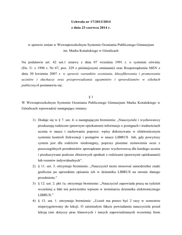 Uchwała nr 17/2013/2014 z dnia 23 czerwca 2014 r. w sprawie zmian w Wewnątrzszkolnym Systemie Oceniania Publicznego Gimnazjum im. Marka Kotańskiego w Góralicach Na podstawie art. 42 ust.1 ustawy z dnia 07 września 1991 r. o systemie oświaty (Dz. U. z 1996 r. Nr 67, poz. 329 z późniejszymi zmianami) oraz Rozporządzenia MEN z dnia 30 kwietnia 2007 r. w sprawie warunków oceniania, klasyfikowania i promowania uczniów i słuchaczy oraz przeprowadzania egzaminów i sprawdzianów w szkołach publicznych postanawia się: §1 W Wewnątrzszkolnym Systemie Oceniania Publicznego Gimnazjum Marka Kotańskiego w Góralicach wprowadzić następujące zmiany: 1) Dodaje się w § 7. ust. 4. o następującym brzmieniu: „Nauczyciele i wychowawcy przekazują rodzicom (prawnym opiekunom) informacje o postępach i trudnościach ucznia w nauce i zachowaniu poprzez: wpisy dokonywane w elektronicznym systemie kontroli frekwencji i postępów w nauce LIBRUS lub, gdy powyższy system jest dla rodziców niedostępny, poprzez pisemne zestawienia ocen z poszczególnych przedmiotów sporządzane przez wychowawcę dla każdego ucznia i przekazywane podczas zbiorowych spotkań z rodzicami (prawnymi opiekunami) lub rozmów indywidualnych”. 2) § 11. ust. 3. otrzymuje brzmienie: „Nauczyciel może stosować samodzielne znaki graficzne po uprzednim opisaniu ich w dzienniku LIBRUS na stronie danego przedmiotu.” 3) § 12. ust. 2. pkt 1a. otrzymuje brzmienie: „Nauczyciel zapowiada pracę na tydzień wcześniej a fakt ten potwierdza wpisem w terminarzu dziennika elektronicznego LIBRUS.” 4) § 13. ust. 1. otrzymuje brzmienie: „Uczeń ma prawo być 2 razy w semestrze nieprzygotowany do lekcji. O zaistniałym fakcie powiadamia nauczyciela przed lekcją (nie dotyczy prac klasowych i innych zapowiedzianych wcześniej form odpowiedzi). Nauczyciel odnotowuje zgłoszenie w dzienniku elektronicznym LIBRUS wpisując skrót „np”. 5) § 15. ust. 1. otrzymuje brzmienie: klasyfikacyjnych rocznych „O przewidywanych dla ucznia ocenach (śródrocznych) nauczyciel jest obowiązany poinformować ucznia i jego rodziców (prawnych opiekunów) poprzez system elektroniczny LIBRUS lub w formie pisemnej.” 6) Dodaje się w § 25. ust. 1. pkt 7e o następującym brzmieniu: „nigdy nie przejawia agresji słownej (przezywanie, wyśmiewanie, ośmieszanie, rozpowszechnianie plotek, oszukiwanie, obrażanie innych, uprzykrzanie życia pierwszoklasistom itp.) i nie daje się sprowokować.” 7) Dodaje się w § 25. ust. 2. pkt 7e o następującym brzmieniu: „nigdy nie przejawia agresji słownej (przezywanie, wyśmiewanie, ośmieszanie, rozpowszechnianie plotek, oszukiwanie, obrażanie innych, uprzykrzanie życia pierwszoklasistom itp.) i nie daje się sprowokować.” 8) § 25. ust. 3. pkt 7a otrzymuje brzmienie: „osób starszych oraz kolegów nie obraża zachowaniem i nie przejawia agresji słownej (przezywanie, wyśmiewanie, ośmieszanie, rozpowszechnianie plotek, oszukiwanie, obrażanie innych, uprzykrzanie życia pierwszoklasistom itp.),” 9) § 25. ust. 4. pkt 7a otrzymuje brzmienie: „incydentalnie obraża osoby starsze oraz kolegów zachowaniem lub agresją słowną (przezywaniem, wyśmiewaniem, ośmieszaniem, rozpowszechnianiem plotek, oszukiwaniem, obrażaniem innych, uprzykrzaniem życia pierwszoklasistom itp.),” 10) § 25. ust. 5. pkt 7b otrzymuje brzmienie: „często zdarza mu się obrazić zachowaniem lub słowem poprzez agresję słowną (przezywanie, wyśmiewanie, ośmieszanie, rozpowszechnianie plotek, oszukiwanie, obrażanie innych, uprzykrzanie życia pierwszoklasistom itp.) nauczyciela, pracownika szkoły lub ucznia,” 11) Dodaje się w § 25. ust. 6. pkt 7c o następującym brzmieniu: „nagminnie przejawia agresję słowną (przezywanie, wyśmiewanie, ośmieszanie, rozpowszechnianie plotek, oszukiwanie, obrażanie innych, uprzykrzanie życia pierwszoklasistom).” §2 Ujednolicić tekst Wewnątrzszkolnego Systemu Oceniania Publicznego Gimnazjum im. Marka Kotańskiego w Góralicach. Ujednolicony tekst stanowi załącznik do niniejszej uchwały. §2 Wykonanie uchwały powierza się dyrektorowi szkoły. §3 Uchwała wchodzi w życie z dniem podjęcia. Przewodniczący Rady Pedagogicznej