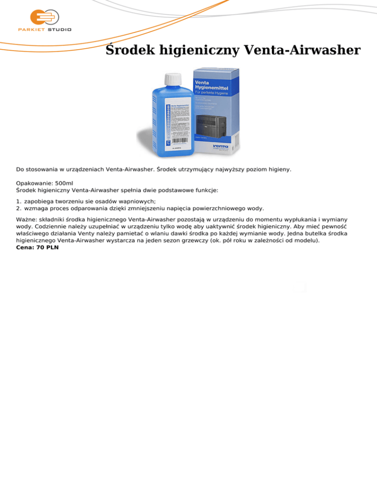 Środek higieniczny Venta-Airwasher Do stosowania w urządzeniach Venta-Airwasher. Środek utrzymujący najwyższy poziom higieny. Opakowanie: 500ml Środek higieniczny Venta-Airwasher spełnia dwie podstawowe funkcje: 1. zapobiega tworzeniu sie osadów wapniowych; 2. wzmaga proces odparowania dzięki zmniejszeniu napięcia powierzchniowego wody. Ważne: składniki środka higienicznego Venta-Airwasher pozostają w urządzeniu do momentu wypłukania i wymiany wody. Codziennie należy uzupełniać w urządzeniu tylko wodę aby uaktywnić środek higieniczny. Aby mieć pewność właściwego działania Venty należy pamietać o wlaniu dawki środka po każdej wymianie wody. Jedna butelka środka higienicznego Venta-Airwasher wystarcza na jeden sezon grzewczy (ok. pół roku w zależności od modelu). Cena: 70 PLN