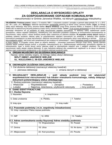 POLA JASNE WYPEŁNIA SKŁADAJĄCY, KOMPUTEROWO LUB RĘCZNIE DRUKOWANYMI LITERAMI Załącznik nr 1 do Uchwały nr XXV/ 177/2013 Rady Gminy Janowice Wielkie z dnia 26 czerwca 2013r. w sprawie zmiany Uchwały nr XXI/150/2012 z dnia 28 grudnia 2012 r w sprawie wzoru deklaracji o wysokości opłaty za gospodarowanie odpadami komunalnymi składanej przez właściciela nieruchomości DEKLARACJA O WYSOKOŚCI OPŁATY ZA GOSPODAROWANIE ODPADAMI KOMUNALNYMI - nieruchomości w Gminie Janowice Wielkie, na których zamieszkują mieszkańcy OBJAŚNIENIA: Podstawa prawna: ustawa z 13 września 1996 r. o utrzymaniu czystości i porządku w gminach (tekst jednolity Dz. U. z 2012, poz. 391 z późn. zm.). Składający: właściciel nieruchomości zamieszkałej położonej na terenie Gminy Janowice Wielkie. Organ, do którego należy złożyć deklarację: Wójt Gminy Janowice Wielkie. Miejsce składania: Urząd Gminy Janowice Wielkie, ul. Kolejowa 2, 58-520 Janowice Wielkie albo na elektroniczną skrzynką podawczą Urzędu Gminy Janowice Wielkie. Termin: 14 dni od dnia zamieszkania na danej nieruchomości pierwszego mieszkańca lub od powstania na danej nieruchomości odpadów komunalnych. W deklaracji należy zadeklarować sposób gromadzenia i odbioru odpadów (selektywny, nieselektywny) oraz ewentualne posiadanie urządzenia do kompostowania (kompostownika) na nieruchomości; należy wybrać i wpisać określoną stawkę opłaty uzależnioną od zbierania odpadów. W przypadku zmiany danych będących podstawą ustalenia wysokości należnej opłaty za gospodarowanie odpadami komunalnymi lub określonej w deklaracji ilości odpadów komunalnych powstających na danej nieruchomości, właściciel nieruchomości jest zobowiązany złożyć nową deklarację w terminie 14 dni od dnia wystąpienia zmiany. Jeśli liczba osób zameldowanych jest mniejsza niż zamieszkałych – należy przedstawić dowód zamieszkania tych osób w innym miejscu. W przypadku zmiany stawki po złożeniu deklaracji – ponownego przeliczenia dokonuje Urząd Gminy. Sposób zbierania odpadów będzie podlegał bieżącej kontroli: w przypadku niewywiązywania się z zadeklarowanego selektywnego gromadzenia odpadów lub kompostowania, organ w drodze decyzji naliczy właściwą opłatę za odprowadzanie odpadów wraz z zaległymi odsetkami. Dla każdej nieruchomości należy składać odrębną deklarację. W razie niezłożenia deklaracji albo uzasadnionych wątpliwości co do danych w deklaracji, właściwy organ przeprowadza postępowanie w celu określenia właściwej wysokości opłaty. A. ORGAN WŁAŚCIWY DO ZŁOŻENIA DEKLARACJI Nazwa i adres siedziby organu, do którego należy złożyć deklarację: WÓJT GMINY JANOWICE WIELKIE UL. KOLEJOWA 2, 58-520 JANOWICE WIELKIE B. OBOWIĄZEK ZŁOŻENIA DEKLARACJI 1. Cel złożenia deklaracji (zaznaczyć właściwy kwadrat) □ pierwsza deklaracja □ zmiana danych w deklaracji C. SKŁADAJĄCY DEKLARACJĘ – jeśli składa podmiot inny niż właściciel/ współwłaściciel nieruchomości lub lokator mieszkania komunalnego, należy dołączyć dokument potwierdzający status składającego: 2. Rodzaj podmiotu (zaznaczyć właściwy kwadrat) □ Właściciel □ Współwłaściciel □ Zarządca □ Posiadacz □ Lokator □ Najemca, dzierżawca, użytkownik wieczysty □ Inny podmiot D. DANE IDENTYFIKACYJNE D.1. Osoba fizyczna 3. Nazwisko 5. Data urodzenia 4. Imię/Imiona 6. PESEL 8. Imię ojca 7. Telefon 9. Imię matki D.2. Pozostałe podmioty ( m.in. wspólnoty mieszkaniowe) 10. Imię i nazwisko/ Pełna nazwa podmiotu 11. NIP 12. KRS 13. Telefon D.3. Adres zamieszkania osoby fizycznej/ Adres siedziby podmiotu 14. Kraj 15. Województwo 16. Powiat 17. Gmina 18. Ulica 19. Nr domu 21. Miejscowość 22. Kod pocztowy 23. Poczta 20. Nr lokalu E. ADRES NIERUCHOMOŚCI, NA KTÓREJ POWSTAJĄ ODPADY KOMUNALNE 24. Miejscowość, ulica 25. Nr domu 26. Nr lokalu F. DANE DOTYCZĄCE PRZEDMIOTU OPŁATY 27. Oświadczam, iż odpady komunalne z nieruchomości gromadzone i zbierane będą w sposób: □ selektywny □ nieselektywny (zmieszany) 28. Oświadczam, że bioodpady będę gromadzić w kompostowniku na terenie nieruchomości, a uzyskany kompost będę wykorzystywać na własne potrzeby na mojej posesji: □ tak □ nie G. OPŁATA ZA GOSPODAROWANIE ODPADAMI KOMUNALNYMI 29. 29. Stawka opłaty za osobę - określona w uchwale Rady Gminy Janowice Wielkie w sprawie metody ustalenia opłaty za gospodarowanie odpadami komunalnymi oraz stawki opłaty na terenie Gminy Janowice Wielkie ………. zł/os. 30. 30. ………. os. Liczba mieszkańców nieruchomości wskazanej w części E 34. 31. Miesięczna kwota opłaty (liczba osób pomnożona przez stawkę opłaty za jedną osobę) …………. zł H. PODPIS OSOBY SKŁADAJĄCEJ DEKLARACJĘ Data Czytelny podpis (z podaniem imienia i nazwiska) POUCZENIE: Opłatę należy wpłacać bez wezwania w terminie do 15 dnia danego miesiąca, na rachunek Gminy Janowice Wielkie. W przypadku niewpłacenia w określonych ustawowo terminach miesięcznej opłaty lub wpłacania jej w niepełnej wysokości, niniejsza deklaracja stanowi podstawę do wystawienia tytułu wykonawczego, zgodnie z przepisami ustawy z 17 czerwca 1966 r. o postępowaniu egzekucyjnym w administracji (Dz. U. z 2005 r. Nr 299, poz. 1954 z późn. zm.). ADNOTACJE URZĘDOWE: Objaśnienie zawiera informacje podstawowe. Dodatkowe informacje: Urząd Gminy Janowice Wielkie: tel. 75 75 15 124, 75 15 185.