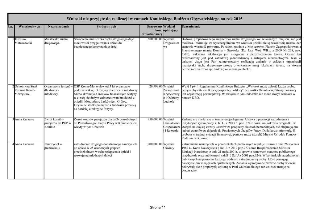 Wnioski nie przyjęte do realizacji w ramach Konińskiego Budżetu Obywatelskiego na rok 2015 Lp. Wnioskodawca Nazwa zadania Skrócony opis Szacowany Wydział koszt opiniujący wnioskodawcy 1 Jarosław Matuszewski Miasteczko ruchu drogowego. 2 Ochotnicza Straż Pożarna KoninMorzysław. Organizacja festynów OSP Konin-Morzysław od 5 lat organizuje dla dzieci i podczas wakacji 3 festyny dla dzieci i młodzieży. młodzieży. Mimo skromnych środków finansowych festyny te cieszą się dużym zainteresowaniem dzieci z osiedli: Morzysław, Laskówiec i Grójec. Uzyskane środki pieniężne z funduszu pozwolą na bardziej atrakcyjne festyny. 29,999.00 Wydział Zarządzania Kryzysoweg o i Ochrony Ludności 3 Anna Kurzawa Zwrot kosztów Zwrot kosztów przejazdu dla osób bezrobotnych przejazdu do PUP w do Powiatowego Urzędu Pracy w Koninie celem Koninie wizyty w tym Urzędzie 950,000.00 Wydział Działalności Gospodarcze j i Rozwoju 4 Anna Kurzawa Nauczyciel w przedszkolu Stworzenie miasteczka ruchu drogowego daje możliwości przygotowania dzieci do bezpiecznego korzystania z dróg. zatrudnienie drugiego-dodatkowego nauczyciela do opieki w 25 osobowych grupach przedszkolnych w celu polepszenia opieki i rozwoju najmłodszych dzieci Uzasadnienie 600 000,00 Wydział Budowa proponowanego miasteczka ruchu drogowego we wskazanym miejscu, nie jest Drogownict możliwa. Informuję, że wyszczególnione we wniosku działki nie są własnością miasta lecz wa stanowią własność prywatną. Ponadto, zgodnie z Miejscowym Planem Zagospodarowania Przestrzennego miasta Konina – Starówka (Dz. Urz. Woj. Wlkp. z 2009 Nr 208, poz. 3585), wskazana lokalizacja jest niezgodna z przeznaczeniem terenu. Obszar ten przeznaczony jest pod zabudowę jednorodzinną z usługami nieuciążliwymi. Jeśli w dalszym ciągu jest Pan zainteresowany realizacją zadania w zakresie organizacji miasteczka ruchu drogowego proszę o wskazanie innej lokalizacji terenu, na którym będzie można rozważyć budowę wskazanego obiektu. 1,200,000.00 Wydział Oświaty Strona 11 Wg § 3 pkt 1 Regulaminu Konińskiego Budżetu „Wniosek może zgłosić każda osoba, będąca obywatelem Rzeczypospolitej Polskiej”. Jednostka Ochotniczej Straży Pożarnej jest organizacją pozarządową. W związku z tym Jednostka nie może złożyć wniosku w ramach KBO. Zadanie nie mieści się w kompetencjach gminy. Ustawa o promocji zatrudnienia i instytucjach rynku pracy (Dz. U. z 2013 r., poz. 674 z późn. zm.) określa przypadki, w których należą się zwroty kosztów za przejazdy dla osób bezrobotnych, nie obejmują one jednak zwrotów za dojazdy do Powiatowych Urzędów Pracy. Dodatkowo informuję, iż osobom w trudnej sytuacji finansowej, pomocy może udzielić Miejski Ośrodek Pomocy Rodzinie w Koninie Zatrudnienie nauczycieli w przedszkolach publicznych reguluje ustawa z dnia 26 stycznia 1982 r.- Karta Nauczyciela ( Dz.U. z 2012 poz.977) oraz Rozporządzenie Ministra Edukacji Narodowej z dnia 21 maja 2001r. w sprawie ramowych statutów publicznego przedszkola oraz publicznych szkół ( Dz.U.z 2001 poz.624). W konińskich przedszkolach publicznych na poziomie każdego oddziału zatrudnione są osoby, które pomagają nauczycielom w zajęciach opiekuńczych. Zadania wykonywane przez te osoby w części pokrywają się z propozycją opisaną w Pani wniosku dlatego też wniosek uznaję za bezzasadny. 5 Przemysław Dudek Remont basenu Przywrócenie do stanu użyteczności basenu odkrytego w Koninie odkrytego 6 Tomasz Piaseczny Organizacja strefy ciszy i rekreacji na osiedli Chorzeń 7 Tomasz Piaseczny Zespół sportowy typu Dwa boiska sportowe, budynek sanitarno "Orlik" na osiedlu szatniowy, oświetlenie kompleksu Chorzeń (latem boisko - zimą lodowisko) 8 Wanda Majer Ścieżka rowerowa i ciąg pieszy wzdłuż ul. Kleczewskiej. Wykonanie ciągu pieszego wraz z alejkami spacerowymi wzdłuż magistrali kolejowej na osiedlu Chorzen Inwestycja ma dotyczyć odcinka ul. Kleczewskiej od ronda z ul. Paderewskiego do miejscowości Posada odcinek około 1,5 km z uwagi na duże natężenie ruchu. 500,000.00 Wydział Kultury, Sportu i Turystyki Odnowienie i rewitalizacja basenu odkrytego przy ul. Kurów w Koninie możliwa jest do realizacji po spełnieniu określonych warunków formalno – prawych oraz ekonomicznych, które wymagają wysokich nakładów finansowych związanych ze spełnieniem: warunków określonych w dokumencie pn. : „Ocena oddziaływania gospodarki wodno – ściekowej Kąpieliska Miejskiego w Koninie na środowisko” ; warunków określonych w decyzji Wojewody Wielkopolskiego z dn. 15.10.1999 r. „Ujęcie Kurów”, gdyż teren kąpieliska znajduję się w strefie ochronnej dla komunalnego ujęcia wody podziemnej dla miasta Konina .Ponadto eksploatacja kąpieliska musi być zgodna z warunkami zabudowy i gospodarowania terenu - brak możliwości rozbudowy infrastruktury drogowej – parkingi. Proponowana kwota 500.000,- zł jest niewystarczająca na realizację projektu. Koszt inwestycji wielokrotnie przewyższy proponowaną kwotę. Planując projekt należy mieć na uwadze w/w warunki niezbędne do spełnienia realizacji projektu oraz wysokie koszty inwestycji. 30,000.00 Wydział Pozytywne rozpatrzenie wniosku nie jest możliwe z uwagi na stan własności gruntów Gospodarki przyległych do magistrali kolejowej. Tereny proponowane pod wykonanie ciągu pieszego Nieruchomoś wraz z alejkami spacerowymi w większości nie są własnością Miasta Konina. ciami Łączny koszt Wydział 1000000,00 Kultury, KBO 350000 Sportu i Turystyki Na osiedlu „ Chorzeń” funkcjonują dwie szkoły. Szkoła Podstawowa z Oddziałami Integracyjnymi nr 9 oraz Gimnazjum nr 3. Obydwie jednostki posiadają rozbudowaną bazę sportową.Szkoła Podstawowa z Oddziałami Integracyjnymi nr 9 posiada dużą i małą salę gimnastyczną oraz salę lustrzaną. Dostępna jest również ścianka wspinaczkowa z której korzystają obydwie szkoły. Na zewnątrz 
