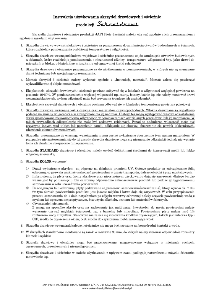Instrukcja użytkowania skrzydeł drzwiowych i ościeżnic produkcji Sekret drzwi Skrzydła drzwiowe i ościeżnice produkcji JAPI Piotr Jasiński należy używać zgodnie z ich przeznaczeniem i zgodnie z zasadami użytkowania. 1. Skrzydła drzwiowe wewnątrzlokalowe i ościeżnice są przeznaczone do zamknięcia otworów budowlanych w ścianach, które rozdzielają pomieszczenia o zbliżonej temperaturze i wilgotności. 2. Skrzydła drzwiowe wewnątrzlokalowe wejściowe i ościeżnice przeznaczone są do zamknięcia otworów budowlanych w ścianach, które rozdzielają pomieszczenia o nieznacznej różnicy temperatura wilgotności (np. jako drzwi do mieszkań w bloku, oddzielające mieszkanie od ogrzewanej klatki schodowej) 3. Skrzydła drzwiowe i ościeżnice przeznaczone są do użytkowania w pomieszczeniach, w których nie są wymagane drzwi techniczne lub specjalnego przeznaczenia. 4. Montaż skrzydeł i ościeżnic należy wykonać zgodnie z „Instrukcją montażu". Montaż zaleca się powierzyć wykwalifikowanej ekipie montażowej. 5. Eksploatacja, skrzydeł drzwiowych i ościeżnic powinna odbywać się w lokalach o wilgotności względnej powietrza na poziomie 40-60%. (W pomieszczeniach o większej wilgotności np. sauny, baseny, łaźnie itp. nie należy montować drzwi wewnątrzlokalowych, wyższa wilgotność może być przyczyną trwałego ich uszkodzenia). 6. Eksploatacja skrzydeł drzwiowych i ościeżnic powinna odbywać się w lokalach o temperaturze powietrza pokojowej 7. Skrzydło drzwiowe wykonane jest z drewna oraz materiałów drewnopochodnych. Włókna drewniane są wyjątkowo podatne na zmiany wilgotności a w szczególności na jej nadmiar. Dlatego też mogą występować czasowe odkształcenia drzwi spowodowane nierównomierną wilgotnością w pomieszczeniach oddzielanych przez drzwi lub jej nadmiarem. W takich przypadkach odkształcenie nie może być podstawą reklamacji. Ponad to nadmierna wilgotność może być przyczyną innych wad takich jak pęcznienie paneli, odklejanie się obrzeży, złuszczanie się powłok lakierniczych, rdzewienie elementów metalowych. 8. Skrzydła przeznaczone do własnego wykończenia musza zostać wykończone obustronnie tym samym materiałem. W przypadku nie zastosowania się do tej zasady skrzydła drzwiowe mogą się nieznacznie odkształcić jednak nie wpłynie to na ich działanie i bezpieczne funkcjonowanie. 9. Skrzydła STANDARD drzwiowe i ościeżnice należy czyścić delikatnymi środkami do konserwacji mebli lub lekko wilgotną ściereczką. 10. Skrzydła KOLOR wytyczne: 1) 2) 3) 4) Drzwi wykończone akrylem są odporne na działanie promieni UV. Gotowe produkty są zabezpieczone folią ochronną, co pozwala uniknąć uszkodzeń powierzchni w czasie transportu, dalszej obróbki i prac montażowych. Informujemy, że płyty oraz fronty akrylowe przy nieostrożnym użytkowaniu dają się zarysować, dlatego bardzo ważne jest by po usunięciu folii ochronnej odpowiednio zakonserwować produkt lub poddać go tygodniowemu sezonowaniu w celu utwardzenia powierzchni. Po ściągnięciu folii ochronnej, płyty poddawane są procesowi sezonowania(utwardzania), który wynosi ok. 7 dni (w tym okresie powierzchnia produktu jest jeszcze miękka i łatwo daje się zarysować). W celu przyspieszenia procesu sezonowania do 1 dnia natychmiast po zdjęciu warstwy ochronnej należy oczyścić powierzchnię wodą z mydłem lub sprayem antyseptycznym, bez użycia alkoholu, acetonu lub materiałów ściernych. Czyszczenie i pielęgnacja Z uwagi na specyfikę akrylu oraz na zachowanie jak najdłuższej żywotności, do mycia powierzchni należy wyłącznie używać miękkich ściereczek, np. z bawełny lub mikrofazy. Powierzchnie płyty należy myć 1% roztworem wody z mydłem. Stanowczo nie zaleca się stosowania środków czyszczących, takich jak: mleczka typu CIF, środki do czyszczenia okien, ocet, środki do czyszczenia mebli zawierające wosk. 11. Skrzydła drzwiowe wewnątrzlokalowe i ościeżnice nie mogą być narażone na bezpośredni kontakt z wodą. 12. W skrzydłach standardowo montowane są zamki o rozstawie 90 mm, do których należy stosować odpowiednie rozmiary klamek i szyldów 13. Skrzydła drzwiowe i ościeżnice mogą być przechowywane, magazynowane wyłącznie w miejscach suchych, ogrzewanych, przewiewnych i niezawilgoconych. 14. Skrzydła drzwiowe i ościeżnice w trakcie użytkowania z upływem czasu podlegają naturalnemu zużyciu: ścieranie, matowienie itp. JAPI PIOTR JASIŃSKI ul. TRANSPORTOWA 1/7, 70-715 SZCZECIN, tel./fax:+48 91 463 64 69 NIP: PL 8531333827 www.sekretdrzwi.pl [email protected]