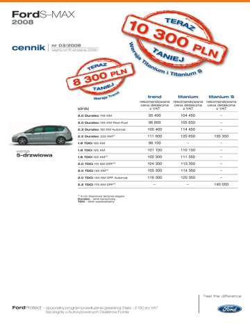 FordS–MAX 2008 We nr 03/2008 wa˝ny od 15 wrzeÊnia 2008 r. rs cennik ja Tre nd ni um i T it a n i u m S trend titanium titanium S rekomendowana cena detaliczna z VAT rekomendowana cena detaliczna z VAT 2.0 Duratec 145 KM 95 400 104 450 – 2.0 Duratec 145 KM Flexi–Fuel 96 600 105 650 – 2.3 Duratec 161 KM Automat 105 400 114 450 – 2.5 Duratec 220 KM(1) 111 600 120 650 135 350 1.8 TDCi 100 KM 96 100 – – 1.8 TDCi 125 KM 101 100 110 150 – 102 300 111 350 – 104 300 113 350 – 105 300 114 350 – 116 300 125 350 – – – 140 050 silniki 5-drzwiowa ta rekomendowana cena detaliczna z VAT W e r sja wersja Ti (1) 1.8 TDCi 125 KM 2.0 TDCi 115 KM DPF(1) (1) 2.0 TDCi 140 KM 2.0 TDCi 140 KM DPF Automat (1) 2.2 TDCi 175 KM DPF (1) 6-cio stopniowa skrzynia biegów Duratec - silnik benzynowy TDCi - silnik wysokopr´˝ny FordProtect – opcjonalny program przed∏u˝enia gwarancji 3 lata – 2 150 z∏ z VAT Szczegó∏y u Autoryzowanych Dealerów Forda FordS–MAX 2008 wyposa˝enie d mS um tren titani titaniu bezpieczeƒstwo Poduszki czo∏owe kierowcy i pasa˝era Poduszki boczne dla kierowcy i pasa˝era Boczne kurtyny powietrzne w 1 i 2 rz´dzie Poduszka powietrzna chroniàca kolana kierowcy ABS (z EBD) Uk∏ad IVD (ESP+TCS+EBA) Uk∏ad IVDC (ESP+TCS+EBA+CDC+HLA) i sportowe zawieszenie (niedost´pne z samopoziomujàcym zawieszeniem) Zaawansowany uk∏ad ESP (zawiera uk∏ad u∏atwiajàcy ruszanie z miejsca na wzniesieniach HLA) Przednie Êwiat∏a przeciwmgielne System awaryjnego hamowania System halogenowych reflektorów adaptacyjnych System statycznych ksenonowych reflektorów adaptacyjnych ze spryskiwaczami i automatycznà regulacjà kàta ustawienia Uk∏ad monitorowania ciÊnienia w ogumieniu Hamulec postojowy uruchamiany elektrycznie (EPB) komfort Wspomaganie kierownicy Kolumna kierownicy z regulacjà odleg∏oÊci i pochylenia Elektrycznie sterowane szyby przednich i tylnych drzwi Klimatyzacja dwustrefowa z automatycznà regulacjà temperatury Komputer pok∏adowy Lusterko wsteczne samoczynnie Êciemniajàce si´ Elektrycznie sterowane i podgrzewane lusterka boczne Elektrycznie sk∏adne lusterka boczne (w wersji trend z lampkami oÊwietlajàcymi pod∏o˝e) Dodatkowo przyciemniane szyby w tylnej cz´Êci pojazdu Podgrzewana przednia szyba „Quickclear” i podgrzewane dysze spryskiwaczy Spryskiwacze reflektorów Pilot parkowania – czujniki przeszkody przy parkowaniu (z przodu i z ty∏u) Skórzana kierownica Skórzana kierownica z czerwonymi przeszyciami Przednie fotele – podgrzewane, z regulacjà temperatury Przednie fotele – podgrzewane i wentylowane Przednie fotele w stylizacji sportowej Fotel kierowcy – regulacja podparcia odcinka l´dêwiowego Fotel kierowcy – elektryczna regulacja wysokoÊci Fotel kierowcy – pe∏na elektryczna regulacja po∏o˝enia Fotel kierowcy – pe∏na elektryczna regulacja z funkcjà pami´ci po∏o˝enia fotela i lusterek Fotel pasa˝era z przodu – regulacja podparcia odcinka l´dêwiowego Fotel pasa˝era z przodu – elektryczna regulacja wysokoÊci i regulacja podparcia odcinka l´dêwiowego Fotel pasa˝era z przodu – pe∏na elektryczna regulacja i regulacja podparcia odcinka l´dêwiowego Fotele 2 rz´du – trzy indywidualne fotele, sk∏adane na p∏asko; zag∏ówki z regulacjà wysokoÊci Fotele 3 rz´du – dwa indywidualne fotele, sk∏adane na p∏asko; zag∏ówki z regulacjà wysokoÊci Dach panoramiczny – nieotwierany, wraz z dwiema r´cznie rozsuwanymi roletami przeciws∏onecznymi i filtrem promieni podczerwonych Tempomat Inteligentny tempomat – system adaptacyjnej kontroli pr´dkoÊci (ACC) z funkcjà wczesnego ostrzegania (FA) i zaawansowanym uk∏adem ESP Inteligentny tempomat z uk∏adem IVDC Wycieraczki przedniej szyby – z czujnikiem deszczu i automatyczne reflektory Rolety przeciws∏oneczne – integralne, nad tylnymi drzwiami bocznymi Przednia szyba z filtrem przeciws∏onecznym Interfejs kierowcy FordConvers+ z kolorowym wyÊwietlaczem s s s s s s s s s s s s s s s s s s – 400 s s 2 500 4 400 400 s s 2 500 3 400 400 s s s 4 100 1 500 1 000 4 100 1 500 1 000 1 600 1 500 1 000 s s s s s 1 000(8) s 600 900(10) 900(10) 1 000 2 500(10) s – 1 200 – s s 400 1 950 2 850 200 950 1 950 s 3 700 s s s s s s s 400 900 s 1 000 2 500(11) s – 1 200 3 200 s s s 1 350 2 250(11) 200 950 1 950 s 3 700 s s s s s s s 400 900 s 1 000 2 500 – s 1 200 3 200 s s s 1 350 2 250 200 950 1 950 s 3 700 3 400 1 900 3 400 1 900 3 400 1 900 6 000 10 000 600(10) 400 1 250(8, 10) 2 100 6 000 10 000 s 400 s s 6 000 9 000 s 400 s s zabezpieczenia Nakr´tki kó∏ z blokadà zabezpieczajàcà (dost´pne tylko do obr´czy aluminiowych) 150 150 150 Centralny zamek sterowany pilotem, z dwuetapowym ryglowaniem 400 400 400 Autoalarm – obwodowy, chroniàcy szyby, drzwi i pokryw´ silnika (zawiera opcj´ centralnego zamka z dwuetapowym ryglowaniem) 1200 1 200 1 200 Autoalarm – obwodowy i pojemnoÊciowy, chroniàcy szyby, drzwi i pokryw´ silnika, reagujàcy na ruchy we wn´trzu (zawiera opcj´ centralnego zamka z dwuetapowym ryglowaniem) 1 800 1 800 1 800 s s s Drugi kluczyk z pilotem zdalnego sterowania (oba kluczyki sk∏adane) s – wyposa˝enie standardowe – – niedost´pne b/d – opcja bez dop∏aty (1) (2) (3) (4) (5) (6) (7) niedost´pne z systemem IVDC opcja zawiera dwustrefowà klimatyzacjà DEATC standard z silnikami 2.0 TDCi opcja dost´pna tylko z silnikiem wysokopr´˝nym opcja zawiera elektrycznie sterowane szyby tylnych drzwi opcja zawiera skórzanà kierownic´ opcja bez dop∏aty w wersji Titanium (8) (9) (10) (11) (12) opcja zawiera przednie wycieraczki z czujnikiem deszczu i automatyczne reflektory opcja zawiera uk∏ad monitorowania ciÊnienia w ogumieniu opcja niedost´pna w wersji Gold X opcja niedost´pna w wersji Platinium X opcja dost´pna tylko do wersji 5–miejscowej FordS–MAX 2008 wyposa˝enie d mS um tren titani titaniu stylizacja Lakier metalizowany Aluminiowe peda∏y Tylny spoiler ze Êw