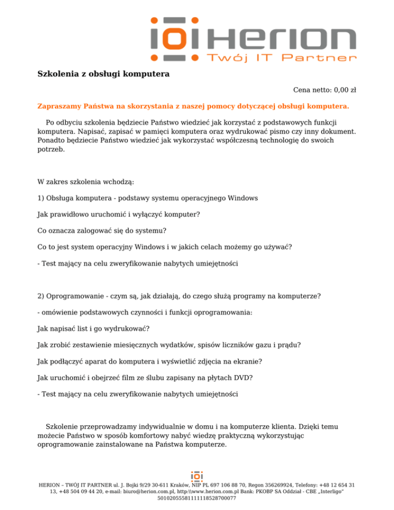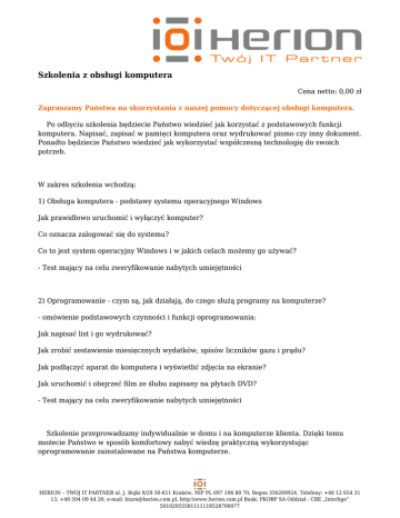 Szkolenia z obsługi komputera Cena netto: 0,00 zł Zapraszamy Państwa na skorzystania z naszej pomocy dotyczącej obsługi komputera. Po odbyciu szkolenia będziecie Państwo wiedzieć jak korzystać z podstawowych funkcji komputera. Napisać, zapisać w pamięci komputera oraz wydrukować pismo czy inny dokument. Ponadto będziecie Państwo wiedzieć jak wykorzystać współczesną technologię do swoich potrzeb. W zakres szkolenia wchodzą: 1) Obsługa komputera - podstawy systemu operacyjnego Windows Jak prawidłowo uruchomić i wyłączyć komputer? Co oznacza zalogować się do systemu? Co to jest system operacyjny Windows i w jakich celach możemy go używać? - Test mający na celu zweryfikowanie nabytych umiejętności 2) Oprogramowanie - czym są, jak działają, do czego służą programy na komputerze? - omówienie podstawowych czynności i funkcji oprogramowania: Jak napisać list i go wydrukować? Jak zrobić zestawienie miesięcznych wydatków, spisów liczników gazu i prądu? Jak podłączyć aparat do komputera i wyświetlić zdjęcia na ekranie? Jak uruchomić i obejrzeć film ze ślubu zapisany na płytach DVD? - Test mający na celu zweryfikowanie nabytych umiejętności Szkolenie przeprowadzamy indywidualnie w domu i na komputerze klienta. Dzięki temu możecie Państwo w sposób komfortowy nabyć wiedzę praktyczną wykorzystując oprogramowanie zainstalowane na Państwa komputerze. HERION – TWÓJ IT PARTNER ul. J. Bojki 9/29 30-611 Kraków, NIP PL 697 106 88 70, Regon 356269924, Telefony: +48 12 654 31 13, +48 504 09 44 20, e-mail: [email protected], http:\\www.herion.com.pl Bank: PKOBP SA Oddział - CBE „Interligo” 50102055581111118528700077 Zapraszamy do skorzystania z naszych usług :) W celu umówienia się ze szkoleniowcem proszę dzwonić na nr telefonu 504 09 44 20. HERION – TWÓJ IT PARTNER ul. J. Bojki 9/29 30-611 Kraków, NIP PL 697 106 88 70, Regon 356269924, Telefony: +48 12 654 31 13, +48 504 09 44 20, e-mail: [email protected], http:\\www.herion.com.pl Bank: PKOBP SA Oddział - CBE „Interligo” 50102055581111118528700077