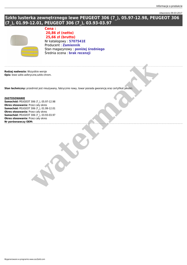 Informacje o produkcie Utworzono 09-03-2017 Szkło lusterka zewnętrznego lewe PEUGEOT 306 (7_), 05.97-12.98, PEUGEOT 306 (7_), 01.99-12.01, PEUGEOT 306 (7_), 03.93-03.97 Cena : 20,86 zł (netto) 25,66 zł (brutto) Rodzaj nadwozia: Wszystkie wersje Opis: lewe szkło asferyczne,szkło chrom. er m ar k Nr katalogowy : 5707541E Producent : Zamiennik Stan magazynowy : poniżej średniego Średnia ocena : brak recenzji Stan techniczny: przedmiot jest nieużywany, fabrycznie nowy, towar posiada gwarancję oraz certyfikat jakości. w at ZASTOSOWANIE Samochód: PEUGEOT 306 (7_), 05.97-12.98 Okres stosowania: Przez cały okres Samochód: PEUGEOT 306 (7_), 01.99-12.01 Okres stosowania: Przez cały okres Samochód: PEUGEOT 306 (7_), 03.93-03.97 Okres stosowania: Przez cały okres Nr porównawczy OEM: Wygenerowano w programie www.oscGold.com