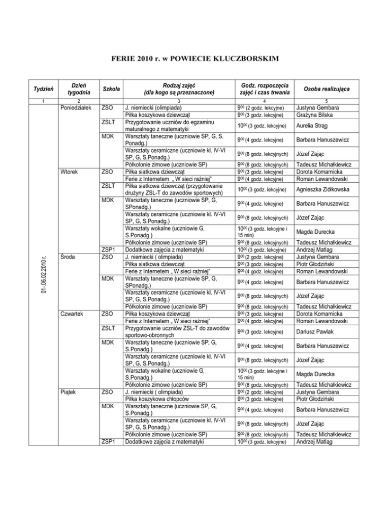 FERIE 2010 r. w POWIECIE KLUCZBORSKIM Tydzień Dzień tygodnia 1 Szkoła 2 Poniedziałek MDK ZSO ZSLT 01-.06.02.2010 r. MDK Środa ZSP1 ZSO MDK Czwartek ZSO ZSLT MDK Piątek Godz. rozpoczęcia zajęć i czas trwania 3 ZSO ZSLT Wtorek Rodzaj zajęć (dla kogo są przeznaczone) ZSO MDK ZSP1 J. niemiecki (olimpiada) Piłka koszykowa dziewcząt Przygotowanie uczniów do egzaminu maturalnego z matematyki Warsztaty taneczne (uczniowie SP, G, S. Ponadg.) Warsztaty ceramiczne (uczniowie kl. IV-VI SP, G, S.Ponadg.) Półkolonie zimowe (uczniowie SP) Piłka siatkowa dziewcząt Ferie z Internetem „ W sieci raźniej” Piłka siatkowa dziewcząt (przygotowanie drużyny ZSL-T do zawodów sportowych) Warsztaty taneczne (uczniowie SP, G, SPonadg.) Warsztaty ceramiczne (uczniowie kl. IV-VI SP, G, S.Ponadg.) Warsztaty wokalne (uczniowie G, S.Ponadg.) Półkolonie zimowe (uczniowie SP) Dodatkowe zajęcia z matematyki J. niemiecki ( olimpiada) Piłka siatkowa dziewcząt Ferie z Internetem „ W sieci raźniej” Warsztaty taneczne (uczniowie SP, G, SPonadg.) Warsztaty ceramiczne (uczniowie kl. IV-VI SP, G, S.Ponadg.) Półkolonie zimowe (uczniowie SP) Piłka koszykowa dziewcząt Ferie z Internetem „ W sieci raźniej” Przygotowanie uczniów ZSL-T do zawodów sportowo-obronnych Warsztaty taneczne (uczniowie SP, G, S.Ponadg.) Warsztaty ceramiczne (uczniowie kl. IV-VI SP, G, S.Ponadg.) Warsztaty wokalne (uczniowie G, S.Ponadg.) Półkolonie zimowe (uczniowie SP) J. niemiecki ( olimpiada) Piłka koszykowa chłopców Warsztaty taneczne (uczniowie SP, G, S.Ponadg.) Warsztaty ceramiczne (uczniowie kl. IV-VI SP, G, S.Ponadg.) Półkolonie zimowe (uczniowie SP) Dodatkowe zajęcia z matematyki Osoba realizująca 4 5 900 (2 godz. lekcyjne) 900 (3 godz. lekcyjne) Justyna Gembara Grażyna Bilska 1000 (3 godz. lekcyjne) Aurelia Strąg 900 (4 godz. lekcyjne) Barbara Hanuszewicz 900 (8 godz. lekcyjnych) Józef Zając 900 (8 godz. lekcyjnych) 900 (3 godz. lekcyjne) 900 (4 godz. lekcyjne) Tadeusz Michałkiewicz Dorota Komarnicka Roman Lewandowski 1000 (3 godz. lekcyjne) Agnieszka Ziółkowska 900 (4 godz. lekcyjne) Barbara Hanuszewicz 900 (8 godz. lekcyjnych) Józef Zając 1000 (3 godz. lekcyjne i 15 min) 900 (8 godz. lekcyjnych) 1000 (3 godz. lekcyjne) 900 (2 godz. lekcyjne) 900 (3 godz. lekcyjne) 900 (4 godz. lekcyjne) Magda Durecka Tadeusz Michałkiewicz Andrzej Matląg Justyna Gembara Piotr Głodziński Roman Lewandowski 900 (4 godz. lekcyjne) Barbara Hanuszewicz 900 (8 godz. lekcyjnych) Józef Zając 900 (8 godz. lekcyjnych) 900 (3 godz. lekcyjne) 900 (4 godz. lekcyjne) Tadeusz Michałkiewicz Dorota Komarnicka Roman Lewandowski 900 (3 godz. lekcyjne) Dariusz Pawlak 900 (4 godz. lekcyjne) Barbara Hanuszewicz 900 (8 godz. lekcyjnych) Józef Zając 1000 (3 godz. lekcyjne i 15 min) 900 (8 godz. lekcyjnych) 900 (2 godz. lekcyjne) 900 (3 godz. lekcyjne) Magda Durecka Tadeusz Michałkiewicz Justyna Gembara Piotr Głodziński 900 (4 godz. lekcyjne) Barbara Hanuszewicz 900 (8 godz. lekcyjnych) Józef Zając 900 (8 Tadeusz Michałkiewicz Andrzej Matląg godz. lekcyjnych) 1000 (3 godz. lekcyjne) Poniedziałek ZSO ZSLT MDK Wtorek ZSO 07-12.02.2010 r. ZSLT MDK Środa ZSO MDK Czwartek ZSP1 ZSO ZSLT MDK Piątek ZSO MDK ZSP1 J. niemiecki ( olimpiada) Halowa piłka nożna dziewcząt Piłka siatkowa Przygotowanie uczniów do egzaminu maturalnego z matematyki Warsztaty ceramiczne (uczniowie kl. IV-VI SP, G, S.Ponadg.) Półkolonie zimowe (uczniowie SP) Piłka siatkowa dziewcząt 900 (2 godz. lekcyjne) 900 (3 godz. lekcyjne) 1200 (3 godz. lekcyjne) Justyna Gembara Grażyna Bilska Anna Sielicka 1000 (3 godz. lekcyjne) Aurelia Strąg 900 (8 godz. lekcyjnych) Józef Zając 900 (8 godz. lekcyjnych) 900 (3 godz. lekcyjne) Tadeusz Michałkiewicz Renata Ząbczyk- Łysiak Halowa piłka nożna chłopców 1200 (2 godz. lekcyjne) Mariusz Łysiak 900 (2 godz. lekcyjne) Monika Nowak 1100 (1 godz. lekcyjna) Monika Nowak 1000 (3 godz. lekcyjne) Agnieszka Ziółkowska 900 (8 godz. lekcyjnych) Józef Zając Przygotowanie uczniów do egzaminu maturalnego z j. niemieckiego Przygotowanie uczniów do konkursu „Moja szkoła w Unii Europejskiej” Piłka siatkowa dziewcząt (przygotowanie drużyny ZSL-T do zawodów sportowych) Warsztaty ceramiczne (uczniowie kl. IV-VI SP, G, S.Ponadg.) Warsztaty wokalne (uczniowie G, S.Ponadg.) Półkolonie zimowe (uczniowie SP) J. niemiecki ( olimpiada) Turniej piłki koszykowej Gry i zabawy ruchowe Warsztaty ceramiczne (uczniowie kl. IV-VI SP, G, S.Ponadg.) Półkolonie zimowe (uczniowie SP) Zajęcia z piłki siatkowej Halowa piłka nożna Piłka siatkowa dziewcząt (przygotowanie drużyny ZSL-T do zawodów sportowych) Warsztaty ceramiczne (uczniowie kl. IV-VI SP, G, S.Ponadg.) Półkolonie zimowe (uczniowie SP) Gry i zabawy ruchowe Warsztaty ceramiczne (uczniowie kl. IV-VI SP, G, S.Ponadg.) Półkolonie zimowe (uczniowie SP) Dodatkowe zajęcia z j. polskiego 1000 (3 godz. lekcyjne i 15 min) 900 (8 godz. lekcyjnych) 900 (2 godz. lekcyjne) 800 (4 godz. lekcyjne) 1300 (2 godz. lekcyjne) Magda Durecka Tadeusz Michałkiewicz Justyna Gembara Andrzej Konwiński Anna Sielicka 900 (8 godz. lekcyjnych) Józef Zając 900 (8 900 (2 godz. lekcyjne) 900 (4 godz. lekcyjne) Tadeusz Michałkiewicz Aleksandra Kot Mariusz Łysiak 1000 (3 godz. lekcyjne) Agnieszka Ziółkowska 900 (8 godz. lekcyjnych) Józef Zając 900 (8 godz. lekcyjnych) 900 (3 godz. lekcyjne) Tadeusz Michałkiewicz Renata Ząbczyk- Łysiak 900 (8 godz. lekcyjnych) Józef Zając 900 (8 godz. lekcyjnych) 900 (4 godz. lekcyjne) Tadeusz Michałkiewicz Dorota Lewicka godz. lekcyjnych) ZSO – Zespół Szkół Ogólnokształcących w Kluczborku ZSP1 – Zespół Szkół Ponadgimnazjalnych nr 1 w Kluczborku ZSLT – Zespół Szkół Licealno-Technicznych w Kluczborku MDK – Młodzieżowy Dom Kultury w Kluczborku