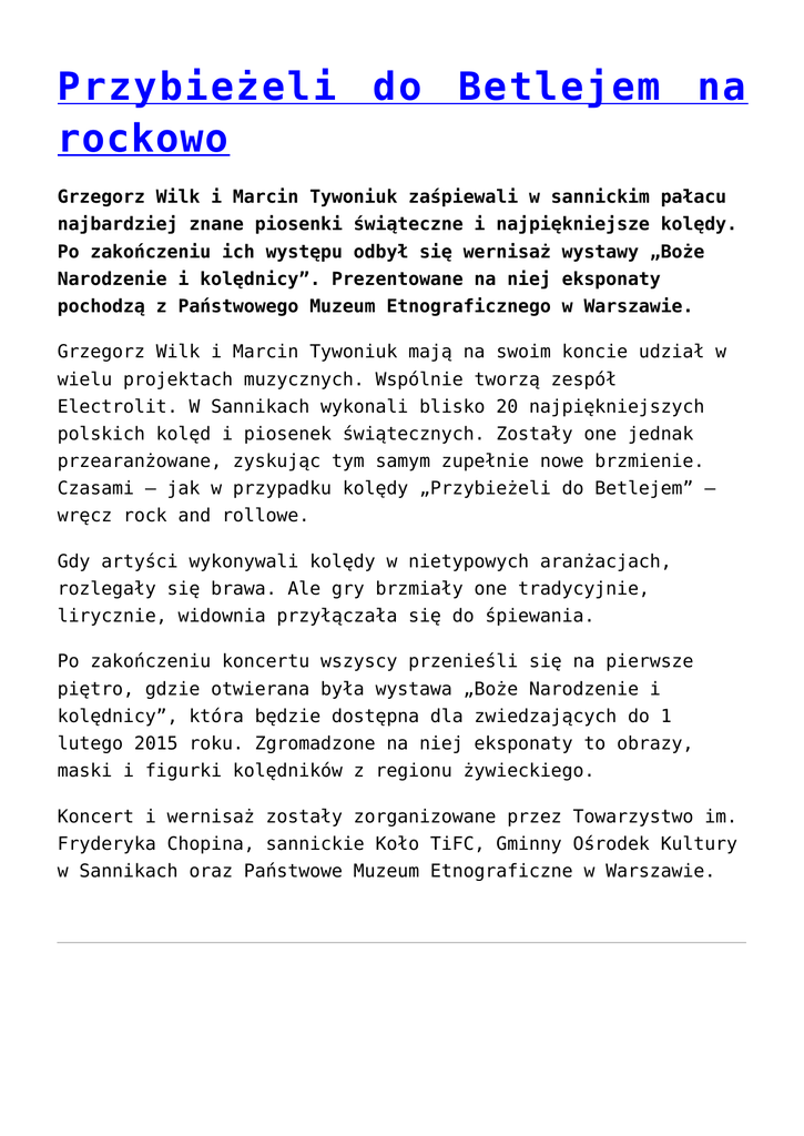 Przybieżeli do Betlejem na rockowo Grzegorz Wilk i Marcin Tywoniuk zaśpiewali w sannickim pałacu najbardziej znane piosenki świąteczne i najpiękniejsze kolędy. Po zakończeniu ich występu odbył się wernisaż wystawy „Boże Narodzenie i kolędnicy”. Prezentowane na niej eksponaty pochodzą z Państwowego Muzeum Etnograficznego w Warszawie. Grzegorz Wilk i Marcin Tywoniuk mają na swoim koncie udział w wielu projektach muzycznych. Wspólnie tworzą zespół Electrolit. W Sannikach wykonali blisko 20 najpiękniejszych polskich kolęd i piosenek świątecznych. Zostały one jednak przearanżowane, zyskując tym samym zupełnie nowe brzmienie. Czasami – jak w przypadku kolędy „Przybieżeli do Betlejem” – wręcz rock and rollowe. Gdy artyści wykonywali kolędy w nietypowych aranżacjach, rozlegały się brawa. Ale gry brzmiały one tradycyjnie, lirycznie, widownia przyłączała się do śpiewania. Po zakończeniu koncertu wszyscy przenieśli się na pierwsze piętro, gdzie otwierana była wystawa „Boże Narodzenie i kolędnicy”, która będzie dostępna dla zwiedzających do 1 lutego 2015 roku. Zgromadzone na niej eksponaty to obrazy, maski i figurki kolędników z regionu żywieckiego. Koncert i wernisaż zostały zorganizowane przez Towarzystwo im. Fryderyka Chopina, sannickie Koło TiFC, Gminny Ośrodek Kultury w Sannikach oraz Państwowe Muzeum Etnograficzne w Warszawie. Znamy wiceprezydenta pierwszego Roman Siemiątkowski został powołany na stanowisko zastępcy prezydenta płocka odpowiedzialnego za politykę społeczną. Jego miejsce w Radzie Miasta zajmie Artur Kras. Roman Siemiątkowski po raz pierwszy został wiceprezydentem Płocka już cztery lata temu. Gdy wybrano go na radnego, został urlopowany. Po objęciu swojej starej-nowej funkcji będzie musiał zrzec się swego mandatu, który trafi do Artura Krasa. Pierwszy z zastępców Andrzeja Nowakowskiego jest absolwentem częstochowskiej Wyższej Szkoły Pedagogicznej oraz Podyplomowego Studium Menedżerskiego przy Uniwersytecie Warszawskim, studiów podyplomowych w zakresie administracji oświatowej w SGH w Warszawie oraz studiów podyplomowych w zakresie polityki oświatowej i kształcenia kadr kierowniczych szkolnictwa przy UW. W 1981 roku podjął swoją pierwszą pracę – w Państwowym Domu Dziecka w Lucieniu (jako wychowawca) i w Szkole Podstawowej nr 15 w Płocku (jako nauczyciel). Pracował w wydziale oświaty Urzędu Miasta Płocka, był wizytatorem, a później dyrektorem wydziału kadr i organizacji kuratorium oświaty w Płocku. Od 1 lipca 1999 roku był kanclerzem Państwowej Wyższej Szkoły Zawodowej w Płocku. W 2010 roku był przez kilka miesięcy komisarzem gminy Brudzeń Duży. Wpadka złodzieja przewodów Policjanci z Wyszogrodu zatrzymali mężczyznę kradnącego na budowach przewody elektryczne. W jego domu znalezione zostały otuliny przewodów miedzianych. W nocy z 7 na 8 grudnia wyrwane zostały deski zabezpieczające okno rozbudowywanego domu. Kiedy na miejsce zdarzenia przybyli policjanci, okazało się, że na ziemi leżą przygotowane do kradzieży przewody elektryczne. Funkcjonariusze prowadząc ustalenia w tej sprawie, dotarli do domu mieszkającego w Wyszogrodzie 51-latka. Po przeszukaniu ujawnili znajdujące się tam puste otuliny przewodów elektrycznych. Pochodziły one z kradzieży przewodów, do której doszło w tym samym domu pod koniec listopada. Mężczyzna został zatrzymany w policyjnym areszcie, a policjanci sprawdzają, czy może on mieć związek z innymi zgłaszanymi kradzieżami. 51-latek z Wyszogrodu będzie odpowiadał za kradzież i za uszkodzenie mienia. Może spędzić za kratkami nawet pięć lat. Sprawdź, jak postrzegamy mieszkańców Afryki? Jak Polacy postrzegają mieszkańców Afryki? Co Afrykanie sami mówią na swój temat? Jak działa internetowe radio dla imigrantów? Na te i inne pytania odpowie we wtork, 9 grudnia Mamadou Diouf z Fundacji Afryka Inaczej. We wtorek, 9 grudnia o 16.00 przy ulicy Tumskiej 13 odbędzie się spotkanie z Mamadou Dioufem poświęcone aktywności społeczności lokalnej oraz aktywizacji imigrantów i ich partycypacji (na przykładzie społeczności afrykańskiej). Prowadzona przez Mamadou Dioufa Fundacja Afryka Inaczej rok temu zakończyła projekt, którego celem była aktywizacja społeczności afrykańskiej mieszkającej w Trójmieście, Poznaniu, Łodzi, Wrocławiu i Krakowie. Inicjatorzy projekty spotykali się z przedstawicielami lokalnych władz, służbami mundurowymi, lokalnymi mediami oraz organizacjami pozarządowymi, które pracują na rzecz cudzoziemców. Podczas spotkania w Płocku Mamadou Diouf spróbuje podsumować wyniki projektu, który prowadzony był w formie warsztatów.