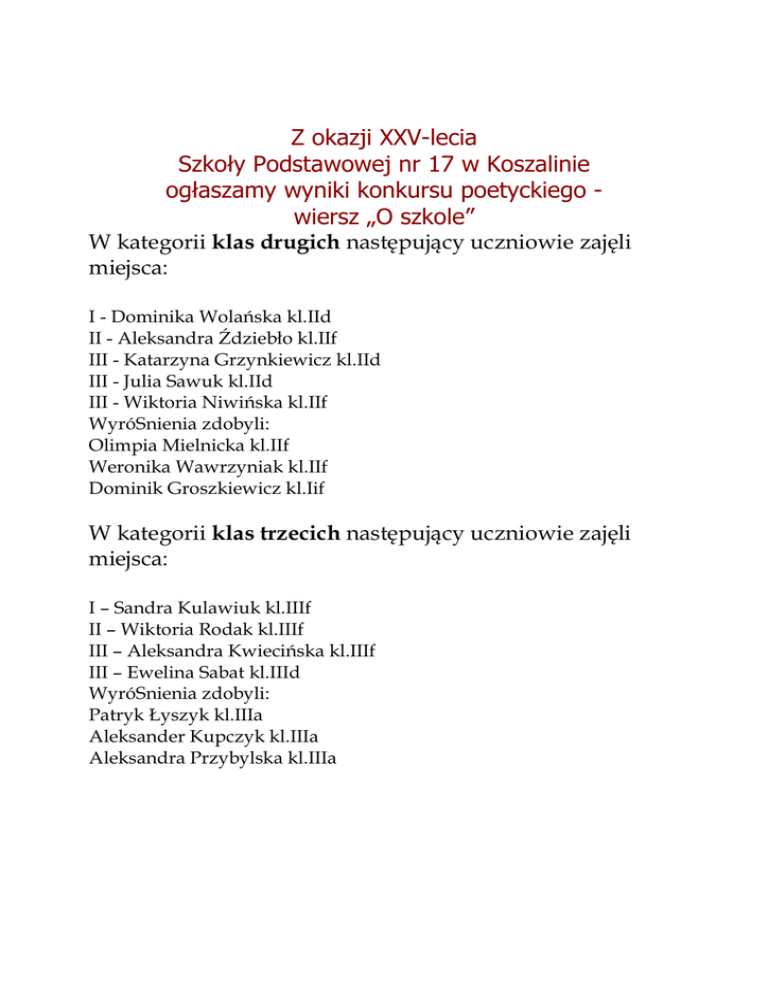Z okazji XXV-lecia Szkoły Podstawowej nr 17 w Koszalinie ogłaszamy wyniki konkursu poetyckiego wiersz „O szkole” W kategorii klas drugich następujący uczniowie zajęli miejsca: I - Dominika Wolańska kl.IId II - Aleksandra Ździebło kl.IIf III - Katarzyna Grzynkiewicz kl.IId III - Julia Sawuk kl.IId III - Wiktoria Niwińska kl.IIf WyróSnienia zdobyli: Olimpia Mielnicka kl.IIf Weronika Wawrzyniak kl.IIf Dominik Groszkiewicz kl.Iif W kategorii klas trzecich następujący uczniowie zajęli miejsca: I – Sandra Kulawiuk kl.IIIf II – Wiktoria Rodak kl.IIIf III – Aleksandra Kwiecińska kl.IIIf III – Ewelina Sabat kl.IIId WyróSnienia zdobyli: Patryk Łyszyk kl.IIIa Aleksander Kupczyk kl.IIIa Aleksandra Przybylska kl.IIIa