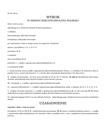 IX GC 28/12 WYROK W IMIENIU RZECZYPOSPOLITEJ POLSKIEJ Dnia 7 marca 2014r. Sąd Okręgowy w Krakowie Wydział IX Sąd Gospodarczy, w składzie: Przewodniczący: SSO Paweł Czepiel Protokolant: Aleksander Powroźnik po rozpoznaniu w dniu 21 lutego 2014r. na rozprawie w Krakowie sprawy z powództwa: J. P., Ł. P.i T. S. przeciwko: M. B. o ustalenie oraz z powództwa M. B. przeciwko (...) spółce z ograniczoną odpowiedzialnością w K. o rozwiązanie spółki I. ustala istnienie umowy spółki z ograniczoną odpowiedzialnością pod firmą (...) z siedzibą w K. zawartej w dniu 21 grudnia 2010 r. przed notariuszem Z. T. w formie aktu notarialnego Repertorium A Nr 9641/2010, II. zasądza od pozwanego M. B.na rzecz powodów J. P., Ł. P., T. S.kwotę 26 286 zł (dwadzieścia sześć tysięcy dwieście osiemdziesiąt sześć złotych) tytułem zwrotu kosztów procesu, III. rozwiązuje (...) spółkę z ograniczoną odpowiedzialnością w K., IV. ustanawia likwidatorów (...) spółki z ograniczoną odpowiedzialnością w K. w osobach: M. B., J. P., Ł. P., T. S., V. zasądza od strony pozwanej (...) spółki z ograniczoną odpowiedzialnością w K. na rzecz powoda M. B. kwotę 2737 zł (dwa tysiące siedemset trzydzieści siedem złotych) tytułem zwrotu kosztów procesu, VI. nakazuje ściągnąć od M. B. na rzecz Skarbu Państwa – Sądu Okręgowego w Krakowie kwotę 140 zł (sto czterdzieści złotych UZASADNIENIE wyroku z dnia 7 marca 2014r. Powodowie J. P., Ł. P.i T. S. wnieśli przeciwko pozwanemu M. B. pozew o ustalenie istnienia umowy (...) spółki z ograniczoną odpowiedzialnością w K. zawartej w dniu 21 grudnia 2010 r. oraz o zasądzenie od pozwanego kosztów procesu. Na uzasadnienie roszczenia wskazali, iż 21 grudnia 2010r. powodowie i pozwany zawarli umowę spółki z o.o. pod firmą (...) (dalej w uzasadnieniu – spółka (...)). Wspólnicy wnieśli tytułem aportu przysługujące im udziały w (...) spółce z ograniczoną odpowiedzialnością (dalej w uzasadnieniu – spółka (...)). W dniu 2 marca 2011 r. pozwany oświadczył, że uchyla się od skutków prawnych oświadczenia woli, które złożył zawierając umowę spółki (...), powołując się na błąd „co do rzeczywistej wartości udziału oraz intencji pozostałych stron umowy”. W dniu 7 marca 2011r. pozwany złożył oświadczenie na Nadzwyczajnym Zgromadzeniem Wspólników spółki (...), zakwestionował ważność Zgromadzenia i zażądał zaprotokołowania sprzeciwu. Nastąpiło to jeszcze przed rejestracją spółki. Pozwany skierował do sądu rejestrowego pismo z oświadczeniem o cofnięciu wniosku o rejestrację spółki, powołując się na oświadczenie o uchyleniu się od skutków oświadczenia woli w przedmiocie zawarcia umowy spółki. Zarząd spółki sprzeciwił się wnioskowi i wskazał na brak upoważnienia pozwanego do cofnięcia wniosku. Sąd rejestrowy wpisał spółkę do rejestru przedsiębiorców. Powodowie uznają ww. oświadczenie pozwanego za nieskuteczne, gdyż nie zaistniały przewidziane prawem przesłanki jego skuteczności. Pozwany kooperował przy zakładaniu spółki, pełnił znaczącą rolę przy procesie jej powstawania oraz dysponował pełną wiedzą na temat celów założenia spółki. Powodowie wskazali na podłoże faktyczne złożenia oświadczenia woli pozwanego o uchylenie się od skutków prawnych oświadczenia woli.Pozwany był wspólnikiem i członkiem zarządu spółki (...),w której pełnił rolę organizatora administracyjnego spółki, nadzorował jej sprawy finansowe i stan środków finansowych w kasie. Posiadał do wyłącznej dyspozycji kartę bankomatową umożliwiającą bezpośredni dostęp do konta firmowego spółki (...). Od stycznia 2011 r. ww. obowiązki pozwanego przejęła A. L., która w lutym 2011r. stwierdziła nieprawidłowości w stanie finansów spółki, o czym poinformowała zarząd. O wyjaśnienie poproszono M. J., bezpośrednio odpowiedzialną za prowadzenie kasy spółki, która wyjaśniła, że do kasy nie wpływają wszystkie pieniądze wypłacane przez pozwanego z bankomatu, a do spółki nie wpływają żadne rachunki czy faktury, które dokumentowałyby wydatki na rzecz spółki (...) związane z sumami wypłaconymi przez pozwanego. Pozwany,przełożony M. J.,nakazał jej sporządzanie dokumentacji finansowej tak, aby braki nie były widoczne. Na polecenie zarządu spółki N. M. J. po wykryciu nieprawidłowości związanych z raportami kasowymi dokonała korekty rozliczeń wprowadzając do nich tylko te kwoty, które pozwany rzeczywiście wpłacił do kasy spółki. W wyniku rozliczeń ustalono, że pozwany nie zwrócił z pobranych z kasy spółki (...) środki w łącznej kwocie 84 900 zł. Pozwany przyznał fakt zatrzymania środków pieniężnych spółki (...) podczas rozmów z powodem J. P. i w korespondencji mailowej z członkami zarządu spółki (...), jednocześnie oświadczając, iż brakujące pieniądze zwróci. Pozwany nie zwrócił kwot, a spółka (...) złożyła przeciw niemu pozew o zapłatę. Pozwany podjął kroki, by zbyć swoje udziały w spółce (...), a nadto skorzystał ze swoich uprawnień kontrolnych jako wspólnika. Powodowie podnieśli, że brak jest podstaw do uznania, że zawierając umowę spółki pozwany działał pod wpływem prawnie istotnego błędu, a dalsze jego działania uzasadniają pogląd, iż on sam uznawał swoje oświadczenie w tym przedmiocie za nieskuteczne. Uznanie oświadczenia o uchylenia się od skutków prawnych oświadczenia woli spowodowałoby nieważność umowy spółki ex tunc, co oznaczałoby, iż nie doszło do skutecznego wniesienia do spółki aportów w postaci udziałów w spółce (...), a zatem wspólnikami tej spółki nadal byliby powodowie i pozwany. Wobec powyższego złożenie przez pozwanego oświadczenia powoduje istotną niepewność stosunków prawnych, przy czym dotyczy to samego bytu spółki (...). Powodowie mają interes prawny w ustaleniu is