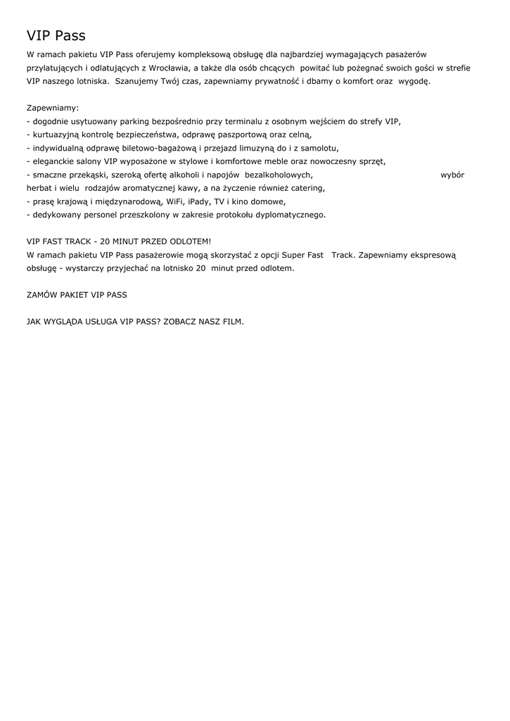 VIP Pass W ramach pakietu VIP Pass oferujemy kompleksową obsługę dla najbardziej wymagających pasażerów przylatujących i odlatujących z Wrocławia, a także dla osób chcących powitać lub pożegnać swoich gości w strefie VIP naszego lotniska. Szanujemy Twój czas, zapewniamy prywatność i dbamy o komfort oraz wygodę. Zapewniamy: - dogodnie usytuowany parking bezpośrednio przy terminalu z osobnym wejściem do strefy VIP, - kurtuazyjną kontrolę bezpieczeństwa, odprawę paszportową oraz celną, - indywidualną odprawę biletowo-bagażową i przejazd limuzyną do i z samolotu, - eleganckie salony VIP wyposażone w stylowe i komfortowe meble oraz nowoczesny sprzęt, - smaczne przekąski, szeroką ofertę alkoholi i napojów bezalkoholowych, wybór herbat i wielu rodzajów aromatycznej kawy, a na życzenie również catering, - prasę krajową i międzynarodową, WiFi, iPady, TV i kino domowe, - dedykowany personel przeszkolony w zakresie protokołu dyplomatycznego. VIP FAST TRACK - 20 MINUT PRZED ODLOTEM! W ramach pakietu VIP Pass pasażerowie mogą skorzystać z opcji Super Fast obsługę - wystarczy przyjechać na lotnisko 20 minut przed odlotem. ZAMÓW PAKIET VIP PASS JAK WYGLĄDA USŁUGA VIP PASS? ZOBACZ NASZ FILM. Track. Zapewniamy ekspresową