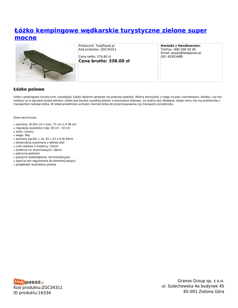 Łóżko kempingowe wędkarskie turystyczne zielone super mocne Producent: TwójPasaż.pl Kod produktu: ZGC34311 Cena netto: 274,80 zł Kontakt z Handlowcem: Tel/Fax: (68) 506 50 56 Email: [email protected] GG: 45303488 Cena brutto: 338.00 zł Łóżko polowe Łóżko campingowe turystyczne, kanadyjka. Łóżko idealnie sprawdzi się podczas podróży. Można skorzystać z niego na polu namiotowym, biwaku, czy też rozłożyć je w ogrodzie przed domem. Łóżko jest bardzo wysokiej jakości o konstrukcji stalowej. Co ważne jest składane, dzięki temu nie ma problemów z transportem takiego łóżka. W skład przedmiotu wchodzi również torba do przechowywania czy transportu przedmiotu. Dane techniczne: ● ● ● ● ● ● ● ● ● ● ● ● wymiary: dł.201 cm x szer. 71 cm x H 38 cm regulacja wysokości nóg: 30 cm - 42 cm kolor: zielony waga: 9kg wymiary paczki: L ok. 81 x 21 x H W 83cm konstrukcja wykonana z lekkiej stali rurki stalowe o średnicy: 22mm średnica rur aluminiowych: 18mm pokrycie:poliester poszycie wodoodporne, termoizolacyjne oparcie jest regulowane do dowolnej pozycji podgłówek wyściełany pianką Kod produktu:ZGC34311 ID produktu:16334 Granos Group sp. z o.o. ul. Sulechowska 4a budynek 45 65-001 Zielona Góra