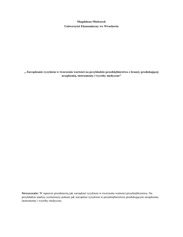 Magdalena Mielcarek Uniwersytet Ekonomiczny we Wrocławiu „ Zarządzanie ryzykiem w tworzeniu wartości na przykładzie przedsiębiorstwa z branży produkującej urządzenia, instrumenty i wyroby medyczne” Streszczenie: W raporcie przedstawię jak zarządzać ryzykiem w tworzeniu wartości przedsiębiorstwa. Na przykładzie analizy scenariuszy pokaże jak zarządzać ryzykiem w przedsiębiorstwie produkującym urządzenia, instrumenty i wyroby medyczne. Wstęp Ryzyko rozumiane neutralnie oznacza możliwość nieuzyskania oczekiwanego efektu. Zarządzanie ryzykiem podmiotu jest to podejmowanie decyzji i realizacja działań, które prowadzą do osiągnięcia akceptowalnego poziomu ryzyka. Analiza scenariuszy pośrednio uwzględnia ryzyko i służy do analizowania ryzyka podczas zarządzanie wartością przedsiębiorstwa. Przedsiębiorstwo dla którego przeprowadzam analizę scenariusz jest producentem narzędzi o światowych parametrach jakościowych oraz dystrybutorem szerokiej gamy narzędzi medycznych. Analiza scenariuszy Analizę scenariuszy przeprowadzę dla trzech wariantów: Bazowego Optymistycznego Pesymistycznego Obliczeń dokonam na podstawie danych otrzymanych ze sprawozdań finansowych firmy. Średni ważony koszt kapitału (WACC) dla każdego wariantu będzie wynosił 12,67%. Prawdopodobieństwo wystąpienia scenariusz bazowego to 70%, optymistycznego 10%, a pesymistycznego 20%. 1) SCENARIUSZ BAZOWY Założenia: W roku X przychody są o 20% większe niż w roku 2011, koszty są o 5% większe. NWC stanowi 15% przychodów w roku X. Tabela nr 1 Scenariusz bazowy CR CE NCE EBIT NOPAT NCE ∆NWC CAPEX FCF 2010 491 734 164,23 438 338 134,04 10 816 641,82 42 579 388,37 34 489 304,58 10 816 641,82 84 771 167,64 27 264 543,67 -66 729 764,91 2011 522 539 152,83 473 156 870,90 11 969 793,11 37 412 488,82 30 304 115,94 11 969 793,11 7 389 728,40 22 596 983,93 12 287 196,72 X 627 046 983,40 496 814 714,45 12 568 282,77 117 663 986,19 95 307 828,81 12 568 282,77 1 896 151,47 0,00 105 979 960,11 NWC ∆NWC 2010 84 771 167,64 84 771 167,64 2011 92 160 896,04 7 389 728,40 X 94 057 047,51 1 896 151,47 Źródło: Opracowanie własne na podstawie: Michalski, Grzegorz Marek, Paradoks Cyklu Operacyjnego (February 23, 2013). Available at SSRN: http://ssrn.com/abstract=2223245 2) SCENARIUSZ OPTYMISTYCZNY Założenia: Przychody są o 20% w stosunku do wariantu bazowego. Przyrost kapitału pracującego netto jest o 10% w stosunku do okresu bazowego. Tabela nr 2 Scenariusz optymistyczny CR CE NCE EBIT NOPAT NCE ∆NWC CAPEX FCF 2010 590 080 997,08 438 338 134,04 10 816 641,82 140 926 221,22 114 150 239,18 10 816 641,82 76 294 050,88 27 264 543,67 21 408 286,46 2011 627 046 983,40 473 156 870,90 11 969 793,11 141 920 319,39 114 955 458,70 11 969 793,11 6 650 755,56 22 596 983,93 97 677 512,32 X 752 456 380,08 496 814 714,45 12 568 282,77 243 073 382,86 196 889 440,12 12 568 282,77 1 706 536,32 0,00 207 751 186,56 Źródło: Opracowanie własne na podstawie: Michalski, Grzegorz Marek, Paradoks Cyklu Operacyjnego (February 23, 2013). Available at SSRN: http://ssrn.com/abstract=2223245 3) SCENARIUSZ PESYMISTYCZNY Założenia: Przychody maleją o 10% w stosunku do przychodów scenariusz bazowego. Przyrost kapitału pracującego netto i koszty wydatkowe zwiększają się o 5% w stosunku do scenariusza bazowego. Tabela nr 3 Scenariusz pesymistyczny 2 010,00 442 560 747,81 CR 460 255 040,74 CE 10 816 641,82 NCE -28 510 934,76 EBIT -23 093 857,15 NOPAT 10 816 641,82 NCE 89 009 726,02 ∆NWC 27 264 543,67 CAPEX -128 551 485,02 FCF 2 011,00 470 285 237,55 496 814 714,45 11 969 793,11 -38 499 270,01 -31 184 408,71 11 969 793,11 7 759 214,82 22 596 983,93 -49 570 814,35 X 564 342 285,06 521 655 450,17 12 568 282,77 30 118 552,12 24 396 027,22 12 568 282,77 1 990 959,04 0,00 34 973 350,94 Źródło: Opracowanie własne na podstawie: Michalski, Grzegorz Marek, Paradoks Cyklu Operacyjnego (February 23, 2013). Available at SSRN: http://ssrn.com/abstract=2223245 W tabeli poniżej zaprezentuje wartości NPV i IRR dla każdego z wariantów. Do obliczeń przyjmę średni ważony koszt kapitału na poziomie 12,67%. Tabela nr 4 Wartość NPV dla każdego z wariantów NPV OPTYMISTYCZNY BAZOWY PESYMISTYCZNY 271 755 851,30 92 823 580,25 -144 998 007,57 Źródło: Opracowanie własne na podstawie: : Michalski, Grzegorz Marek, Paradoks Cyklu Operacyjnego (February 23, 2013). Available at SSRN: http://ssrn.com/abstract=2223245 W tabeli powyżej widzimy, że opłaca się realizować wariant optymistyczny i bazowy ponieważ NPV>0, natomiast realizacja scenariusza pesymistycznego nie jest korzystna, ponieważ NPV<0. Do obliczenia wskaźnika E(NPV) skorzystałam z następującego wzoru: Wzór nr 1 Wzór na wartość E(NPV) E(NPV) = po x NPVo + pb x NPVb + pp x NPVp Objaśnienie: E(NPV) – ekonomiczna wartość bieżąca projektu po – prawdopodobieństwo wystąpienia wariantu optymistycznego pb – prawdopodobieństwo wystąpienia wariantu bazowego pp - prawdopodobieństwo wystąpienia wariantu pesymistycznego NPVo - wartość bieżąca netto scenariusza optymistycznego NPVb - wartość bieżąca netto scenariusza bazowego NPVp - wartość bieżąca netto scenariusza pesymistycznego Po podstawieniu do wzoru wartość E(NPV) wynosi 63152489,79 co oznacza, że wartość bieżąca korzyści jest większa niż wartość bieżąca kosztów. Projekt jest korzystny. Podsumowanie: Analiza scenariuszy jest pomocna w ocenie sytuacji, pokazuje jak może zmienić się wartość NPV gdy np. zwiększają się koszty lub maleją przychody. Przeprowadzając analizę scenariuszy łatwiej będzie wiedzieli jakiego ryzyka możemy się spodziewać. Analizowany przeze mnie projekt jest korzystny ponieważ NPV> 0. Największą wartość NPV ma wariant optymistyczny, ale jego prawdopodobieństwo wystąpienia jest bardzo małe. Podejmując decyzje najlepiej wybrać scenariusz bazowy ponieważ prawdopodobieństwo wystąpienia jest duże i NPV>0. Spis li