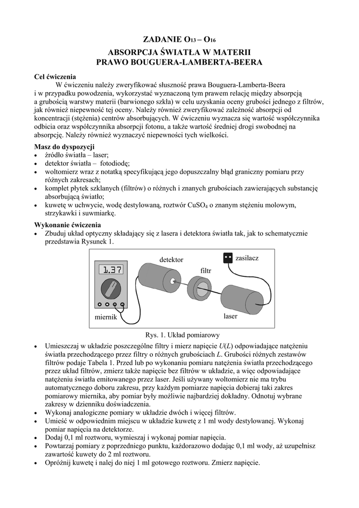 ZADANIE O13 – O16 ABSORPCJA ŚWIATŁA W MATERII PRAWO BOUGUERA-LAMBERTA-BEERA Cel ćwiczenia W ćwiczeniu należy zweryfikować słuszność prawa Bouguera-Lamberta-Beera i w przypadku powodzenia, wykorzystać wyznaczoną tym prawem relację między absorpcją a grubością warstwy materii (barwionego szkła) w celu uzyskania oceny grubości jednego z filtrów, jak również niepewność tej oceny. Należy również zweryfikować zależność absorpcji od koncentracji (stężenia) centrów absorbujących. W ćwiczeniu wyznacza się wartość współczynnika odbicia oraz współczynnika absorpcji fotonu, a także wartość średniej drogi swobodnej na absorpcję. Należy również wyznaczyć niepewności tych wielkości. Masz do dyspozycji źródło światła – laser; detektor światła – fotodiodę; woltomierz wraz z notatką specyfikującą jego dopuszczalny błąd graniczny pomiaru przy różnych zakresach; komplet płytek szklanych (filtrów) o różnych i znanych grubościach zawierających substancję absorbującą światło; kuwetę w uchwycie, wodę destylowaną, roztwór CuSO4 o znanym stężeniu molowym, strzykawki i suwmiarkę. Wykonanie ćwiczenia Zbuduj układ optyczny składający się z lasera i detektora światła tak, jak to schematycznie przedstawia Rysunek 1. zasilacz detektor filtr laser miernik Rys. 1. Układ pomiarowy Umieszczaj w układzie poszczególne filtry i mierz napięcie U(L) odpowiadające natężeniu światła przechodzącego przez filtry o różnych grubościach L. Grubości różnych zestawów filtrów podaje Tabela 1. Przed lub po wykonaniu pomiaru natężenia światła przechodzącego przez układ filtrów, zmierz także napięcie bez filtrów w układzie, a więc odpowiadające natężeniu światła emitowanego przez laser. Jeśli używany woltomierz nie ma trybu automatycznego doboru zakresu, przy każdym pomiarze napięcia dobieraj taki zakres pomiarowy miernika, aby pomiar były możliwie najbardziej dokładny. Odnotuj wybrane zakresy w dzienniku doświadczenia. Wykonaj analogiczne pomiary w układzie dwóch i więcej filtrów. Umieść w odpowiednim miejscu w układzie kuwetę z 1 ml wody destylowanej. Wykonaj pomiar napięcia na detektorze. Dodaj 0,1 ml roztworu, wymieszaj i wykonaj pomiar napięcia. Powtarzaj pomiary z poprzedniego punktu, każdorazowo dodając 0,1 ml wody, aż uzupełnisz zawartość kuwety do 2 ml roztworu. Opróżnij kuwetę i nalej do niej 1 ml gotowego roztworu. Zmierz napięcie. ABSORPCJA ŚWIATŁA W MATERII – PRAWO BOUGUERA-LAMBERTA-BEERA Zestaw A B C D E Tabela 1. Grubości filtrów w zestawach Numer i grubość filtru w zestawie [mm] 1 2 3 4 5 1,040 2,510 3,876 4,832 6,577 1,025 2,507 3,883 4,821 6,575 1,036 2,502 3,876 4,822 6,575 1,049 2,512 3,873 4,839 6,574 1,032 2,506 3,863 4,836 6,540 2 6 7,704 7,706 7,701 7,703 7,699 Dodaj 0,2 ml wody destylowanej, wymieszaj roztwór i zmierz napięcie. Powtarzaj pomiary z poprzedniego punktu, każdorazowo dodając 0,2 ml wody, aż uzupełnisz zawartość kuwety do 2 ml roztworu. Pamiętaj, aby nie mieszać strzykawek: wodę destylowaną i roztwór siarczanu miedzi nabieraj oddzielnymi strzykawkami. W celu wizualnego sprawdzenia poprawności swych pomiarów wykonuj, na bieżąco, w odpowiednich współrzędnych, wykres transmisji w zależności od grubości filtru i od stężenia roztworu – przy obliczaniu stężenia roztworu w kuwecie pamiętaj o zmianie objętości. Taki wykres pozwala na szybką kontrolę poprawności otrzymanych wyników. Właściwy wybór układu współrzędnych pozwala na przedstawienie nieliniowej zależności w postaci zależności liniowej. I tak najczęściej stosuje się dwa rodzaje układów: układ półlogarytmiczny i układ logarytmiczny. W tym pierwszym kształt prostej mają zależności wykładnicze, zaś w tym drugim zależności potęgowe. Odpowiedni papier otrzymasz w sekretariacie Pracowni. Literatura przedmiotu J. Ginter, Fizyka fal – Fale w ośrodkach jednorodnych, Fale w ośrodkach niejednorodnych, Wydawnictwo Naukowe PWN, Warszawa, 1993; D.J. Griffiths, Podstawy elektrodynamiki, Wydawnictwo Naukowe PWN, Warszawa, 2001; Sz. Szczeniowski, Fizyka doświadczalna, cz. V, Fizyka atomowa, PWN, Warszawa, 1967, s. 28, J.R. Meyer-Arendt, Wstęp do optyki, PWN, Warszawa, 1977, s. 396, B. Jaworski i A. Dietłaf, Kurs fizyki, tom 3, Procesy falowe, optyka, fizyka atomowa i jądrowa, PWN, Warszawa, 1981, s. 469, Encyklopedia fizyki, PWN, Warszawa, 1972, hasła: absorpcja światła, absorpcji funkcji, absorpcji współczynnik, Encyklopedia fizyki współczesnej, PWN, Warszawa, 1983, s. 303, A. Zięba, Analiza danych w naukach ścisłych i technice, Wydawnictwo Naukowe PWN, Warszawa, 2013. ZADANIE O13 – O16 ABSORPCJA ŚWIATŁA W MATERII PRAWO BOUGUERA-LAMBERTA-BEERA Cel ćwiczenia W ćwiczeniu należy zweryfikować słuszność prawa Bouguera-Lamberta-Beera i w przypadku powodzenia, wykorzystać wyznaczoną tym prawem relację między absorpcją a grubością warstwy materii (barwionego szkła) w celu uzyskania oceny grubości jednego z filtrów, jak również niepewność tej oceny. Należy również zweryfikować zależność absorpcji od koncentracji (stężenia) centrów absorbujących. W ćwiczeniu wyznacza się wartość współczynnika odbicia oraz współczynnika absorpcji fotonu, a także wartość średniej drogi swobodnej na absorpcję. Należy również wyznaczyć niepewności tych wielkości. Wprowadzenie – informacje ogólne Oddziaływanie światła z materią prowadzi do następujących zjawisk: absorpcji, w wyniku której atom lub cząsteczka przechodzi w stan wzbudzony; rozproszenia, w wyniku którego światło padające emitowane jest ponownie z pewnym rozkładem natężenia w różnych kierunkach; emisji spontanicznej, w wyniku której światło jest samorzutnie emitowane przez wzbudzony atom; emisji wymuszonej, w wyniku której światło oddziałując ze wzbudzonym atomem wymusza emisję światła. O ile ostatni i prz