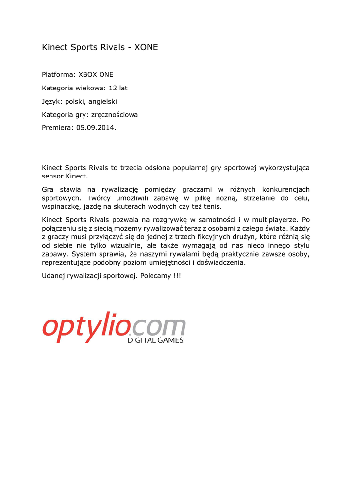 Kinect Sports Rivals - XONE Platforma: XBOX ONE Kategoria wiekowa: 12 lat Język: polski, angielski Kategoria gry: zręcznościowa Premiera: 05.09.2014. Kinect Sports Rivals to trzecia odsłona popularnej gry sportowej wykorzystująca sensor Kinect. Gra stawia na rywalizację pomiędzy graczami w różnych konkurencjach sportowych. Twórcy umożliwili zabawę w piłkę nożną, strzelanie do celu, wspinaczkę, jazdę na skuterach wodnych czy też tenis. Kinect Sports Rivals pozwala na rozgrywkę w samotności i w multiplayerze. Po połączeniu się z siecią możemy rywalizować teraz z osobami z całego świata. Każdy z graczy musi przyłączyć się do jednej z trzech fikcyjnych drużyn, które różnią się od siebie nie tylko wizualnie, ale także wymagają od nas nieco innego stylu zabawy. System sprawia, że naszymi rywalami będą praktycznie zawsze osoby, reprezentujące podobny poziom umiejętności i doświadczenia. Udanej rywalizacji sportowej. Polecamy !!!