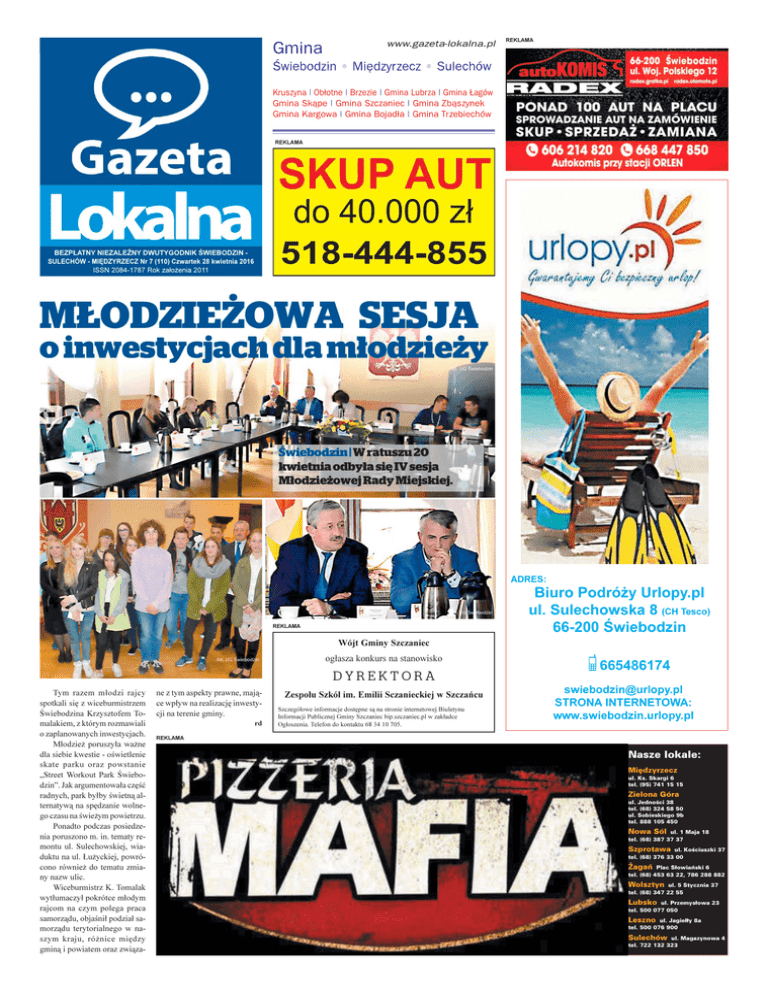 Nr 7 (110) Czwartek 28 KWIETNIA 2016 www.gazeta-lokalna.pl Gminawww.gazeta-lokalna.pl REKLAMA 1 Œwiebodzin • Miêdzyrzecz • Sulechów Kruszyna | Ob³otne | Brzezie | Gmina Lubrza | Gmina £agów Gmina Sk¹pe | Gmina Szczaniec | Gmina Zb¹szynek Gmina Kargowa | Gmina Bojad³a | Gmina Trzebiechów REKLAMA REKLAMA BEZP£ATNY NIEZALE¯NY DWUTYGODNIK ŒWIEBODZIN SULECHÓW - MIÊDZYRZECZ Nr 7 (110) Czwartek 28 kwietnia 2016 ISSN 2084-1787 Rok za³o¿enia 2011 MŁODZIEŻOWA SESJA o inwestycjach dla młodzieży fot. UG Œwiebodzin Świebodzin | W ratuszu 20 kwietnia odbyła się IV sesja Młodzieżowej Rady Miejskiej. ADRES: fot. UG Œwiebodzin REKLAMA Biuro Podró¿y Urlopy.pl ul. Sulechowska 8 (CH Tesco) 66-200 Œwiebodzin Wójt Gminy Szczaniec fot. UG Œwiebodzin og³asza konkurs na stanowisko DYREKTORA Tym razem m³odzi rajcy spotkali siê z wiceburmistrzem Œwiebodzina Krzysztofem Tomalakiem, z którym rozmawiali o zaplanowanych inwestycjach. M³odzie¿ poruszy³a wa¿ne dla siebie kwestie - oœwietlenie skate parku oraz powstanie „Street Workout Park Œwiebodzin”. Jak argumentowa³a czêœæ radnych, park by³by œwietn¹ alternatyw¹ na spêdzanie wolnego czasu na œwie¿ym powietrzu. Ponadto podczas posiedzenia poruszono m. in. tematy remontu ul. Sulechowskiej, wiaduktu na ul. £u¿yckiej, powrócono równie¿ do tematu zmiany nazw ulic. Wiceburmistrz K. Tomalak wyt³umaczy³ pokrótce m³odym rajcom na czym polega praca samorz¹du, objaœni³ podzia³ samorz¹du terytorialnego w naszym kraju, ró¿nice miêdzy gmin¹ i powiatem oraz zwi¹za- ne z tym aspekty prawne, maj¹ce wp³yw na realizacjê inwestycji na terenie gminy. rd Zespo³u Szkó³ im. Emilii Sczanieckiej w Szczañcu Szczegó³owe informacje dostêpne s¹ na stronie internetowej Biuletynu Informacji Publicznej Gminy Szczaniec bip.szczaniec.pl w zak³adce Og³oszenia. Telefon do kontaktu 68 34 10 705. 665486174 [email protected] STRONA INTERNETOWA: www.swiebodzin.urlopy.pl REKLAMA Nasze lokale: Miêdzyrzecz ul. Ks. Skargi 6 tel. (95) 741 15 15 Zielona Góra ul. Jednoœci 38 tel. (68) 324 58 50 ul. Sobieskiego 9b tel. 888 105 450 Nowa Sól ul. 1 Maja 18 tel. (68) 387 37 37 Szprotawa ul. Koœciuszki 37 tel. (68) 376 33 00 ¯agañ Plac S³owiañski 6 tel. (68) 453 63 22, 786 288 882 Wolsztyn ul. 5 Stycznia 37 tel. (68) 347 22 55 Lubsko ul. Przemys³owa 23 tel. 500 077 050 Leszno ul. Jagie³³y 8a tel. 500 076 900 Sulechów ul. Magazynowa 4 tel. 722 132 323 REGION www.gazeta-lokalna.pl Nr 7 (110) Czwartek 28 KWIETNIA 2016 Opiekunka wykorzystała Pociski w domowym ogródku Świebodzin | Policjanci z grupy rozminowania minersko-pirotechnicznego komendy powiatowej zabezpieczyli miejsce znalezienia wojennych niewybuchów. Naboje artyleryjskie były blisko zabudowań mieszkalnych. Rozpocz¹³ siê okres intensywnych prac porz¹dkowych w ogrodach i na polach. Razem z przekopywaniem ziemi czêsto dochodzi do odkrywania ró¿nych skorodowanych, metalowych przedmiotów. Przewa¿nie s¹ to zwyk³e przedmioty u¿ytkowe, jednak co jakiœ czas dochodzi do wykopania niewybuchów z okresu II Wojny Œwia- fot. KPP Œwiebodzin towej. Czêsto trudno jest odró¿niæ pocisk artyleryjski od skorodowanego kawa³ka metalowej rury. Dlatego je¿eli coœ wzbudza nasze podejrzenia, nale¿y zachowaæ zasady bezpieczeñstwa Pirat drogowy w ducato Międzyrzecz | Tysiąc złotych mandatu i 16 punktów karnych zarobił kierowca, który wyprzedzał pomimo zakazu, a manewr kontynuował, wykorzystując do tego pas do skrętu w lewo oraz powierzchnię wyłączoną z ruchu. Wszystko nagrała policja. fot. KPP Miêdzyrzecz Do zdarzenia dosz³o w niedzielê 17 kwietnia 2016 roku na drodze krajowej pomiêdzy miejscowoœciami Przytoczna i Che³msko. Policjanci, patroluj¹cy drogê nieoznakowanym radiowozem, zauwa¿yli fiata ducato. W pewnym momencie kierowca, nie zwa¿aj¹c na bardzo z³e warunki atmosferyczne, intensywne opady deszczu i ograniczon¹ widocznoœæ, wyprzedza³ dwie ciê¿arówki. Nagranie w policyjnym radiowozie zarejestrowa³o, ¿e kierowca nie przejmowa³ siê zakazem wyprzedzania oraz lini¹ podwójn¹ ci¹g³¹, a manewr ten kontynuowa³, wykorzystuj¹c pas do skrêtu w lewo oraz powierzchniê wy³¹czon¹ z ruchu. Kierowca, mieszkaniec województwa dolnoœl¹skiego, zosta³ zatrzymany do kontroli. Policjanci ukarali go mandatem karnym w wysokoœci 1000 z³ oraz 16 punktami karnymi. rd i wezwaæ policjantów. Do jednego z takich odkryæ dosz³o w sobotê 16 kwietnia w Rusinowie. Oko³o godz. 12.20 dy¿urny œwiebodziñskiej komendy otrzyma³ zg³oszenie, ¿e w przydomowym ogródku, podczas prac ziemnych, mieszkañcy natrafili na dwa przedmioty, przypominaj¹ce pociski artyleryjskie. Prawdopodobne niewybuchy, odkopane tu¿ przy zabudowaniach mieszkalnych. Na miejsce natychmiast skierowano policjantów z grupy rozpoznania minersko-pirotechnicznego. Funkcjonariusze potwierdzili, ¿e znaleziono dwa pociski artyleryjskie kal. 76 mm. O fakcie powiadomiono patrol rozminowania z Jednostki Wojskowej w Kroœnie Odrzañskim. Do czasu przybycia saperów, miejsce znalezienia niewybuchów i pobliski teren zosta³y zabezpieczone przez policjantów. Kilkadziesi¹t minut póŸniej ¿o³nierze wydobyli niewybuchy i zabezpieczyli pociski. Skontrolowano równie¿ pobliski teren i nie zna- leziono innych podobnych niebezpieczeñstw. Prawid³owa reakcja mieszkañców zapobieg³a niebezpieczeñstwu. Przypominamy! W przypadku ujawnienia podobnych przedmiotów, nie ruszajmy ich i nie wykopujmy ich sami z ziemi. Zarówno pociski artyleryjskie, jak i inne niewybuchy, mimo, i¿ s¹ skorodowane, mog¹ posiadaæ zapalniki i nadal stwarzaj¹ zagro¿enie. Pod ¿adnym pozorem nie ruszaj takich przedmiotów i nie transportuj ich. Nigdy nie próbuj ich rozbrajaæ lub demontowaæ. Je¿eli ju¿ coœ takiego odkry³eœ, nie zasypuj tego ponownie. Nie ryzykuj, o znalezisku powiadom s³u¿by! rd Zapłaci za telefony na policję Świebodzin | Przez ponad godzinę wykonał 40 poł