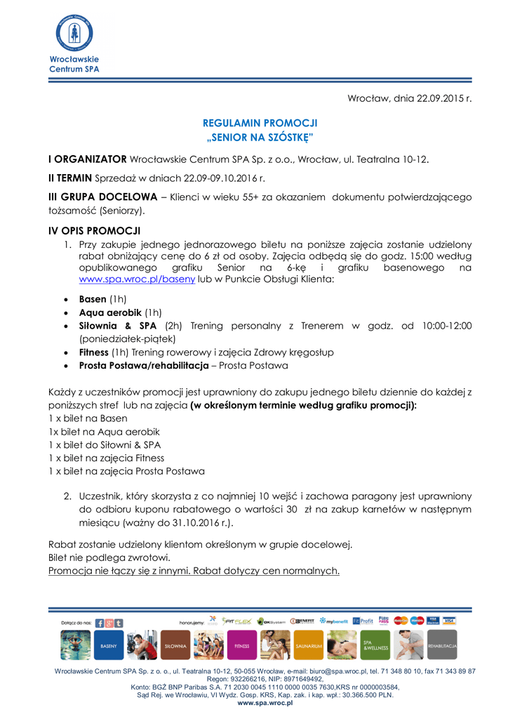 Wrocław, dnia 22.09.2015 r. REGULAMIN PROMOCJI „SENIOR NA SZÓSTKĘ” I ORGANIZATOR Wrocławskie Centrum SPA Sp. z o.o., Wrocław, ul. Teatralna 10-12. II TERMIN Sprzedaż w dniach 22.09-09.10.2016 r. III GRUPA DOCELOWA – Klienci w wieku 55+ za okazaniem dokumentu potwierdzającego tożsamość (Seniorzy). IV OPIS PROMOCJI 1. Przy zakupie jednego jednorazowego biletu na poniższe zajęcia zostanie udzielony rabat obniżający cenę do 6 zł od osoby. Zajęcia odbędą się do godz. 15:00 według opublikowanego grafiku Senior na 6-kę i grafiku basenowego na www.spa.wroc.pl/baseny lub w Punkcie Obsługi Klienta: Basen (1h) Aqua aerobik (1h) Siłownia & SPA (2h) Trening personalny z Trenerem w godz. od 10:00-12:00 (poniedziałek-piątek) Fitness (1h) Trening rowerowy i zajęcia Zdrowy kręgosłup Prosta Postawa/rehabilitacja – Prosta Postawa Każdy z uczestników promocji jest uprawniony do zakupu jednego biletu dziennie do każdej z poniższych stref lub na zajęcia (w określonym terminie według grafiku promocji): 1 x bilet na Basen 1x bilet na Aqua aerobik 1 x bilet do Siłowni & SPA 1 x bilet na zajęcia Fitness 1 x bilet na zajęcia Prosta Postawa 2. Uczestnik, który skorzysta z co najmniej 10 wejść i zachowa paragony jest uprawniony do odbioru kuponu rabatowego o wartości 30 zł na zakup karnetów w następnym miesiącu (ważny do 31.10.2016 r.). Rabat zostanie udzielony klientom określonym w grupie docelowej. Bilet nie podlega zwrotowi. Promocja nie łączy się z innymi. Rabat dotyczy cen normalnych. Wrocławskie Centrum SPA Sp. z o. o., ul. Teatralna 10-12, 50-055 Wrocław, e-mail: [email protected], tel. 71 348 80 10, fax 71 343 89 87 Regon: 932266216, NIP: 8971649492, Konto: BGŻ BNP Paribas S.A. 71 2030 0045 1110 0000 0035 7630,KRS nr 0000003584, Sąd Rej. we Wrocławiu, VI Wydz. Gosp. KRS, Kap. zak. i kap. wpł.: 30.366.500 PLN. www.spa.wroc.pl