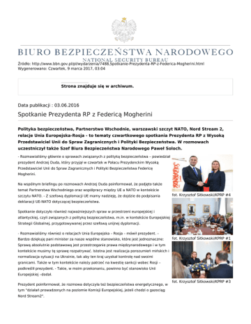 Źródło: http://www.bbn.gov.pl/pl/wydarzenia/7488,Spotkanie-Prezydenta-RP-z-Federica-Mogherini.html Wygenerowano: Czwartek, 9 marca 2017, 03:04 Strona znajduje się w archiwum. Data publikacji : 03.06.2016 Spotkanie Prezydenta RP z Federicą Mogherini Polityka bezpieczeństwa, Partnerstwo Wschodnie, warszawski szczyt NATO, Nord Stream 2, relacje Unia Europejska-Rosja - to tematy czwartkowego spotkania Prezydenta RP z Wysoką Przedstawiciel Unii do Spraw Zagranicznych i Polityki Bezpieczeństwa. W rozmowach uczestniczył także Szef Biura Bezpieczeństwa Narodowego Paweł Soloch. - Rozmawialiśmy głównie o sprawach związanych z polityką bezpieczeństwa – powiedział prezydent Andrzej Duda, który przyjął w czwartek w Pałacu Prezydenckim Wysoką Przedstawiciel Unii do Spraw Zagranicznych i Polityki Bezpieczeństwa Federicę Mogherini. Na wspólnym briefingu po rozmowach Andrzej Duda poinformował, że podjęto także temat Partnerstwa Wschodniego oraz współpracy między UE a NATO w kontekście szczytu NATO. - Z szefową dyplomacji UE mamy nadzieję, że dojdzie do podpisania fot. Krzysztof Sitkowski/KPRP #4 deklaracji UE-NATO dotyczącej bezpieczeństwa. Spotkanie dotyczyło również najważniejszych spraw w przestrzeni europejskiej i atlantyckiej, czyli związanych z polityką bezpieczeństwa, m.in. w kontekście Europejskiej Strategii Globalnej, przygotowywanej przez szefową unijnej dyplomacji. - Rozmawialiśmy również o relacjach Unia Europejska – Rosja – mówił prezydent. – Bardzo dziękuję pani minister za nasze wspólne stanowisko, które jest jednoznaczne: fot. Krzysztof Sitkowski/KPRP #1 Sprawą absolutnie podstawową jest przestrzeganie prawa międzynarodowego i w tym kontekście musimy tę sprawę rozpatrywać. Istotna jest realizacja porozumień mińskich i normalizacja sytuacji na Ukrainie, tak aby ten kraj uzyskał kontrolę nad swoimi granicami. Także w tym kontekście należy patrzeć na kwestię sankcji wobec Rosji – podkreślił prezydent. - Takie, w moim przekonaniu, powinno być stanowisko Unii Europejskiej –dodał. Prezydent poinformował, że rozmowa dotyczyła też bezpieczeństwa energetycznego, w tym "działań prowadzonych na poziomie Komisji Europejskiej, jeżeli chodzi o gazociąg Nord Stream2". fot. Krzysztof Sitkowski/KPRP #3 Federica Mogherini powiedziała, że prace nad wspólną deklaracją UE-NATO postępują dobrze. - Pracujemy nadal nad wspólną deklaracją, prace postępują dobrze, gdyż współpracujemy z NATO w wielu dziedzinach, szczególnie jeśli chodzi o zagrożenia hybrydowe, nasze działania wojskowe także w basenie Morza Śródziemnego, Egejskiego, a szczególną uwagę zwracamy na zagrożenia cybernetyczne - powiedziała. - Musimy także udzielić aktywnego poparcia Ukrainie w trudnych staraniach dotyczących wprowadzania reform - podkreśliła wysoka przedstawiciel UE. - Wiemy, że fot. Krzysztof Sitkowski/KPRP #5 zawsze możemy liczyć na aktywny wkład Polski w realizację tego celu, a także jeżeli chodzi o pomoc Polski w utrzymywaniu dobrych stosunków ze wszystkimi partnerami ze Wschodu - powiedziała Mogherini. Jako niezwykle istotny oceniła wkład, który wnosi Polska do polityki zagranicznej i bezpieczeństwa w UE. - Bardzo dobrze wiemy, że tak samo uważają Polacy. Z tego co widzę w Brukseli, Polska jest bardzo mocnym państwem członkowskim, bardzo silnym członkiem rodziny. Wiem, jak silne przekonania mają Polacy na temat członkostwa w UE fot. Krzysztof Sitkowski/KPRP #2 - mówiła Federica Mogherini. Dodała, że odwiedza Polskę "również po to, by przesłać bardzo jasny komunikat, że to poczucie jest podzielane we wszystkich zakątkach UE". - Fakt, że Polska przyczynia się do rozwoju UE w tak zdeterminowany sposób, jest czymś, co bardzo wysoko cenimy. Cieszymy się na dalszą współpracę przed szczytem NATO, a także później, gdy będziemy przedstawiali europejską strategię globalną - powiedziała wysoka przedstawiciel UE. Źródło: prezydent.pl Generuj PDF Drukuj Powiadom znajomego Tweetnij