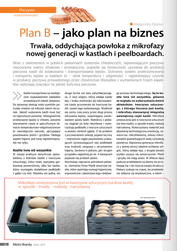 Pieczywo artykuł promocyjny Małgorzata Majdan Plan B – jako plan na biznes Trwała, oddychająca powłoka z mikrofazy nowej generacji w kastlach i peelboardach. Wraz z zaistnieniem w polskich piekarniach systemów chłodniczych, zapewniających pieczywu nieocenione walory smakowe i aromatyczne, pojawiła się konieczność używania do produkcji pieczywa kastli do leżakowania i transportowania kęsów. Ochronny system przetrzymywania i transportu kęsów w kastlach to – obok temperatury i wilgotności – najistotniejszy czynnik w produkcji pieczywa prowadzonego przez chłodnictwo Wszystkie z wymienionych trzech aspektów wpływają znacząco na jakość końcową pieczywa. Kastle transportowe są niezbędnym wyposażeniem zakładów prowadzących odpiek sklepowy. Do sprawnej obsługi wielu punktów potrzeba średnio od kilkuset takich skrzynek. Jakość wykonania kastli musi być na najwyższym poziomie. Wielogodzinne przebywanie kęsów w chłodni, powolne dojrzewanie ciasta w specyficznym klimacie temperaturowo-wilgotnościowym to newralgiczne warunki, sprzyjające powstawaniu pleśni i grzybów. Dlatego aspekt higieny jest tutaj najistotniejszy. Ale nie tylko. Kastle inne niż wszystkie W naszej praktyce dotychczas spotykaliśmy u klientów kastle z tworzywa sztucznego, które miały specjalną garbowaną powierzchnię, albo też kastle, które wymagały dodatkowo podkładki z gąbki czy folii. Niestety ani jedna, ani druga forma nie były satysfakcjonujące. Z racji wilgoci, którą oddaje każdy kęs, i braku możliwości jej odprowadzenia ciasto przywierało do tworzywa kastli, nawet tego karbowanego. Wydłużał się cenny czas pracy przez długi proces odrywania kęsów, wspomagany ostukiwaniem spodu kastli. Niektórzy z piekarzy sięgnęli po koło ratunkowe i wykorzystują podkładki z tworzyw sztucznych w postaci cienkich gąbek. O ile problem z przywieraniem zniknął, pojawił się inny – mianowicie ciągłe poprawianie uciekających (przesuwających się) podkładek oraz trudność związana z utrzymaniem higieny. Zarówno w jednym, jak i drugim przypadku najpóźniej po ok. 4 miesiącach pojawiał się problem pleśni. Wychodząc naprzeciw potrzebom piekarni, niemiecka firma PlanB stworzyła kastle, które spełniają wymogi higieniczne, ergonomiczne i jakościowe tego niełatwe- go procesu technologicznego. Są to kastle inne niż wszystkie, głównie ze względu na wykorzystanie dwóch składników: tworzywa sztucznego, z którego tłoczona jest kastla, i mikrofazy stanowiącej integralną wewnętrzną część kastli. Mikrofaza umieszczona jest w tworzywie sztucznym (na dnie kastli), w sposób trwały, metodą natryskową. Wykorzystany materiał jest absolutną technologiczną rewolucją, zawiera tzw. mikrofilamenty, miliony mikrokanałów gwarantujących stałą cyrkulację powietrza. Najnowsza generacja mikrofazy z jednej strony idealnie wchłania wilgoć, którą oddaje kęs, z drugiej bardzo szybko osusza się samoczynnie. Pleśń i grzyby nie mają szans. W efekcie kęsy podczas przekładania na blachy nie przyklejają się i nie niszczą swojej struktury. Piekarz zyskuje na czasie, bo przekładanie odbywa się błyskawiczne, a klient – Mikrofaza umieszczona jest w tworzywie sztucznym (na dnie kastli), w sposób trwały, metodą natryskową FOT. ARCHIWUM GETH 10 Mistrz Branży lipiec 2014 Pieczywo artykuł promocyjny na jakości. Bułka dzięki materiałowi, który tak dobrze reguluje wilgoć, ma charakterystyczną chrupiącą i rumianą skórkę. W dotyku materiał przypomina delikatny aksamit. Naturalnie nie ma przeciwwskazań do mycia kastli w myjkach przemysłowych. Co więcej, materiał, oprócz walorów higienicznych, cechuje duża odporność na mechaniczne uszkodzenia oraz wszelkie deformacje po kontakcie z wodą. Kastle są tłoczone, nie mają newralgicznych miejsc łączenia materiału, a narożniki są zaokrąglone w celu gwarancji zachowania higieny. Podwójna ściana kastli spełnia funkcje izolacyjne – istotny czynnik w przypadku transportu sztaplowanych kastli do sklepów. Ułożone w stosie, tworzą bufor chłodniczy, nie wymagając dodatkowego chłodzenia (samochodu-chłodni). Wykonane są z niemiecką precyzją, nakładane na siebie, idealnie przylegają, a odpowiednio dobrana otwory po dłuższym boku pozwalają na szybkie schłodzenie w chłodni zasysowej. Boki o wysokości 49 mm zabezpieczają kęsy przed wysuszeniem. Kastle są lekkie, wykonane bardzo estetycznie, stabilne i spełniają wszelkie wymogi higieniczne. Są od niedawna dostępne na rynku polskim w trzech podstawowych wymiarach: 60 x 40 cm, 78 x 58 cm i 98 x 58 cm. Dowodem na rewolucyjny wymiar tych kastli jest prestiżowa nagroda IBA Trophy, otrzymana podczas targów IBA w 2012 r. Deski garownicze – peelboardy Coraz częściej w Polsce spotkać można system garowania ciasta (czy wydłużonego prowadzenia kęsów przez system chłodniczy) na deskach, zwanych peelboardami. Deski garownicze połączone ze stacją wykładania na automatyczny stół zała- l Coraz częściej w Polsce spotkać można system garowania ciasta na deskach zwanych peelboardami dowczy pieców wsadowych to prosty i ekonomiczny system automatyzacji pieczenia. Drewniane peelboardy są „wodą na młyn” dla sanepidu. Dlatego też rynek oferuje deski z tworzywa sztucznego. Dla tego rozwiązania niemiecka firma PlanB zastosowała również swoją nowatorską technologię, polegającą na przymocowanej trwale mikrofazie o najnowszych parametrach przepuszczania powietrza. Co ciekawe, deski są dwustronne. Górna strona ze wspomnianą powłoką mikrofazy o dużej przepuszczalności powietrza świetnie sprawdza się w wypadku pieczywa jasnego (w tym bułek), nie posypywanego mąką. Kęsy nie przyklejają się do deski dzięki zdolności odbierania wilgoci przez materiał i do samoosuszania się. Deska pozostaje czysta, bez śladów po cieście. Mikrofaza wtopiona jest w tworzywo sztuczne, stanowi j