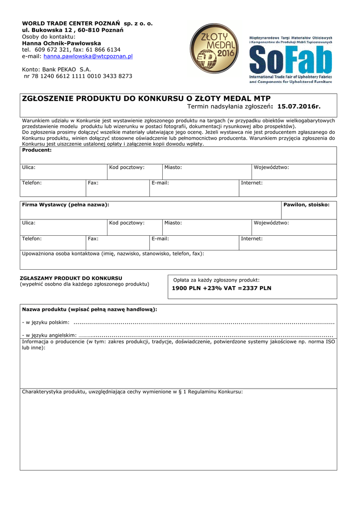 2016-SoFab Zgłoszenie produktu do Konkursu o Złoty Medal MTP