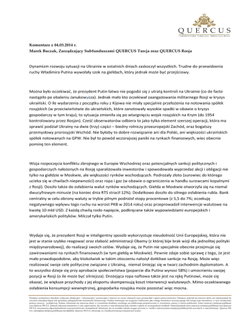 Komentarz z 04.03.2014 r. Marek Buczak, Zarządzający Subfunduszami QUERCUS Turcja oraz QUERCUS Rosja Dynamizm rozwoju sytuacji na Ukrainie w ostatnich dniach zaskoczył wszystkich. Trudne do przewidzenia ruchy Władimira Putina wywołały szok na giełdach, który jednak może być przejściowy. Można było oczekiwać, że prezydent Putin łatwo nie pogodzi się z utratą kontroli na Ukrainie (co de facto nastąpiło po obaleniu Janukowycza). Jednak mało kto oczekiwał zaangażowania militarnego Rosji w kryzys ukraiński. O ile wydarzenia z początku roku z Kijowa nie miały specjalnie przełożenia na notowania spółek rosyjskich (w przeciwieństwie do ukraińskich, które zanotowały wysokie spadki w obawie o kryzys gospodarczy w tym kraju), to sytuacja zmieniła się po wtargnięciu wojsk rosyjskich na Krym (do 1954 kontrolowany przez Rosjan). Cześć obserwatorów odbiera to jako tylko element szerszej operacji, która ma sprawić podział Ukrainy na dwie (trzy) części – biedny rolniczy proeuropejski Zachód, oraz bogatszy przemysłowy prorosyjski Wschód. Nie byłoby to dobre rozwiązanie ani dla Polski, ani większości ukraińskich spółek notowanych na GPW. Nie był to powód wczorajszej paniki na rynkach finansowych, wiec obecnie pominę ten element. Wizja rozpoczęcia konfliktu zbrojnego w Europie Wschodniej oraz potencjalnych sankcji politycznych i gospodarczych nałożonych na Rosję sparaliżowała inwestorów i spowodowała wyprzedaż akcji i obligacji nie tylko na giełdzie w Moskwie, ale większości rynków wschodzących. Podrożały złoto (surowiec do którego ucieka się w chwilach niepewności) oraz ropa i gaz (w obawie o ograniczenia w handlu surowcami kopalnymi z Rosji). Doszło także do osłabienia walut rynków wschodzących. Giełda w Moskwie otworzyła się na niemal dwucyfrowym minusie (na koniec dnia RTS stracił 12%). Dodatkowo doszło do silnego osłabienia rubla. Bank centralny w celu obrony waluty w trybie pilnym podniósł stopy procentowe (z 5,5 do 7%; oczekuję negatywnego wpływu tego ruchu na wzrost PKB w 2014 roku) oraz przeprowadził interwencje walutowe na kwotę 10 mld USD. Z każdą chwilą rosło napięcie, podkręcane także wypowiedziami europejskich i amerykańskich polityków. Milczał tylko Putin. Wydaje się, że prezydent Rosji w inteligentny sposób wykorzystuje nieudolność Unii Europejskiej, która nie jest w stanie szybko reagować oraz słabość administracji Obamy (z której bije brak wizji dla jednolitej polityki międzynarodowej), do realizacji swoich celów. Wydaje się, że Putin nie specjalnie obecnie przejmuje się zawirowaniami na rynkach finansowych (w tym giełdą w Moskwie). Pewnie zdaje sobie sprawę z tego, że jest mało prawdopodobne, aby ktokolwiek w takim otoczeniu nałożył dotkliwe sankcje na Rosję. Może więc realizować swoje cele polityczne związane z Ukrainą, niemal śmiejąc się w twarz zachodnim dyplomatom. A to wszystko dzieje się przy aprobacie społeczeństwa (poparcie dla Putina wynosi 58%) i umocnieniu swojej pozycji w Rosji (o ile może być silniejsza). Drożejąca ropa naftowa także jest na rękę Putinowi, może się okazać, że większe przychody z jej eksportu skompensują koszt interwencji walutowych. Mimo oczekiwanego osłabienia konsumpcji wewnętrznej, gospodarka rosyjska może pozostać więc mocna. Niniejszy materiał ma charakter wyłącznie edukacyjno – informacyjny / promocyjny i stanowi on wyraz własnych ocen, przemyśleń i opinii autora (autorów). Niniejszy materiał nie stanowi oferty ani rekomendacji do zawarcia transakcji kupna lub sprzedaży jakiegokolwiek instrumentu finansowego. Podane informacje nie mogą być traktowane jako usługa doradztwa inwestycyjnego lub innego typu doradztwa, w tym świadczenia pomocy prawno - podatkowej. Podane informacje nie stanowią oferty w rozumieniu Kodeksu cywilnego ani publicznego proponowania w rozumieniu ustawy o ofercie publicznej. Autor (autorzy) niniejszej publikacji oraz Quercus TFI S.A. dołożyli należytej staranności w celu zapewnienia, aby zawarte w niej informacje były rzetelne i oparte na wiarygodnych źródłach. Niemniej jednak autor (autorzy) niniejszej publikacji oraz Quercus TFI S.A. nie ponoszą odpowiedzialności za jej prawdziwość i kompletność informacji, ani za wszelkie szkody mogące powstać w wyniku wykorzystania niniejszej publikacji lub zawartych w niej informacji. Quercus TFI S.A. udostępnia niniejszą publikację nieodpłatnie. Quercus TFI S.A. informuje, że z każdą inwestycją związane jest ryzyko. Czy ostatnie wydarzenia oznaczają koniec historii Rosji jako atrakcyjnego rynku giełdowego? Niekoniecznie. Przykład z 2008 roku pokazuje, że pamięć inwestorów jest krótka. Co prawda po inwazji na Gruzję notowania spółek rosyjskich spadły, jednak już w 2009 roku rosyjska giełda okazała się przebojem inwestycyjnym (RTS wzrósł w ciągu 12 miesięcy o 129%). Miejsce zrażonych, zniesmaczonych inwestorów zajęli nowi, którzy osiągnęli sowite zyski. Nie wykluczam, że sytuacja powtórzy się i tym razem (choć mało realne jest powtórzenie historycznych stóp zwrotu). Rozwój sytuacji będzie się zmieniał z dnia na dzień, oczekuję więc że w krótkim terminie czeka nas bardzo wysoka zmienność notowań spółek rosyjskich. Po wczorajszych spadkach dzisiejszy dzień może przynieść wysokie wzrosty. Nie wiadomo jednak na ile uspokojenie będzie trwałe. Jednak za jakiś czas, jak już opadną emocje i będziemy mieli większą przejrzystość sytuacji na Ukrainie, oczekiwałbym powrotu zainteresowania inwestorów Rosją. Niniejszy materiał ma charakter wyłącznie edukacyjno – informacyjny / promocyjny i stanowi on wyraz własnych ocen, przemyśleń i opinii autora (autorów). Niniejszy materiał nie stanowi oferty ani rekomendacji do zawarcia transakcji kupna lub sprzedaży jakiegokolwiek instrumentu finansowego. Podane informacje nie mogą być traktowane 