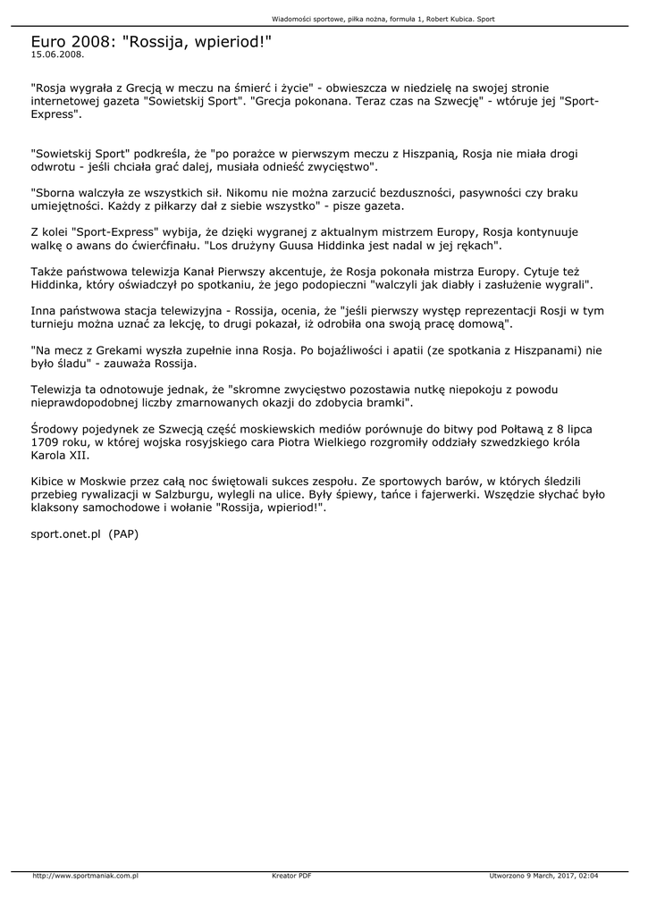 Wiadomości sportowe, piłka nożna, formuła 1, Robert Kubica. Sport Euro 2008: "Rossija, wpieriod!" 15.06.2008. "Rosja wygrała z Grecją w meczu na śmierć i życie" - obwieszcza w niedzielę na swojej stronie internetowej gazeta "Sowietskij Sport". "Grecja pokonana. Teraz czas na Szwecję" - wtóruje jej "SportExpress". "Sowietskij Sport" podkreśla, że "po porażce w pierwszym meczu z Hiszpanią, Rosja nie miała drogi odwrotu - jeśli chciała grać dalej, musiała odnieść zwycięstwo". "Sborna walczyła ze wszystkich sił. Nikomu nie można zarzucić bezduszności, pasywności czy braku umiejętności. Każdy z piłkarzy dał z siebie wszystko" - pisze gazeta. Z kolei "Sport-Express" wybija, że dzięki wygranej z aktualnym mistrzem Europy, Rosja kontynuuje walkę o awans do ćwierćfinału. "Los drużyny Guusa Hiddinka jest nadal w jej rękach". Także państwowa telewizja Kanał Pierwszy akcentuje, że Rosja pokonała mistrza Europy. Cytuje też Hiddinka, który oświadczył po spotkaniu, że jego podopieczni "walczyli jak diabły i zasłużenie wygrali". Inna państwowa stacja telewizyjna - Rossija, ocenia, że "jeśli pierwszy występ reprezentacji Rosji w tym turnieju można uznać za lekcję, to drugi pokazał, iż odrobiła ona swoją pracę domową". "Na mecz z Grekami wyszła zupełnie inna Rosja. Po bojaźliwości i apatii (ze spotkania z Hiszpanami) nie było śladu" - zauważa Rossija. Telewizja ta odnotowuje jednak, że "skromne zwycięstwo pozostawia nutkę niepokoju z powodu nieprawdopodobnej liczby zmarnowanych okazji do zdobycia bramki". Środowy pojedynek ze Szwecją część moskiewskich mediów porównuje do bitwy pod Połtawą z 8 lipca 1709 roku, w której wojska rosyjskiego cara Piotra Wielkiego rozgromiły oddziały szwedzkiego króla Karola XII. Kibice w Moskwie przez całą noc świętowali sukces zespołu. Ze sportowych barów, w których śledzili przebieg rywalizacji w Salzburgu, wylegli na ulice. Były śpiewy, tańce i fajerwerki. Wszędzie słychać było klaksony samochodowe i wołanie "Rossija, wpieriod!". sport.onet.pl (PAP) http://www.sportmaniak.com.pl Kreator PDF Utworzono 9 March, 2017, 02:04