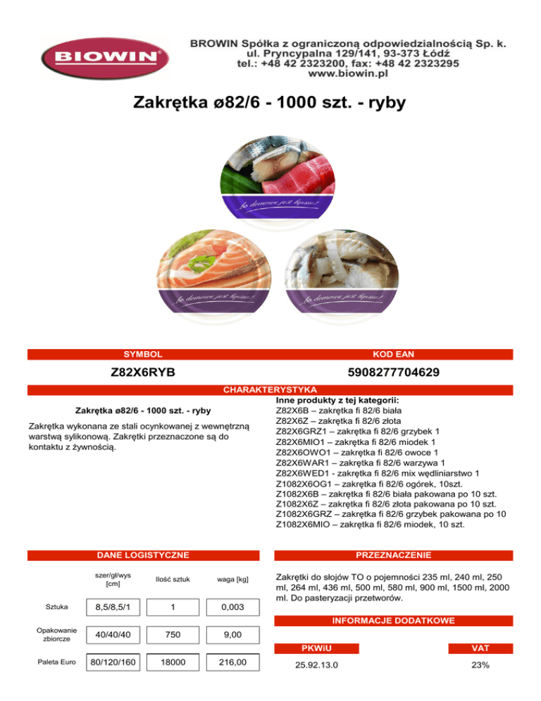 Zakrętka ø82/6 - 1000 szt. - ryby SYMBOL KOD EAN Z82X6RYB 5908277704629 CHARAKTERYSTYKA Inne produkty z tej kategorii: Zakrętka ø82/6 - 1000 szt. - ryby Z82X6B – zakrętka fi 82/6 biała Z82X6Z – zakrętka fi 82/6 złota Zakrętka wykonana ze stali ocynkowanej z wewnętrzną Z82X6GRZ1 – zakrętka fi 82/6 grzybek 1 warstwą sylikonową. Zakrętki przeznaczone są do Z82X6MIO1 – zakrętka fi 82/6 miodek 1 kontaktu z żywnością. Z82X6OWO1 – zakrętka fi 82/6 owoce 1 Z82X6WAR1 – zakrętka fi 82/6 warzywa 1 Z82X6WED1 - zakrętka fi 82/6 mix wędliniarstwo 1 Z1082X6OG1 – zakrętka fi 82/6 ogórek, 10szt. Z1082X6B – zakrętka fi 82/6 biała pakowana po 10 szt. Z1082X6Z – zakrętka fi 82/6 złota pakowana po 10 szt. Z1082X6GRZ – zakrętka fi 82/6 grzybek pakowana po 10 Z1082X6MIO – zakrętka fi 82/6 miodek, 10 szt. DANE LOGISTYCZNE Sztuka PRZEZNACZENIE szer/gł/wys [cm] Ilość sztuk waga [kg] 8,5/8,5/1 1 0,003 Zakrętki do słojów TO o pojemności 235 ml, 240 ml, 250 ml, 264 ml, 436 ml, 500 ml, 580 ml, 900 ml, 1500 ml, 2000 ml. Do pasteryzacji przetworów. INFORMACJE DODATKOWE Opakowanie zbiorcze Paleta Euro 40/40/40 80/120/160 750 18000 9,00 216,00 PKWiU VAT 25.92.13.0 23%