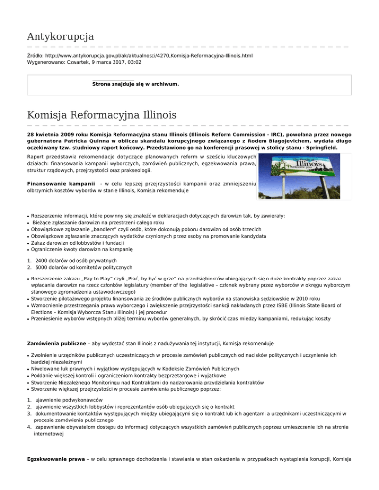 Antykorupcja Źródło: http://www.antykorupcja.gov.pl/ak/aktualnosci/4270,Komisja-Reformacyjna-Illinois.html Wygenerowano: Czwartek, 9 marca 2017, 03:02 Strona znajduje się w archiwum. Komisja Reformacyjna Illinois 28 kwietnia 2009 roku Komisja Reformacyjna stanu Illinois (Illinois Reform Commission - IRC), powołana przez nowego gubernatora Patricka Quinna w obliczu skandalu korupcyjnego związanego z Rodem Blagojevichem, wydała długo oczekiwany tzw. studniowy raport końcowy. Przedstawiono go na konferencji prasowej w stolicy stanu - Springfield. Raport przedstawia rekomendacje dotyczące planowanych reform w sześciu kluczowych działach: finansowania kampanii wyborczych, zamówień publicznych, egzekwowania prawa, struktur rządowych, przejrzystości oraz prakseologii. Finansowanie kampanii - w celu lepszej przejrzystości kampanii oraz zmniejszeniu olbrzymich kosztów wyborów w stanie Illinois, Komisja rekomenduje ● ● ● ● ● ● Rozszerzenie informacji, które powinny się znaleźć w deklaracjach dotyczących darowizn tak, by zawierały: Bieżące zgłaszanie darowizn na przestrzeni całego roku Obowiązkowe zgłaszanie „bandlers” czyli osób, które dokonują poboru darowizn od osób trzecich Obowiązkowe zgłaszanie znaczących wydatków czynionych przez osoby na promowanie kandydata Zakaz darowizn od lobbystów i fundacji Ograniczenie kwoty darowizn na kampanię 1. 2400 dolarów od osób prywatnych 2. 5000 dolarów od komitetów politycznych ● ● ● ● Rozszerzenie zakazu „Pay to Play” czyli „Płać, by być w grze” na przedsiębiorców ubiegających się o duże kontrakty poprzez zakaz wpłacania darowizn na rzecz członków legislatury (member of the legislative – członek wybrany przez wyborców w okręgu wyborczym stanowego zgromadzenia ustawodawczego) Stworzenie pilotażowego projektu finansowania ze środków publicznych wyborów na stanowiska sędziowskie w 2010 roku Wzmocnienie przestrzegania prawa wyborczego i zwiększenie przejrzystości sankcji nakładanych przez ISBE (Illinois State Board of Elections – Komisja Wyborcza Stanu Illinois) i jej procedur Przeniesienie wyborów wstępnych bliżej terminu wyborów generalnych, by skrócić czas miedzy kampaniami, redukując koszty Zamówienia publiczne – aby wydostać stan Illinois z nadużywania tej instytucji, Komisja rekomenduje ● ● ● ● ● Zwolnienie urzędników publicznych uczestniczących w procesie zamówień publicznych od nacisków politycznych i uczynienie ich bardziej niezależnymi Niwelowane luk prawnych i wyjątków występujących w Kodeksie Zamówień Publicznych Poddanie większej kontroli i ograniczeniom kontrakty bezprzetargowe i wyjątkowe Stworzenie Niezależnego Monitoringu nad Kontraktami do nadzorowania przydzielania kontraktów Stworzenie większej przejrzystości w procesie zamówienia publicznego poprzez: 1. ujawnienie podwykonawców 2. ujawnienie wszystkich lobbystów i reprezentantów osób ubiegających się o kontrakt 3. dokumentowanie kontaktów występujących między ubiegającymi się o kontrakt lub ich agentami a urzędnikami uczestniczącymi w procesie zamówienia publicznego 4. zapewnienie obywatelom dostępu do informacji dotyczących wszystkich zamówień publicznych poprzez umieszczenie ich na stronie internetowej Egzekwowanie prawa – w celu sprawnego dochodzenia i stawiania w stan oskarżenia w przypadkach wystąpienia korupcji, Komisja zaleca: ● ● ● ● ● wprowadzenie poprawek w prawie stanowym wyposażających prokuratorów i śledczych w sprawach korupcyjnych w instrumenty dostępne do tej pory władzom federalnym dodanie przestępstw korupcyjnych do listy przestępstw niepodlegających zawieszeniu kary przyznanie prokuratorowi generalnemu Illinois władzy do przeprowadzenia niezależnego dochodzenia zatwierdzeniu przez wielką ławę przysięgłych w przypadkach przestępstw korupcyjnych przeniesienie dodatkowych środków do dochodzenia przestępstw korupcyjnych w sektorze publicznym, poprzez stworzenie odrębnego wydziału do walki z korupcją w strukturach Policji Stanowej modyfikacja prawa, w oparciu o które działa biuro Inspektora Generalnego, dając inspektorom możliwość niezależnego przeprowadzenia śledztw Struktura rządu – w celu zapobiegania problemom strukturalnym, które umożliwiają lub tworzą korupcję i niewydolność rządu stanowego, Komisja rekomenduje: ● ● ● Przyjęcie legislacji przywracającej sprawiedliwość procesu, w którym wyznaczane są okręgi wyborcze do władz stanowych i centralnych Wsparcie toczących się prac nad ograniczeniem czasu kadencji najważniejszych stanowisk ustawodawczych stanu (Spikera Izby Reprezentantów, Lidera Większości Senackiej i Liderów Mniejszości w obu izbach) Wniesienie poprawek Regulaminu Izby Reprezentantów i Senatu dotyczącego procesu uchwalania budżetu tak, by zapewnić efektywny system równoważenia się władz Wniesienie poprawek do Regulaminu Izby Reprezentantów i Senatu, które zapewnią, by każda proponowana zmiana legislacyjna, która ma minimalne niezbędne poparcie senatorów lub reprezentantów stanu, otrzymała pełne poparcie komisji. Przejrzystość – w celu zwiększenia przejrzystości rządu stanowego, Komisja rekomenduje: ● ● ● ● ● ● Stosowanie Ustawy o Posiedzeniach Jawnych (Open Meetings Act) podczas obrad Zgromadzenia Ogólnego Przyjęcie z założenia publikowanie informacji zgodnie z FOIA (Freedom of Information Act – Ustawa o Swobodnym Dostępie do Informacji) Ograniczenie stosowania wyjątków od FOIA i Ustawy o Posiedzeniach Jawnych, tak by obywatele mieli łatwiejszy dostęp do akt rządowych i podejmowania przez niego decyzji Zaostrzenie kar za nieprzestrzeganie FOIA i wymogów wynikających z Ustawy o Posiedzeniach Jawnych Powołanie niezależnego Biura ds. Przejrzystości zapewniającego szkolenia i nadzorującego stosowanie FOIA i OMA Szerokie stosowanie nowoczesnej technologii w celu ujawnien