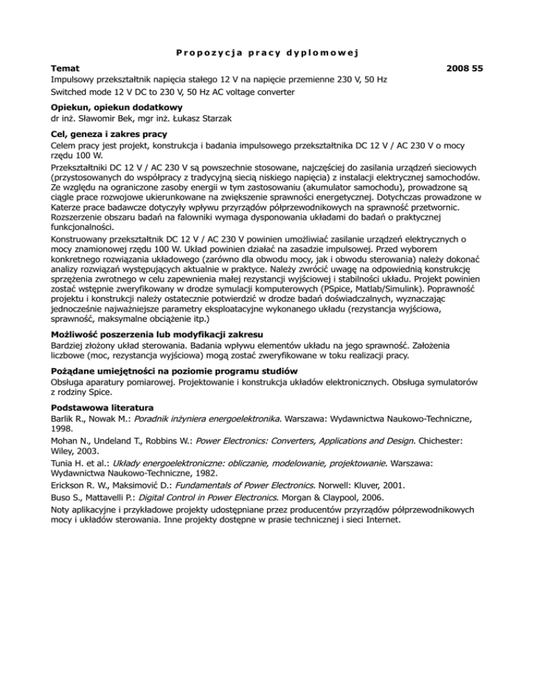 Propozycja pracy dyplomowej Temat Impulsowy przekształtnik napięcia stałego 12 V na napięcie przemienne 230 V, 50 Hz Switched mode 12 V DC to 230 V, 50 Hz AC voltage converter 2008 55 Opiekun, opiekun dodatkowy dr inż. Sławomir Bek, mgr inż. Łukasz Starzak Cel, geneza i zakres pracy Celem pracy jest projekt, konstrukcja i badania impulsowego przekształtnika DC 12 V / AC 230 V o mocy rzędu 100 W. Przekształtniki DC 12 V / AC 230 V są powszechnie stosowane, najczęściej do zasilania urządzeń sieciowych (przystosowanych do współpracy z tradycyjną siecią niskiego napięcia) z instalacji elektrycznej samochodów. Ze względu na ograniczone zasoby energii w tym zastosowaniu (akumulator samochodu), prowadzone są ciągle prace rozwojowe ukierunkowane na zwiększenie sprawności energetycznej. Dotychczas prowadzone w Katerze prace badawcze dotyczyły wpływu przyrządów półprzewodnikowych na sprawność przetwornic. Rozszerzenie obszaru badań na falowniki wymaga dysponowania układami do badań o praktycznej funkcjonalności. Konstruowany przekształtnik DC 12 V / AC 230 V powinien umożliwiać zasilanie urządzeń elektrycznych o mocy znamionowej rzędu 100 W. Układ powinien działać na zasadzie impulsowej. Przed wyborem konkretnego rozwiązania układowego (zarówno dla obwodu mocy, jak i obwodu sterowania) należy dokonać analizy rozwiązań występujących aktualnie w praktyce. Należy zwrócić uwagę na odpowiednią konstrukcję sprzężenia zwrotnego w celu zapewnienia małej rezystancji wyjściowej i stabilności układu. Projekt powinien zostać wstępnie zweryfikowany w drodze symulacji komputerowych (PSpice, Matlab/Simulink). Poprawność projektu i konstrukcji należy ostatecznie potwierdzić w drodze badań doświadczalnych, wyznaczając jednocześnie najważniejsze parametry eksploatacyjne wykonanego układu (rezystancja wyjściowa, sprawność, maksymalne obciążenie itp.) Możliwość poszerzenia lub modyfikacji zakresu Bardziej złożony układ sterowania. Badania wpływu elementów układu na jego sprawność. Założenia liczbowe (moc, rezystancja wyjściowa) mogą zostać zweryfikowane w toku realizacji pracy. Pożądane umiejętności na poziomie programu studiów Obsługa aparatury pomiarowej. Projektowanie i konstrukcja układów elektronicznych. Obsługa symulatorów z rodziny Spice. Podstawowa literatura Barlik R., Nowak M.: Poradnik inżyniera energoelektronika. Warszawa: Wydawnictwa Naukowo-Techniczne, 1998. Mohan N., Undeland T., Robbins W.: Power Electronics: Converters, Applications and Design. Chichester: Wiley, 2003. Tunia H. et al.: Układy energoelektroniczne: obliczanie, modelowanie, projektowanie. Warszawa: Wydawnictwa Naukowo-Techniczne, 1982. Erickson R. W., Maksimović D.: Fundamentals of Power Electronics. Norwell: Kluver, 2001. Buso S., Mattavelli P.: Digital Control in Power Electronics. Morgan & Claypool, 2006. Noty aplikacyjne i przykładowe projekty udostępniane przez producentów przyrządów półprzewodnikowych mocy i układów sterowania. Inne projekty dostępne w prasie technicznej i sieci Internet.