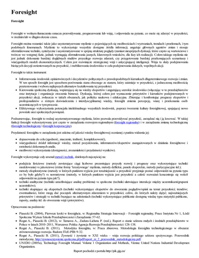 Foresight Foresight Foresight w wolnym tłumaczeniu oznacza przewidywanie, prognozowanie lub wizję, i odpowiada na pytanie, co może się zdarzyć w przyszłości, w średnim lub w długim okresie czasu. Foresight można rozumieć także jako usystematyzowane myślenie o pojawiających się możliwościach i wyzwaniach, trendach i przełomach, i tym podobnych fenomenach. Myślenie to wykorzystuje wszystkie dostępne źródła informacji, angażuje głównych agentów zmian i stosuje sformalizowane techniki, syntetyczne i usystematyzowane w spójną strukturę poglądy (zamiast niespójnych dyskusji, które często są wartościowe i twórcze we wstępnej fazie, jednak wymagają sformułowania jasnych, klarownych wniosków, dla fazy ich realizacji). Celem takiego myślenia nie jest jednak dokonanie bardziej dogłębnych studiów przyszłego rozwoju zdarzeń, czy przygotowanie bardziej przekonujących scenariuszy i wiarygodnych modeli ekonometrycznych. Celem jest rozwinięcie strategicznej wizji i antycypującej inteligencji. Wizja ta służy podejmowaniu bieżących decyzji zorientowanych na przyszłość, i mobilizowaniu środowiska w celu podejmowania dalszych, wspólnych akcji. Foresight to także instrument: Informowania środowisk opiniotwórczych i decydentów politycznych o prawdopodobnych kierunkach długoterminowego rozwoju i zmian. W ten sposób foresight jest sposobem porównania stanu obecnego ze stanem, który zaistnieje w przyszłości, z jednoczesną możliwością przetestowania i wyboru najlepszych alternatyw kształtowania tej przyszłości. Kierowania społeczną dyskusją, wspierającą się na wiedzy ekspertów i angażującą szerokie środowisko (włączając w to przedsiębiorców oraz instytucje i organizacje otoczenia biznesu). Dyskusją, której celem jest wyznaczenie priorytetów i kierunków podejmowanych w przyszłości akcji, zwłaszcza w takich obszarach, jak polityka naukowa i edukacyjna. Zbierając i konfrontując prognozy ekspertów i profesjonalistów o różnym doświadczeniu i interdyscyplinarnej wiedzy, foresight zmienia percepcję, wiarę i przekonania osób uczestniczących w tym procesie. Efektywnego wykorzystania potencjału intelektualnego wszystkich środowisk, poprzez tworzenie kultury foresightowej, spajającej nowo powstałe sieci społecznych powiązań. Podsumowując, foresight to rodzaj usystematyzowanego myślenia, które pozwala przewidywać przyszłość, zarządzać nią i ją kreować. W takiej funkcji foresight wykorzystywany jest często w zarządzaniu rozwojem regionalnym (foresight regionalny) i w zarządzaniu zmianą technologiczną (foresight technologiczny i foresight korporacyjny). Przydatność foresightu w zarządzaniu jest zależna od jakości wiedzy foresightowej ocenianej z punktu widzenia jej: dopasowania do celu (zgodność, znaczenie, trafność, kompleksowość), wiarygodności źródeł informacji/ wiedzy, metod pozyskiwania, informatorów/ekspertów zaangażowanych w działania foresightowe i rzetelności dokonanych analiz, możliwości wykorzystania (dostępności, zrozumiałości i przydatności wyników). Foresight wykorzystuje cały arsenał metod i technik, dzielonych najczęściej na: podejścia ilościowe (metody zawierające ciągi liczbowe prezentujące przyszły rozwój i prognozy oraz wykorzystujące techniki modelowania) vs jakościowe (różne formy ‘kreatywnego’ myślenia, metody delfickie, panele eksperckie, metody partycypacyjne itd.); metody eksploratywne (metody w których punktem wyjścia jest teraźniejszość a przyszłość przyjmuje postać odpowiedzi na pytania typu co by było gdyby?) vs normatywne (metody, w których punktem wyjścia jest przyszłość a całość rozważań koncentruje się wokół odpowiedzi na pytania typu jak?); techniki analityczne (techniki umożliwiające analizę problemu) vs społeczne (techniki ułatwiające interakcje między uczestnikami/grupami uczestników); techniki skupiające się ekspertach (techniki wykorzystujące ekspertów do stworzenia poglądów/opinii na temat przyszłości; trendów; ewentualności, które mogą dać początek alternatywnym zdarzeniom w przyszłości; celów, do których należy dążyć; najważniejszych priorytetów i strategii) vs techniki bazujące na założeniach (techniki wykorzystujące publicznie dostępną wiedzę typu statystyki publiczne, raporty, analizy itd. do stworzenia wizji i priorytetów). Opracowano na podstawie: Piasecki B. (2004), Pierwsze kroki w foresighcie, w: Regionalna Strategia Innowacji – Foresight regionalny, Prace Instytutu Nr 1, Łódź: Społeczna Wyższa Szkoła Przedsiębiorczości i Zarządzania: 57-62. Rogut A., Piasecki B. (2012), w: Tarnawa A., Zadura-Lichota P. (red.), Raport o stanie sektora małych i średnich przedsiębiorstw w Polsce w latach 2010–2011, Warszawa: Polska Agencja Rozwoju Przedsiębiorczości: 128-138. Rogut A., Piasecki B. (2011), Metodyka foresightu, w: Praca zbiorowa. Metodologia foresightu technologicznego w obszarze zrównoważonego rozwoju. Radom: ITeE-PIB: 9-32. Rogut A., Piasecki B. (2011), Żywność i żywienie w XXI wieku – wizja rozwoju polskiego sektora spożywczego. Przewodnik metodyczny, http://zywnoscizywienie.spoleczna.pl/pdf/raport_zz_2_przewodnik_metodologiczny.pdf. UNIDO (2005a), Technology Foresight Manual. Volume 1 Organization and Methods, Vienna: United Nations Industrial Development Organization. Raport pochodzi z portalu http://pik.gig.eu/ (UNIDO 2005b), Foresight technologiczny. Podręcznik. Tom 1, Organizacja i metody, Tłumaczenie na zlecenie Polskiej Agencji Rozwoju Przedsiębiorczości, Warszawa: Polska Agencja Rozwoju Przedsiębiorczości. Raport pochodzi z portalu http://pik.gig.eu/