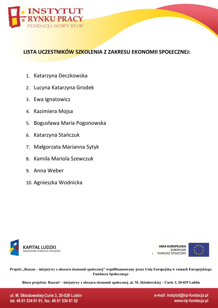 LISTA UCZESTNIKÓW SZKOLENIA Z ZAKRESU EKONOMII SPOŁECZNEJ: 1. Katarzyna Deczkowska 2. Lucyna Katarzyna Grodek 3. Ewa Ignatowicz 4. Kazimiera Mojsa 5. Bogusława Maria Pogonowska 6. Katarzyna Stańczuk 7. Małgorzata Marianna Sytyk 8. Kamila Mariola Szewczuk 9. Anna Weber 10. Agnieszka Wodnicka Projekt „Razem – inicjatywy z obszaru ekonomii społecznej” współfinansowany przez Unię Europejską w ramach Europejskiego Funduszu Społecznego Biuro projektu: Razem! – inicjatywy z obszaru ekonomii społecznej, ul. M. Skłodowskiej – Curie 3, 20-029 Lublin