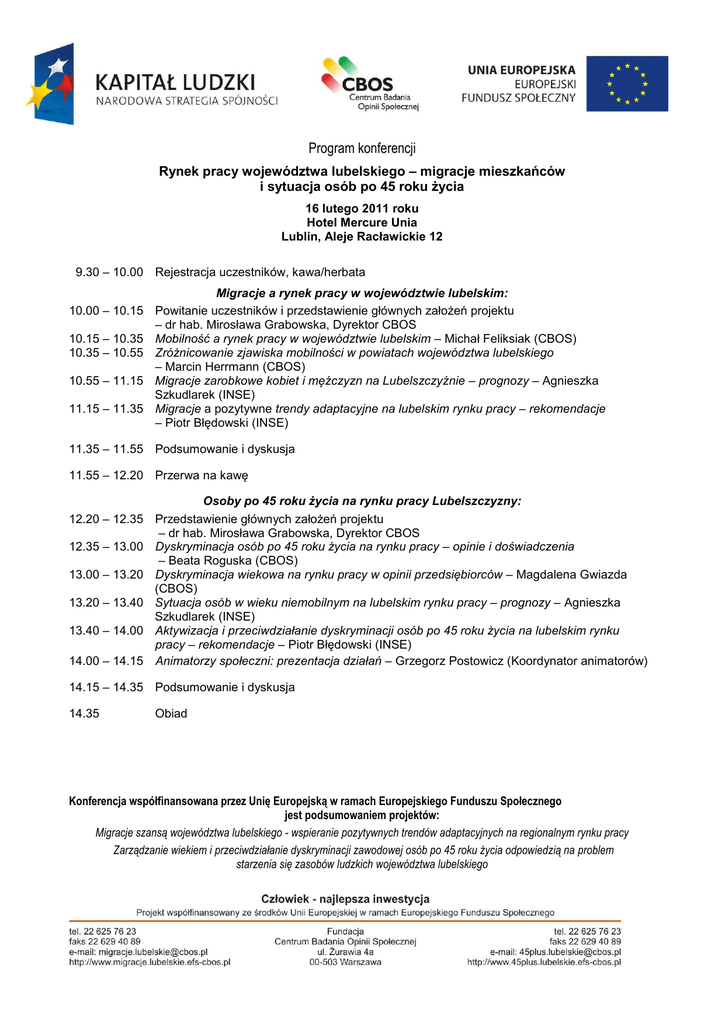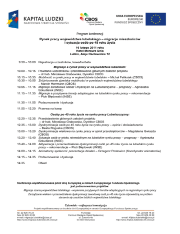 Program konferencji Rynek pracy województwa lubelskiego – migracje mieszkańców i sytuacja osób po 45 roku życia 16 lutego 2011 roku Hotel Mercure Unia Lublin, Aleje Racławickie 12 9.30 – 10.00 Rejestracja uczestników, kawa/herbata Migracje a rynek pracy w województwie lubelskim: 10.00 – 10.15 Powitanie uczestników i przedstawienie głównych założeń projektu – dr hab. Mirosława Grabowska, Dyrektor CBOS 10.15 – 10.35 Mobilność a rynek pracy w województwie lubelskim – Michał Feliksiak (CBOS) 10.35 – 10.55 Zróżnicowanie zjawiska mobilności w powiatach województwa lubelskiego – Marcin Herrmann (CBOS) 10.55 – 11.15 Migracje zarobkowe kobiet i mężczyzn na Lubelszczyźnie – prognozy – Agnieszka Szkudlarek (INSE) 11.15 – 11.35 Migracje a pozytywne trendy adaptacyjne na lubelskim rynku pracy – rekomendacje – Piotr Błędowski (INSE) 11.35 – 11.55 Podsumowanie i dyskusja 11.55 – 12.20 Przerwa na kawę 12.20 – 12.35 12.35 – 13.00 13.00 – 13.20 13.20 – 13.40 13.40 – 14.00 14.00 – 14.15 Osoby po 45 roku życia na rynku pracy Lubelszczyzny: Przedstawienie głównych założeń projektu – dr hab. Mirosława Grabowska, Dyrektor CBOS Dyskryminacja osób po 45 roku życia na rynku pracy – opinie i doświadczenia – Beata Roguska (CBOS) Dyskryminacja wiekowa na rynku pracy w opinii przedsiębiorców – Magdalena Gwiazda (CBOS) Sytuacja osób w wieku niemobilnym na lubelskim rynku pracy – prognozy – Agnieszka Szkudlarek (INSE) Aktywizacja i przeciwdziałanie dyskryminacji osób po 45 roku życia na lubelskim rynku pracy – rekomendacje – Piotr Błędowski (INSE) Animatorzy społeczni: prezentacja działań – Grzegorz Postowicz (Koordynator animatorów) 14.15 – 14.35 Podsumowanie i dyskusja 14.35 Obiad Konferencja współfinansowana przez Unię Europejską w ramach Europejskiego Funduszu Społecznego jest podsumowaniem projektów: Migracje szansą województwa lubelskiego - wspieranie pozytywnych trendów adaptacyjnych na regionalnym rynku pracy Zarządzanie wiekiem i przeciwdziałanie dyskryminacji zawodowej osób po 45 roku życia odpowiedzią na problem starzenia się zasobów ludzkich województwa lubelskiego