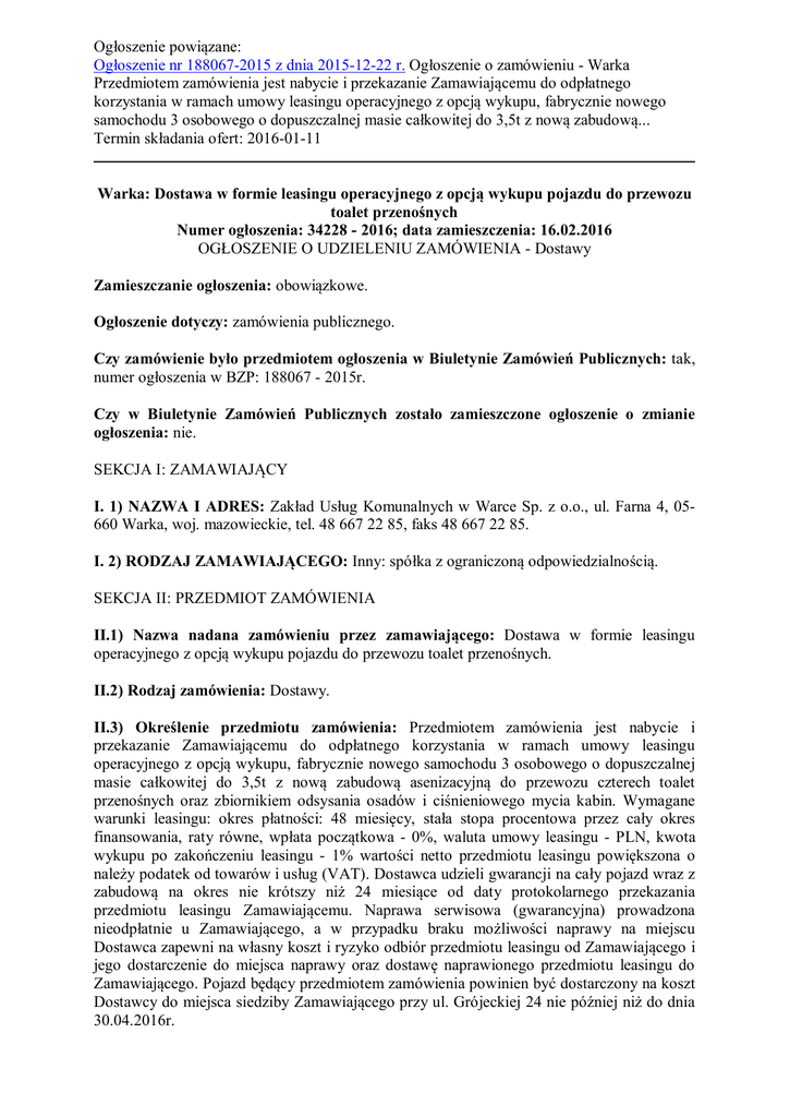 Og oszenie powi zane: Og oszenie nr 188067-2015 z dnia 2015-12-22 r. Og oszenie o zamówieniu - Warka Przedmiotem zamówienia jest nabycie i przekazanie Zamawiaj cemu do odp atnego korzystania w ramach umowy leasingu operacyjnego z opcj wykupu, fabrycznie nowego samochodu 3 osobowego o dopuszczalnej masie ca kowitej do 3,5t z now zabudow ... Termin sk adania ofert: 2016-01-11 Warka: Dostawa w formie leasingu operacyjnego z opcj wykupu pojazdu do przewozu toalet przeno nych Numer og oszenia: 34228 - 2016; data zamieszczenia: 16.02.2016 OG OSZENIE O UDZIELENIU ZAMÓWIENIA - Dostawy Zamieszczanie og oszenia: obowi zkowe. Og oszenie dotyczy: zamówienia publicznego. Czy zamówienie by o przedmiotem og oszenia w Biuletynie Zamówie Publicznych: tak, numer og oszenia w BZP: 188067 - 2015r. Czy w Biuletynie Zamówie og oszenia: nie. Publicznych zosta o zamieszczone og oszenie o zmianie SEKCJA I: ZAMAWIAJ CY I. 1) NAZWA I ADRES: Zak ad Us ug Komunalnych w Warce Sp. z o.o., ul. Farna 4, 05660 Warka, woj. mazowieckie, tel. 48 667 22 85, faks 48 667 22 85. I. 2) RODZAJ ZAMAWIAJ CEGO: Inny: spó ka z ograniczon odpowiedzialno ci . SEKCJA II: PRZEDMIOT ZAMÓWIENIA II.1) Nazwa nadana zamówieniu przez zamawiaj cego: Dostawa w formie leasingu operacyjnego z opcj wykupu pojazdu do przewozu toalet przeno nych. II.2) Rodzaj zamówienia: Dostawy. II.3) Okre lenie przedmiotu zamówienia: Przedmiotem zamówienia jest nabycie i przekazanie Zamawiaj cemu do odp atnego korzystania w ramach umowy leasingu operacyjnego z opcj wykupu, fabrycznie nowego samochodu 3 osobowego o dopuszczalnej masie ca kowitej do 3,5t z now zabudow asenizacyjn do przewozu czterech toalet przeno nych oraz zbiornikiem odsysania osadów i ci nieniowego mycia kabin. Wymagane warunki leasingu: okres p atno ci: 48 miesi cy, sta a stopa procentowa przez ca y okres finansowania, raty równe, wp ata pocz tkowa - 0%, waluta umowy leasingu - PLN, kwota wykupu po zako czeniu leasingu - 1% warto ci netto przedmiotu leasingu powi kszona o nale y podatek od towarów i us ug (VAT). Dostawca udzieli gwarancji na ca y pojazd wraz z zabudow na okres nie krótszy ni 24 miesi ce od daty protokolarnego przekazania przedmiotu leasingu Zamawiaj cemu. Naprawa serwisowa (gwarancyjna) prowadzona nieodp atnie u Zamawiaj cego, a w przypadku braku mo liwo ci naprawy na miejscu Dostawca zapewni na w asny koszt i ryzyko odbiór przedmiotu leasingu od Zamawiaj cego i jego dostarczenie do miejsca naprawy oraz dostaw naprawionego przedmiotu leasingu do Zamawiaj cego. Pojazd b cy przedmiotem zamówienia powinien by dostarczony na koszt Dostawcy do miejsca siedziby Zamawiaj cego przy ul. Grójeckiej 24 nie pó niej ni do dnia 30.04.2016r. II.4) Wspólny S ownik Zamówie (CPV): 66.11.40.00-2, 34.14.40.00-8, 34.14.45.00-3. SEKCJA III: PROCEDURA III.1) TRYB UDZIELENIA ZAMÓWIENIA: Przetarg nieograniczony III.2) INFORMACJE ADMINISTRACYJNE Zamówienie dotyczy projektu/programu finansowanego ze Europejskiej: nie rodków Unii SEKCJA IV: UDZIELENIE ZAMÓWIENIA IV.1) DATA UDZIELENIA ZAMÓWIENIA: 02.02.2016. IV.2) LICZBA OTRZYMANYCH OFERT: 1. IV.3) LICZBA ODRZUCONYCH OFERT: 0. IV.4) NAZWA I ADRES WYKONAWCY, KTÓREMU UDZIELONO ZAMÓWIENIA: SG Equipment Leasing Polska Sp. z o.o., ul. Marsza kowska 111, 00-102 Warszawa, kraj/woj. mazowieckie. IV.5) Szacunkowa warto zamówienia (bez VAT): 240000,00 PLN. IV.6) INFORMACJA O CENIE WYBRANEJ OFERTY ORAZ O OFERTACH Z NAJNI SZ I NAJWY SZ CEN Cena wybranej oferty: 229187,87 Oferta z najni sz cen : 229187,87 / Oferta z najwy sz cen : 229187,87 Waluta: PLN .