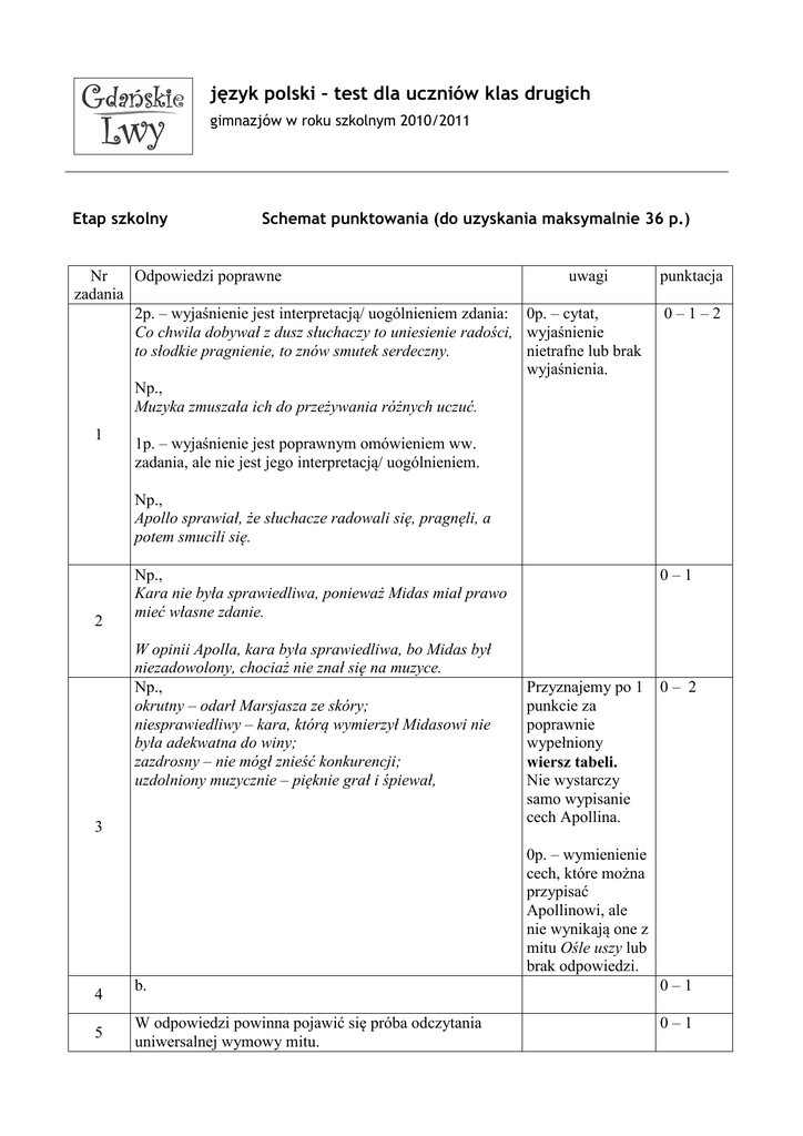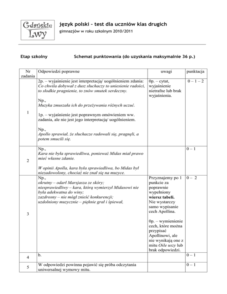 język polski – test dla uczniów klas drugich gimnazjów w roku szkolnym 2010/2011 Etap szkolny Schemat punktowania (do uzyskania maksymalnie 36 p.) Odpowiedzi poprawne uwagi Nr zadania 2p. – wyjaśnienie jest interpretacją/ uogólnieniem zdania: 0p. – cytat, Co chwila dobywał z dusz słuchaczy to uniesienie radości, wyjaśnienie to słodkie pragnienie, to znów smutek serdeczny. nietrafne lub brak wyjaśnienia. Np., Muzyka zmuszała ich do przeżywania różnych uczuć. 1 punktacja 0–1–2 1p. – wyjaśnienie jest poprawnym omówieniem ww. zadania, ale nie jest jego interpretacją/ uogólnieniem. Np., Apollo sprawiał, że słuchacze radowali się, pragnęli, a potem smucili się. 2 Np., Kara nie była sprawiedliwa, ponieważ Midas miał prawo mieć własne zdanie. W opinii Apolla, kara była sprawiedliwa, bo Midas był niezadowolony, chociaż nie znał się na muzyce. Np., okrutny – odarł Marsjasza ze skóry; niesprawiedliwy – kara, którą wymierzył Midasowi nie była adekwatna do winy; zazdrosny – nie mógł znieść konkurencji; uzdolniony muzycznie – pięknie grał i śpiewał, 3 0–1 Przyznajemy po 1 punkcie za poprawnie wypełniony wiersz tabeli. Nie wystarczy samo wypisanie cech Apollina. 0– 2 0p. – wymienienie cech, które można przypisać Apollinowi, ale nie wynikają one z mitu Ośle uszy lub brak odpowiedzi. 4 5 b. 0–1 W odpowiedzi powinna pojawić się próba odczytania uniwersalnej wymowy mitu. 0–1 Np., Postępowanie fryzjera ukazuje, że człowiekowi ciężko żyć ze skrywanym sekretem. 6 7 8 9 10 11 Ukrywanie czegoś jest dla człowieka dużym obciążeniem i nie potrafi sobie z tym poradzić nawet, gdy grozi mu kara. d. a. b. a śmiech, upiorny śmiech, sposób, w jaki się śmieje 0 p. – za wskazanie samej „upiorności”. W odpowiedzi uczeń wskazuje na funkcję „ocieplającą” wizerunek bohatera, rolę wywołania pozytywnych wrażeń czytelnika lub podkreślenia zalet bohatera. 0–1 0–1 0–1 0–1 0–1 0–1 Np., Porównania nadają bohaterowi łagodności i subtelności. Podkreślają jego zalety. W odpowiedzi uczeń wskazuje na skojarzenia związane z nocą – mrok, ciemność, tajemnica; może odwołać się do innych utworów, gatunków np., horrorów. 0–1 12 Np., Noc nadaje się do ukazania drugiego oblicza bohatera, ponieważ jest tajemnicza i mroczna. 2p. – uczeń w interpretacji zwraca uwagę na znaczenie fragmentu : „kochają mnie po wierzchu” 13 0 –1– 2 Np., Kobiety kochają go tylko powierzchownie, zwracają uwagę na to jak wygląda, a nie na to, jakim jest człowiekiem. 1p. – uczeń skupia się tylko na zmianie wyglądu zewnętrznego 14 15 16 17 Np., Kobiety kochają tylko dzienne oblicze bohatera, bo wtedy ładnie wygląda, ale gdy nocą staje się brzydki, rzucają go. a. d. W odpowiedzi musi pojawić się wyjaśnienie związku być dwulicowym lub wskazanie, że zmiana nie zależy od bohatera, nie ma on na nią wpływu. Np., Bohater ma dwa oblicza, bo się zmienia, ale nie jest dwulicowy – czyli fałszywy, obłudny. 1.prawda 2. kłamstwo 3.manipulacja 0–1 0–1 0–1 0–1 Zadanie 18 KRYTERIA OCENY WYPRACOWANIA* Kryteria oceny Punktacja 1 TEMAT (0 - 6 p.) Wybór odpowiedniej postaci literackiej lub filmowej, która ma dwa różne oblicza i nazwanie jej oraz podanie tytułu utworu, z jakiego pochodzi Rozwinięcie obejmuje: a) przedstawienie postaci (np. opis zewnętrzny, pochodzenie, tło historyczne) b) omówienie pierwszego oblicza – przedstawienie co najmniej 2 cech, c) omówienie drugiego oblicza – przedstawienie co najmniej 2 cech, d) zilustrowanie cech przynajmniej jednego z oblicz przykładami zachowań, działań. 0–1 0–1 0–1 0–1 0–1 Podsumowanie (np. ocena postaci, refleksje, wnioski 0–1 2 KOMPOZYCJA (0 - 3 p.)** Tekst ma kompozycję trójdzielną z zachowaniem właściwych proporcji. 0–1 Tekst jest spójny (istnieją językowe nawiązania pomiędzy poszczególnymi 0–1 częściami pracy). Tekst jest logicznie uporządkowany (nie pojawiają się nieuzasadnione 0–1 powtórzenia). 3 JĘZYK I STYL (0 - 4 p.)** Poprawne (pod względem znaczeniowym) słownictwo, również w związkach 0–3 (dopuszczalne frazeologicznych. trzy błędy, Poprawna odmiana wyrazów oraz łączenie wyrazów w zdania i zdań niezależnie od pojedynczych w zdania złożone (nie pojawia się powtarzanie tych samych kategorii) struktur zdaniowych). 3 bł. – 3 pkt Trafnie dobrane środki językowe (nie pojawiają się: wulgaryzmy, nieuzasadnione kolokwializmy, wielosłowie, wieloznaczność, nieuzasadnione 4 bł. – 2 pkt 5 bł. – 1 pkt powtarzanie wyrazów, nadużywanie wyrazów obcych i nieuzasadnionych 6 bł. – 0 pkt wyrażeń typu: praktycznie rzecz biorąc, dajmy na to, powiedzmy). Styl jest funkcjonalny (dostosowany do sytuacji komunikacyjnej, formy 0–1 wypowiedzi). 4 ZAPIS (0 - 3 p.)** Ortografia jest poprawna. 0–2 0 bł. – 2 pkt 1 bł. – 1 pkt 2 bł. – 0 pkt Interpunkcja jest poprawna (dopuszczalne 3 błędy). 0–1 0 – 16 Razem *Za pracę na inny temat lub charakterystykę bohatera niespełniającego któregoś z warunków zawartych w temacie przyznaje się 0 punktów. **Punktów z tych kategorii nie przyznaje się, gdy praca zajmuje mniej niż połowę wyznaczonego miejsca.