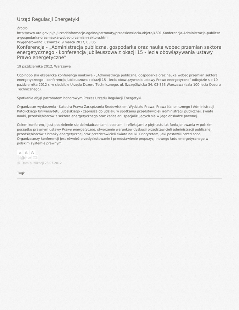 Urząd Regulacji Energetyki Źródło: http://www.ure.gov.pl/pl/urzad/informacje-ogolne/patronaty/przedsiewziecia-objete/4691,Konferencja-Administracja-publiczn a-gospodarka-oraz-nauka-wobec-przemian-sektora.html Wygenerowano: Czwartek, 9 marca 2017, 03:05 Konferencja - „Administracja publiczna, gospodarka oraz nauka wobec przemian sektora energetycznego - konferencja jubileuszowa z okazji 15 - lecia obowiązywania ustawy Prawo energetyczne” 19 października 2012, Warszawa Ogólnopolska ekspercka konferencja naukowa - „Administracja publiczna, gospodarka oraz nauka wobec przemian sektora energetycznego - konferencja jubileuszowa z okazji 15 - lecia obowiązywania ustawy Prawo energetyczne” odbędzie się 19 października 2012 r. w siedzibie Urzędu Dozoru Technicznego, ul. Szczęśliwicka 34, 03-353 Warszawa (sala 100-lecia Dozoru Technicznego). Spotkanie objął patronatem honorowym Prezes Urzędu Regulacji Energetyki. Organizator wydarzenia - Katedra Prawa Zarządzania Środowiskiem Wydziału Prawa, Prawa Kanonicznego i Administracji Katolickiego Uniwersytetu Lubelskiego - zaprasza do udziału w spotkaniu przedstawicieli administracji publicznej, świata nauki, przedsiębiorców z sektora energetycznego oraz kancelarii specjalizujących się w jego obsłudze prawnej. Celem konferencji jest podzielenie się doświadczeniami, ocenami i refleksjami z piętnastu lat funkcjonowania w polskim porządku prawnym ustawy Prawo energetyczne, stworzenie warunków dyskusji przedstawicieli administracji publicznej, przedsiębiorców z branży energetycznej oraz przedstawicieli świata nauki. Priorytetem, jaki postawili przed sobą Organizatorzy konferencji jest również przedyskutowanie i przedstawienie propozycji nowego ładu energetycznego w polskim systemie prawnym. Data publikacji 23.07.2012 Tagi: