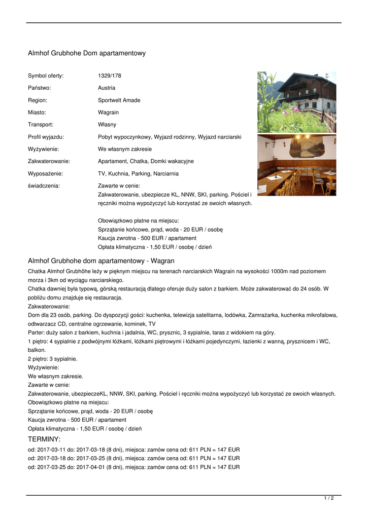 Almhof Grubhohe Dom apartamentowy Symbol oferty: 1329/178 Państwo: Austria Region: Sportwelt Amade Miasto: Wagrain Transport: Własny Profil wyjazdu: Pobyt wypoczynkowy, Wyjazd rodzinny, Wyjazd narciarski Wyżywienie: We własnym zakresie Zakwaterowanie: Apartament, Chatka, Domki wakacyjne Wyposażenie: TV, Kuchnia, Parking, Narciarnia świadczenia: Zawarte w cenie: Zakwaterowanie, ubezpiecze KL, NNW, SKI, parking. Pościel i ręczniki można wypożyczyć lub korzystać ze swoich własnych. Obowiązkowo płatne na miejscu: Sprzątanie końcowe, prąd, woda - 20 EUR / osobę Kaucja zwrotna - 500 EUR / apartament Opłata klimatyczna - 1,50 EUR / osobę / dzień Almhof Grubhohe dom apartamentowy - Wagran Chatka Almhof Grubhöhe leży w pięknym miejscu na terenach narciarskich Wagrain na wysokości 1000m nad poziomem morza i 3km od wyciągu narciarskiego. Chatka dawniej była typową, górską restauracją dlatego oferuje duży salon z barkiem. Może zakwaterować do 24 osób. W pobliżu domu znajduje się restauracja. Zakwaterowanie: Dom dla 23 osób, parking. Do dyspozycji gości: kuchenka, telewizja satelitarna, lodówka, Zamrażarka, kuchenka mikrofalowa, odtwarzacz CD, centralne ogrzewanie, kominek, TV Parter: duży salon z barkiem, kuchnia i jadalnia, WC, prysznic, 3 sypialnie, taras z widokiem na góry. 1 piętro: 4 sypialnie z podwójnymi łóżkami, łóżkami piętrowymi i łóżkami pojedynczymi, łazienki z wanną, prysznicem i WC, balkon. 2 piętro: 3 sypialnie. Wyżywienie: We własnym zakresie. Zawarte w cenie: Zakwaterowanie, ubezpieczeKL, NNW, SKI, parking. Pościel i ręczniki można wypożyczyć lub korzystać ze swoich własnych. Obowiązkowo płatne na miejscu: Sprzątanie końcowe, prąd, woda - 20 EUR / osobę Kaucja zwrotna - 500 EUR / apartament Opłata klimatyczna - 1,50 EUR / osobę / dzień TERMINY: od: 2017-03-11 do: 2017-03-18 (8 dni), miejsca: zamów cena od: 611 PLN = 147 EUR od: 2017-03-18 do: 2017-03-25 (8 dni), miejsca: zamów cena od: 611 PLN = 147 EUR od: 2017-03-25 do: 2017-04-01 (8 dni), miejsca: zamów cena od: 611 PLN = 147 EUR 1/2 od: 2017-04-01 do: 2017-04-08 (8 dni), miejsca: zamów cena od: 611 PLN = 147 EUR od: 2017-04-08 do: 2017-04-15 (8 dni), miejsca: zamów cena od: 626 PLN = 151 EUR od: 2017-04-15 do: 2017-04-22 (8 dni), miejsca: zamów cena od: 611 PLN = 147 EUR CENNIK: Długość pobytu: 8 dni 8 dni Grupa cenowa: C B 14 14 2.5 2.5 Ubezpieczenie (obligatoryjne) (*) Ubezpieczenie KL, NW, SKI (*) Turystyczny Fundusz Gwarancyjny Pobyt w obiekcie (do wyboru) (*) Almhof Grubhohe standardowo dla osób: 23 minimalnie: 1 3071 Rodzaj osoby (do wyboru) Uczestnik (-) 3150 (-) Waluta: EUR Aktualne ceny z systemu S.A.R.T. (-) - cena usługi, podatku kalkulowana przy osobie lub gratis (*) - kwota wliczona w cenę standardową 2/2
