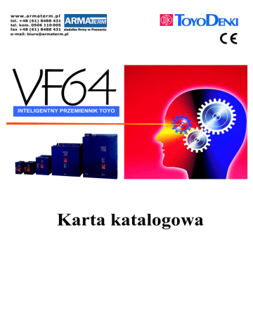 www .arma term .pl tel. +48 (61) 8488 431 tel. kom. 0506 110 005 fax +48 (61) 8488 431 siedziba firmy w Poznaniu e-mail: [email protected] INTELIGENTNY PRZEMIENNIK TOYO Karta katalogowa PRZEMIENNIK TOYO VF64 MOŻE ZREALIZOWAĆ TWOJE IDEE W 100 PROCENTACH Inteligentny przemiennik VF64 produkcji japońskiej firmy TOYO DENKI służy do regulacji prędkości obrotowej silników indukcyjnych klatkowych. Przemiennik ten posiada wbudowane trzy metody sterowania: sterowanie wektorowe z czujnikiem prędkości, sterowanie wektorowe bez czujnika prędkości i sterowanie z kontrolą zależności V/F oparte na metodzie wektorowej. Możliwy jest wybór najbardziej odpowiedniej metody sterowania stosownie do aplikacji. Ponadto przemiennik VF64 posiada nowe funkcje, które dotychczas nie były oferowane w przemiennikach TOYO, w tym między innymi: programowania blokami funkcjonalnymi Super Block, sterownika Sequencer, nadzorowania pracy Trace Back, wizualizacji parametrów pracy Trend Monitor, odczytywania z przemiennika i wczytywania do przemiennika nastaw Console Data Set. Funkcje te mogą być uruchamiane przy użyciu komputera PC. Możliwa jest zmiana programu pracy przemiennika dzięki wyposażeniu go w pamięć typu flash. Dzięki tym funkcjom VF64 może sprostać zarówno wysokim wymaganiom użytkownika jak i różnym obciążeniom silnika. Funkcja Trend Monitor Program Trend Monitor Program Super Block Program Trace Back Program Console Data Set 2 WYSOKA PRECYZJA NAPĘDU Z PRZEMIENNIKIEM VF64 TRZY RODZAJE STEROWANIA SILNIKIEM Przemiennik częstotliwości VF64 posiada trzy tryby sterowania silnikiem. Dla każdego trybu sterowania wybierany jest oddzielny zestaw nastaw. Rozwiązanie takie pozwala na precyzyjniejszą a zarazem łatwiejszą konfigurację i uruchomienie napędu. Sterowanie wektorowe bez czujnika prędkości Zakres regulacji prędkości: 1:150 dla silnika UF 1:75 dla silnika standardowego Stabilizacja obrotów: ±0,5% dla sterowania cyfrowego ±0,5% dla sterowania analogowego Szybkość odpowiedzi: 200rad/s (-3dB) Praca ze stałą stałej mocą w zakresie: 1:4 dla silnika UF Moment rozruchowy: 200% Sterowanie wektorowe z czujnikiem prędkości Zakres regulacji prędkości: 1:1000 dla silnika UF 1:75 dla silnika standardowego Stabilizacja obrotów: ±0,01% dla sterowania cyfrowego ±0,2% dla sterowania analogowego Praca ze stałą mocą w zakresie: 1:4 Szybkość odpowiedzi: 400rad/s (-3dB) Moment rozruchowy: 200% Sterowanie z kontrolą zależności V/f Moment rozruchowy: 150% Zakres częstotliwości: 0,5-400Hz Możliwość kształtowania charakterystyki V/F WYSOKOEFEKTYWNY SYSTEM STEROWANIA FIRMY TOYO DENKI Pozwala na dodatkowe oszczędności energii elektrycznej dzięki zmniejszeniu strumienia magnetycznego w silniku przy jego niedociążeniu. Dodatkowo zastosowane w przemienniku wysokosprawne moduły tranzystorowe (do mocy 55kW włącznie zastosowano Inteligentne Moduły Mocy) zapewniają bardzo wysoką niezawodność i sprawność całego napędu. SYSTEM AUTOMATYCZNEGO DOSTRAJANIA DO SILNIKA Przemiennik został wyposażony w system automatycznego pomiaru najważniejszych stałych elektrycznych silnika. Automatyczne dostrajanie można przeprowadzić dla dwóch silników (każdy z silników ma również własny zestaw nastaw). System ten pozwala na precyzyjne sterowanie w każdym z trybów każdym silnikiem.. PRECYZYJNE ALGORYTMY STEROWANIA PRĘDKOŚCIĄ Bezczujnikowa metoda wektorowa i czujnikowa metoda wektorowa z czujnikiem posiadają wbudowane solidne funkcje kontroli prędkości MFC i PI. Możliwe jest także wybranie innego algorytmu regulacji prędkości a także stworzenie własnego algorytmu regulacji (prędkości, częstotliwości). MFC (Multi Function Control) - algorytm kontroli prędkości oparty na obserwacji równoważnych zaburzeń łączący między innymi "funkcję przewidywania", która kompensuje zmiany momentu przy przyspieszaniu i zwalnianiu oraz "nowoczesną teorię funkcji odwołania". Dzięki MFC następuje zmniejszenie wahań prędkości do minimum niezależnie od gwałtownych zmian zadanej prędkości i obciążenia. Przy kontroli prędkości można użyć selektywnie MFC lub regulacji PI (Proportional Integration). 3 Wykres przedstawiający zależności pomiędzy momentem na wale silnika, prądem wyjściowym przemiennika i prędkością wirowania silnika przy skokowym przyspieszaniu i zwalnianiu. MOŻLIWOŚĆ REGULACJI MOMENTU Przy sterowaniu wektorowym przemiennik może pracować z zadawaniem momentu. Obroty silnika dążą wówczas do takich, przy których moment na wale silnika będzie miał wartość zadaną. Bezczujnikowe sterowanie wektorowe: Zakres regulacji momentu 0-100% Dokładność regulacji momentu 5% Zakres częstotliwości: powyżej 0,4Hz Szybkość regulacji 2krad/s (-3dB) Czujnikowa Metoda Wektorowa: Zakres regulacji momentu 0-100% Dokładność regulacji momentu 3% Zakres częstotliwości: powyżej 0,06Hz Szybkość regulacji 2krad/s (-3dB) Przy pracy ze sterowaniem V/F dzięki własnemu procesowi kontroli momentu możliwa jest praca z ograniczaniem momentu zarówno przy pracy regeneracyjnej jak i przy pracy silnikowej (wartości ograniczania są osobno ustawiane dla pracy silnikowej i regeneracyjnej). Możliwa jest także praca z kontrolą spadku częstotliwości droop jak też z kompensacją poślizgu. MOŻLIWOŚĆ PRACY Z KONTROLĄ ZEROWEJ PRĘDKOŚCI WYJŚCIOWEJ Przy pracy z czujnikową metodą wektorową przemiennik może pracować z zerową prędkością zadawaną. MOŻLIWOŚĆ ZASILANIA PRĄDEM STAŁYM Możliwe jest zasilanie przemiennika prądem stałym. Do zasilania może służyć dowolny zasilacz lub konwerter. Konieczne jest wówczas zapewnienie jedynie odpowiedniego napięcia i wydajności prądowej. MOŻLIWOŚĆ ZASILANIA PRĄDEM STAŁYM WSPÓŁACA Z KONWERTEREM VF61R Przy zastosowaniu do zasilania przemiennika VF64 konwertera VF61R drastycznie zostaje zmniejszona zawartość harmonicznych w prądzie zasilającym. Współczy