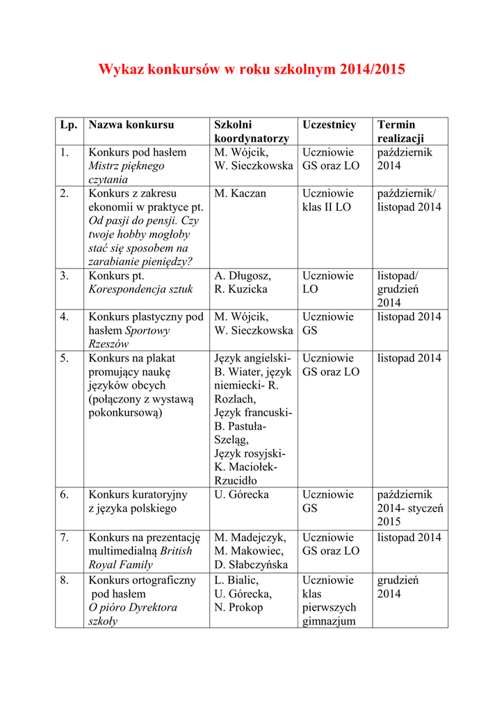 Wykaz konkursów w roku szkolnym 2014/2015 Lp. Nazwa konkursu 1. 2. 3. 4. 5. Konkurs pod hasłem Mistrz pięknego czytania Konkurs z zakresu M. Kaczan ekonomii w praktyce pt. Od pasji do pensji. Czy twoje hobby mogłoby stać się sposobem na zarabianie pieniędzy? Konkurs pt. A. Długosz, Korespondencja sztuk R. Kuzicka Konkurs plastyczny pod hasłem Sportowy Rzeszów Konkurs na plakat promujący naukę języków obcych (połączony z wystawą pokonkursową) 6. Konkurs kuratoryjny z języka polskiego 7. Konkurs na prezentację multimedialną British Royal Family Konkurs ortograficzny pod hasłem O pióro Dyrektora szkoły 8. Szkolni Uczestnicy koordynatorzy M. Wójcik, Uczniowie W. Sieczkowska GS oraz LO Uczniowie klas II LO październik/ listopad 2014 Uczniowie LO listopad/ grudzień 2014 listopad 2014 M. Wójcik, Uczniowie W. Sieczkowska GS Język angielski- Uczniowie B. Wiater, język GS oraz LO niemiecki- R. Rozlach, Język francuskiB. PastułaSzeląg, Język rosyjskiK. MaciołekRzucidło U. Górecka Uczniowie GS M. Madejczyk, M. Makowiec, D. Słabczyńska L. Bialic, U. Górecka, N. Prokop Termin realizacji październik 2014 Uczniowie GS oraz LO Uczniowie klas pierwszych gimnazjum listopad 2014 październik 2014- styczeń 2015 listopad 2014 grudzień 2014 9. 10. 11. 12. 13. 14. Konkurs na plakat przedstawiający Nowy Jork jako miasto wielu kultur New York Melting Pot Konkurs na prezentację multimedialną w Power _Point Miasta rosyjskie Konkurs pod hasłem Sportowiec, który zachwycił mnie swoją osobowością ( w formie ustnej prezentacji) Konkurs wiedzy o Sportowym Rzeszowie (w formie testu) w związku z obchodami 70. rocznicy powstania Klubu Sportowego Stal Rzeszów Szkolny konkurs o Zjednoczonym Królestwie Konkurs na projekt Portrety sławnych sportowców z krajów niemieckojęzycznych 15. Konkursy kuratoryjne 16. Spelling Competitionmiędzyszkolny konkurs znajomości ortografii angielskiej Szkolny konkurs piosenki anglojęzycznej Konkurs wiedzy o Francji Konkurs wiedzy o życiu i twórczości patrona 17. 18. 19. A. PiwińskaMalec, P. Rykiel Uczniowie GS oraz LO grudzień 2014 J. Kryńska, K. MaciołekRzucidło M. Baran, A. Korab Uczniowie klas II i III LO Uczniowie GS grudzień 2014 styczeń 2015 M. Wójcik, Uczniowie W. Sieczkowska LO styczeń 2015 M. Madejczyk, D. Słabczyńska Uczniowie GS oraz LO styczeń 2015 J. Kowalczyk, D. Pacholicka, M. SojaFurman, E. Rozlach J. Kowalczyk Uczniowie GS oraz LO styczeń 2015 Uczniowie GS A. Kwiecień, A. PiwińskaMalec Uczniowie LO październik 2014- styczeń 2015 luty 2015 B. Wiater Uczniowie GS oraz LO Uczniowie GS oraz LO Uczniowie LO B. PastułaSzeląg N. Prokop, M. Zagórska luty 2015 marzec 2015 marzec 2015 20. szkoły, K. K. Baczyńskiego Dzień rosyjski 21. Tydzień Kultury Brytyjskiej 22. Szkolny konkurs języka rosyjskiego 23. Konkurs na prezentację w Power Point dotyczącą Londynu lub Nowego Jorku Międzyszkolny konkurs recytatorski poświęcony twórczości patrona szkoły, K. K. Baczyńskiego Dzień Języka Niemieckiego Limerick Day 24. 25. 26. 27. 28. 29. J. Kryńska, K. MaciołekRzucidło D. Dworak, J. Rożko, P. Rykiel J. Kryńska, K. MaciołekRzucidło A. PiwińskaMalec Uczniowie LO luty/marzec 2015 Uczniowie GS oraz LO marzec 2015 Uczniowie LO kwiecień 2015 Uczniowie LO kwiecień 2015 M. Wójcik, Uczniowie W. Sieczkowska GS oraz LO kwiecień 2015 E. Rozlach, D. Pacholicka J. Rożko Uczniowie GS oraz LO Uczniowie LO Uczniowie klas II gimnazjum maj 2015 Uczniowie GS oraz LO czerwiec 2015 Uczniowie GS oraz LO maj/czerwiec 2015 Szkolny konkurs E. Ryszka matematyczny pod hasłem Potyczki matematyczne Dzień Unii Europejskiej M. Madejczyk, D. Słabczyńska, J. Kowalczyk, M. Soja-Furman Konkurs na prezentację Wszyscy multimedialną Gwiazda nauczyciele światowego sportu we języków obcych wszystkich nauczanych w szkole językach obcych maj 2015 maj 2015 Opracowała: Lucyna Bialic-Paściak