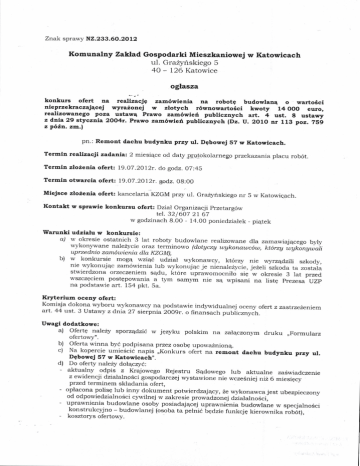Znak sprawy NZ.233.6O.2O 12 Komunalny Zaklad, Gospodarki Mieszkaniowej w Katowicach ul. Grainskiego 5 40 - 126 Katowice oglasza konkurs ofert na ,""ri"aaie zam6wrenia Da robote budowlanq o wartoscl nleprzekraczaJ4ceJ rr5rra2oneJ w zlotych r6wnowartoicr kwoty 14 ooo euro, reallzowanego poza ustswq Pravo zam6wle6 publlcznych art. 4 ust. g ustewy z d^7a29 stycznla 2OO4r. Prawo zam6wieri publlcznych (Dz. U.2OlO nr ll3 poz. ?59 z 962la. zm..l pn.: Remont dachu budynku przy ul. DgboweJ S? w Katowlcach. Termln reallzacJl zadanla: 2 miesi4ce od daty plrotokorarnego przekazania placu rob6t. Termln zloienla ofert: 19.07.2012r. do godz. O7:45 Terrnla otwarcia ofert: !9.OZ.2Ol2r. godz. 0g:00 MleJsce zloaenTa ofert: kancelari a KZGM przy ul. Gra2ynskiego nr 5 w Katowieach. Kontakt w sprawle konkursu ofert: Dzial Organizacji przetargow tel.32/607 21 67 w go&inach 8.00 - 14.00 poniedzialek - pi4tek Warunki udzlalu w konkursle: a,i w okresie ostatnich 3 lat roboty budowlane realizowane dla zamawiaj4cego byly wykonJ,.wane nale2ycie or2z, terminowo (dotgczg ulgkonau.rc6ut, XtOa iiyiSigwati upnednio zam6wienia dla KZGM), b) w. konkursie mogA wziqi. udzial wykonawcy, kt6rzy nie wyrz4dzili szkody, nie wykonuj4c zamowienia lub wykonuj.c je nienale2ycie, szkoda ta zostara stwierdzona orzeczeniem sqdu, ktore upriwomocnilo sig le2eri w okresie 3 lat Drzed wszczgclem postepowania a tym samym nie s4 wpisani na liste prezesa UZp na podstawie art. 154 pkt. 5a. Kr5rterlun oceny ofert: Komisja dokona wyboru wykonawcy na podstawie indl.widualnej oceny ofert z zastrzezenrem art. 44 ust. 3 Ustawy z dnia 27 sierpnia 2O09r. o finansach publicznvch. Uwagl dodatkowe: a) Oferte naleiry sporz4dzii w jgzyku polskim na zal4czonyrn druku ,Formularz ofertowy". b) Oferta winna byi podpisana przez osobg upowa2nron4. c) Na kopercie umieScii napis ,Konkurs ofert na renont dachu budynku przy ul. DgboweJ 57 w Katowlcach". d) Do oferty naleiry dol4czyi: - aktualny odpis z Krajowego Rejestru S4dowego lub aktualne zaswiadczenie z ewidencji dzialalno6ci gospodarczej wystawione nie wczeSniej ni2 6 miesigcy przed terminem skladania ofert. - oplacona polisg lub inny dokument- potwierdzajqcy, 2e wykonawca jest ubezpieczony od odpowiedzialnoSci cyvilnej w zakresie prowadzone.l dzlatatnoSci] - uprawnienia budowlane_ osoby posiadaj4cej uprawniinia budowlane w specjalnosci konstrukcyjno - budowlanei (osoba ta pelnii bgdzie funkcjg kierownita .ird[ - kosztorvs ofertowv. Wykonawca musl wykazai sie doSwiadczeniem zawodowym polegajacym na tym, 2e w okresie ostatnich 5 lat wykonal co najmniej jedn4 robote budowlan4 polegaj4c4 na robotach dekarskich o wartoSci nie mniejszej ni2 3.OOO,0O zl brutto. Zamawiaj4cy z.amieSci informacje o wyniku konkursu na stronie internetowej oraz powiadomi wylonionego Wykonawce. Zalaczallft' opis prz.edmiatu zanwuieniq wzdrfom larza ofertg, wz6runuug, przedmiar rob6t.