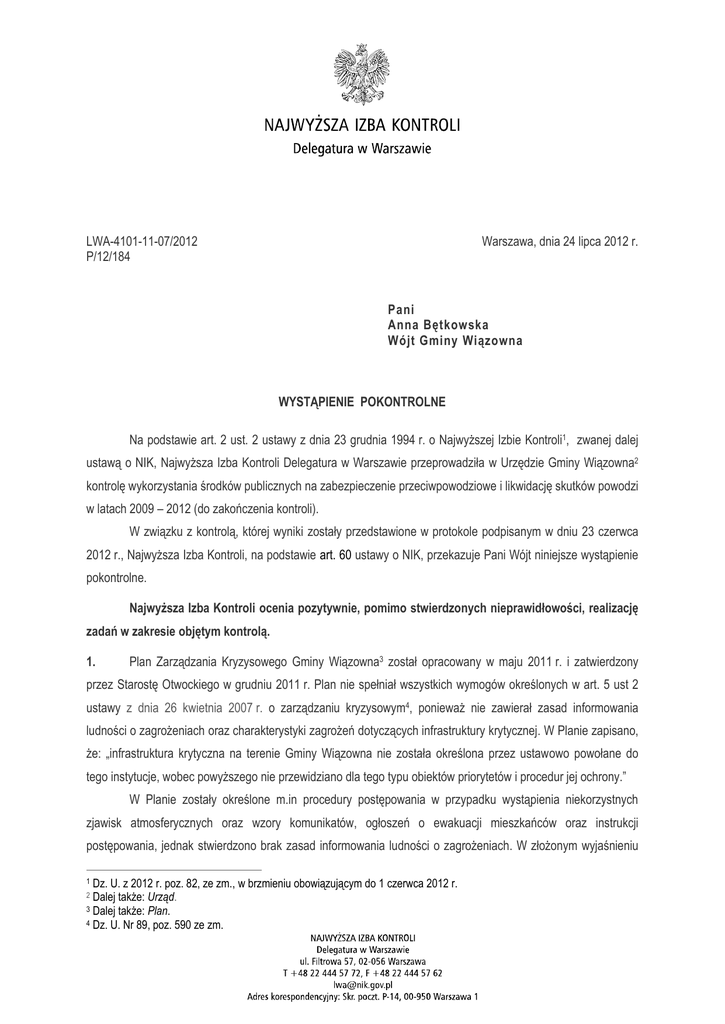 LWA-4101-11-07/2012 P/12/184 Warszawa, dnia 24 lipca 2012 r. Pani Anna Bętkowska Wójt Gminy Wiązowna WYSTĄPIENIE POKONTROLNE Na podstawie art. 2 ust. 2 ustawy z dnia 23 grudnia 1994 r. o Najwyższej Izbie Kontroli1, zwanej dalej ustawą o NIK, Najwyższa Izba Kontroli Delegatura w Warszawie przeprowadziła w Urzędzie Gminy Wiązowna2 kontrolę wykorzystania środków publicznych na zabezpieczenie przeciwpowodziowe i likwidację skutków powodzi w latach 2009 – 2012 (do zakończenia kontroli). W związku z kontrolą, której wyniki zostały przedstawione w protokole podpisanym w dniu 23 czerwca 2012 r., Najwyższa Izba Kontroli, na podstawie art. 60 ustawy o NIK, przekazuje Pani Wójt niniejsze wystąpienie pokontrolne. Najwyższa Izba Kontroli ocenia pozytywnie, pomimo stwierdzonych nieprawidłowości, realizację zadań w zakresie objętym kontrolą. 1. Plan Zarządzania Kryzysowego Gminy Wiązowna3 został opracowany w maju 2011 r. i zatwierdzony przez Starostę Otwockiego w grudniu 2011 r. Plan nie spełniał wszystkich wymogów określonych w art. 5 ust 2 ustawy z dnia 26 kwietnia 2007 r. o zarządzaniu kryzysowym4, ponieważ nie zawierał zasad informowania ludności o zagrożeniach oraz charakterystyki zagrożeń dotyczących infrastruktury krytycznej. W Planie zapisano, że: „infrastruktura krytyczna na terenie Gminy Wiązowna nie została określona przez ustawowo powołane do tego instytucje, wobec powyższego nie przewidziano dla tego typu obiektów priorytetów i procedur jej ochrony.” W Planie zostały określone m.in procedury postępowania w przypadku wystąpienia niekorzystnych zjawisk atmosferycznych oraz wzory komunikatów, ogłoszeń o ewakuacji mieszkańców oraz instrukcji postępowania, jednak stwierdzono brak zasad informowania ludności o zagrożeniach. W złożonym wyjaśnieniu Dz. U. z 2012 r. poz. 82, ze zm., w brzmieniu obowiązującym do 1 czerwca 2012 r. Dalej także: Urząd. 3 Dalej także: Plan. 4 Dz. U. Nr 89, poz. 590 ze zm. 1 2 Wójt Gminy podała, że w przypadku zaistnienia sytuacji kryzysowej informacje i komunikaty przekazywane są mieszkańcom przez sołtysów oraz umieszczane na stronie internetowej Urzędu.5 2. Analiza działań Gminnego Zespołu Zarządzania Kryzysowego6 podczas sytuacji kryzysowych w lipcu i sierpniu 2011 r. wykazała, że Urząd współpracował z jednostkami Państwowej Straży Pożarnej i Powiatowym Centrum Zarządzania Kryzysowego oraz podejmował działania na rzecz utrzymania gotowości bojowej Ochotniczych Straży Pożarnych na terenie Gminy (m.in. w tym celu Urząd przekazał w 2011 r. dotacje dla OSP w kwocie 300,5 tys. zł). Stwierdzono jednak, że GZZK nie realizował zadań w zakresie monitorowania, oceny i prognozowania potencjalnych zagrożeń mogących mieć wpływ na bezpieczeństwo publiczne. Obowiązek realizacji tych zadań przez GZZK został określony w art. 19 ust. 5 w związku z art. 14 ust. 8 pkt 1 ustawy o zarządzaniu kryzysowym oraz w § 2 pkt 7 zarządzenia Wojewody Mazowieckiego w sprawie zadań realizowanych przez wójtów w zakresie Krajowego Systemu Ratowniczo-Gaśniczego na obszarze gminy w województwie mazowieckim7. Analiza dokumentacji wykazała, że GZZK nie planował i nie odbywał posiedzeń związanych z monitorowaniem potencjalnych zagrożeń, pomimo iż zadania te zostały określone w regulaminie Zespołu, a w zarządzeniu Wójta w sprawie powołania GZZK8 zapisano, że w jego skład chodzi m. in. grupa monitorowania, prognoz i analiz. Ponadto ustalono, że Urząd nie prowadził bazy danych o instytucjach i przedsiębiorstwach działających na terenie gminy, posiadających środki, sprzęt i urządzenia, które mogą być użyte do prowadzenia działań ratowniczych. Było to niezgodne z § 2 pkt 8 przywołanego Zarządzenia Wojewody Mazowieckiego. Wójt Gminy wyjaśniła, że baza ww. danych jest w fazie kompletowania dokumentacji9 Do zakończenia kontroli NIK, Wójt nie zawarł żadnych umów lub porozumień o współpracy z sąsiednimi gminami lub innymi podmiotami, w celu zapewnienia realizacji zadań określonych w Gminnym Planie Zarządzania Kryzysowego dotyczących m. in. monitorowania i przekazywania informacji o sytuacjach kryzysowych oraz współdziałania w przypadku ich wystąpienia. 3. W wyniku kontroli sprawdzającej, przeprowadzonej w Urzędzie w grudniu 2011 r., NIK oceniła negatywnie system kształcenia służb zarządzania kryzysowego w Gminie w 2011 r., z uwagi na nieprzeprowadzenie pięciu z sześciu zaplanowanych szkoleń z zakresu zarządzania kryzysowego. Na 2012 r. zaplanowano trzy szkolenia z zakresu zarządzania kryzysowego, z których dotychczas przeprowadzono jedno (przeszkolono 23 sołtysów), pozostałe szkolenia zaplanowano do realizacji we wrześniu i październiku 2012 r. Ponadto w marcu i kwietniu 2012 r. Wójt Gminy uczestniczyła w dwóch szkoleniach z zakresu zarządzania kryzysowego, zorganizowanych przez Mazowiecki Urząd Wojewódzki Wydział Bezpieczeństwa i Zarządzania Kryzysowego Pismo z dnia 1 czerwca 2012 r. Dalej: GZZK lub Zespół. 7 Zarządzenie nr 87 Wojewody Mazowieckiego z 25 marca 2010 r. 8 Zarządzenie Nr 37/2011 z dnia 5 kwietnia 2011 r. 9 Pismo z dnia 1 czerwca 2012 r. 5 6 2 4. Plan Zarządzania Kryzysowego Gminy Wiązowna zawierał katalog możliwych klęsk żywiołowych oraz ocenę ryzyka ich wystąpienia na terenie Gminy (w tym. m. in. powodzi), a także określenie ich ewentualnych skutków i obszarów zagrożonych. Ustalono również procedury reagowania kryzysowego, określające sposób postępowania w sytuacjach kryzysowych, w tym zadania dla GZZK. Analiza dokumentacji dotyczącej podtopień z lipca i sierpnia 2011 r wykazała, że działania GZZK realizowane były zgodnie z przyjętymi procedurami i dokumentowane w kartach zdarzenia, protokołach z posiedzeń GZZK oraz sprawozdaniach końcowych. 5. Ustalono, że Wójt zapewnił realizację zadań określonych w art. 20 ust. 1 ustawy o zarządzaniu kryzysowym, 