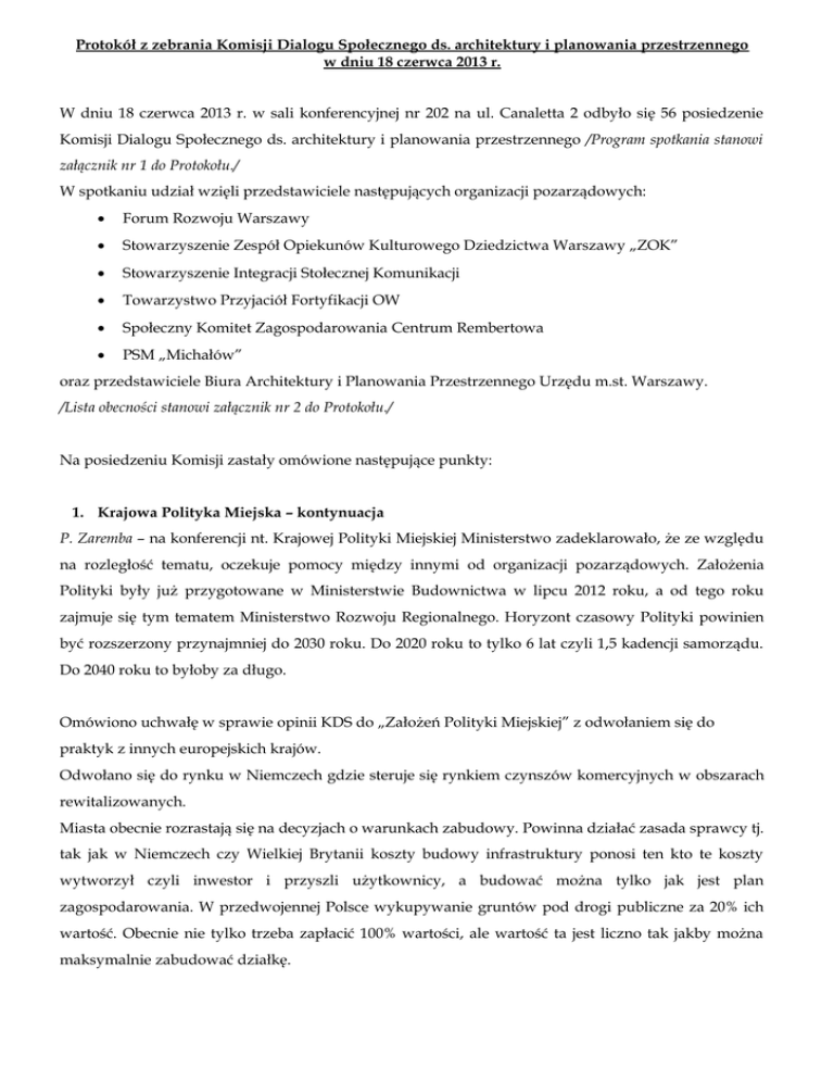 Protokół z zebrania Komisji Dialogu Społecznego ds. architektury i planowania przestrzennego w dniu 18 czerwca 2013 r. W dniu 18 czerwca 2013 r. w sali konferencyjnej nr 202 na ul. Canaletta 2 odbyło się 56 posiedzenie Komisji Dialogu Społecznego ds. architektury i planowania przestrzennego /Program spotkania stanowi załącznik nr 1 do Protokołu./ W spotkaniu udział wzięli przedstawiciele następujących organizacji pozarządowych: Forum Rozwoju Warszawy Stowarzyszenie Zespół Opiekunów Kulturowego Dziedzictwa Warszawy „ZOK” Stowarzyszenie Integracji Stołecznej Komunikacji Towarzystwo Przyjaciół Fortyfikacji OW Społeczny Komitet Zagospodarowania Centrum Rembertowa PSM „Michałów” oraz przedstawiciele Biura Architektury i Planowania Przestrzennego Urzędu m.st. Warszawy. /Lista obecności stanowi załącznik nr 2 do Protokołu./ Na posiedzeniu Komisji zastały omówione następujące punkty: 1. Krajowa Polityka Miejska – kontynuacja P. Zaremba – na konferencji nt. Krajowej Polityki Miejskiej Ministerstwo zadeklarowało, że ze względu na rozległość tematu, oczekuje pomocy między innymi od organizacji pozarządowych. Założenia Polityki były już przygotowane w Ministerstwie Budownictwa w lipcu 2012 roku, a od tego roku zajmuje się tym tematem Ministerstwo Rozwoju Regionalnego. Horyzont czasowy Polityki powinien być rozszerzony przynajmniej do 2030 roku. Do 2020 roku to tylko 6 lat czyli 1,5 kadencji samorządu. Do 2040 roku to byłoby za długo. Omówiono uchwałę w sprawie opinii KDS do „Założeń Polityki Miejskiej” z odwołaniem się do praktyk z innych europejskich krajów. Odwołano się do rynku w Niemczech gdzie steruje się rynkiem czynszów komercyjnych w obszarach rewitalizowanych. Miasta obecnie rozrastają się na decyzjach o warunkach zabudowy. Powinna działać zasada sprawcy tj. tak jak w Niemczech czy Wielkiej Brytanii koszty budowy infrastruktury ponosi ten kto te koszty wytworzył czyli inwestor i przyszli użytkownicy, a budować można tylko jak jest plan zagospodarowania. W przedwojennej Polsce wykupywanie gruntów pod drogi publiczne za 20% ich wartość. Obecnie nie tylko trzeba zapłacić 100% wartości, ale wartość ta jest liczno tak jakby można maksymalnie zabudować działkę. Ważne jest zagadnienie ponadgminnego finansowania i pokrywania kosztów eksploatacji inwestycji na terenie sąsiedniej gminy. Np. tramwaj na trasie Warszawa - Ząbki byłby cenny dla Ząbek, ale Warszawie się nie opłaca. A Ząbki nie mogą go sfinansować, bo w 80% byłby na terenie Warszawy. Miasta w Polsce dynamiczniej współpracują z zagranicznymi miastami partnerskimi niż z ościennymi gminami. Dla polskich miast bardziej liczą się korzyści indywidualne. Przykładem jest wskazany przez T. Peszke – ZTM w rozmowach o wspólnym bilecie gdzie opiera się na mocno szacunkowych danych, zamiast na twardych danych. Planowanie powinno odbywać się na poziomie aglomeracji, a nie gminy. P. Zaremba – Bardzo istotne jest zapewnienie możliwości wprowadzenia opłat za wjazd do centrum. Śródmieście Warszawy jest jeszcze niewykształcone i niegotowe na wprowadzenie opłat za wjazd już dziś. W perspektywie 2 - 3 kadencji samorządu jest realne. Już z dwoma liniami metra Śródmieście będzie łatwo dostępne z 4 stron. T. Peszke – Polityka powinna kłaść nacisk na konkurencyjność polskich miast wobec aglomeracji w Europie Zachodniej nie tylko wśród inwestorów, ale i mieszkańców. W. Potęga – Miasta będą mieć coraz większą rolę/moc niż państwa. Koszty pracy i zarobki w Polsce się wielokrotnie niższe i stąd wynika nasza atrakcyjność. Polityka Miejska powinna wypracować inne atrakcyjności. T. Peszke – Warszawa rozwija się w sposób niezrównoważony, chaotyczny i nieprzemyślany, co powoduje problemy budżetowe. Lewobrzeżna Warszawa z XIX-wieczną zabudową rozwija się lepiej niż prawobrzeżna. Następuje rozwój nie tylko wzdłuż linii kolejowych, ale zabudowywane też są zielone przedmieścia, które nie są skomunikowane. J. Kuskowski – Do uchwały warto dodać dwa punkty: 1) zachęta finansowa ze strony państwa, 2) budowanie tożsamości metropolitalnej mieszkańców. S.Fuglewiczi – Urząd marszałkowski przeprowadzał badania, z których wynikło, że mieszkańcy mało identyfikują się z powiatem. P. Zaremba – wskazał na brak edukacji/świadomości, że prawo własności nie jest jednoznaczne z prawem zabudowy, jest groźny. M. Mikos – Bardzo niebezpieczne są roszczenia na terenach na których stoją szkoły i na terenach zieleni. Brak jest kategorii zieleni publicznej oprócz zabytkowej. Zieleń nie jest celem publicznym według art. 6 ustawy gospodarki nieruchomościami. Uchwała nr 4 – Głosowanie: Za 6 Przeciw 0 Wstrzymało się 0 2. Informacja BAiPP na temat prac w aktualnych procedurach planistycznych Na posiedzeniu zostały przekazane informacje dotyczące aktualnych procedur planistycznych przeprowadzonych przez Biuro Architektury i Planowania Przestrzennego Urzędu m.st. Warszawy /Informacja stanowi załącznik nr 3 do Protokołu./ 3. Wolne wnioski Nie zgłoszono wolnych wniosków Na tym spotkanie zostało zakończone. Ustalono termin kolejnego spotkania na dzień 17 września b.r. Protokół sporządzili: Maria Zielińska i Sylwia Kośnik, Biuro Architektury i Planowania Przestrzennego Urzędu m.st. Warszawy