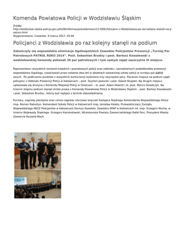 Komenda Powiatowa Policji w Wodzisławiu Śląskim Źródło: http://wodzislaw.slaska.policja.gov.pl/k28/informacje/wiadomosci/117006,Policjanci-z-Wodzislawia-po-raz-kolejny-staneli-na-p odium.html Wygenerowano: Czwartek, 9 marca 2017, 03:04 Policjanci z Wodzisławia po raz kolejny stanęli na podium Zakończyły się wojewódzkie eliminacje Ogólnopolskich Zawodów Policjantów Prewencji „Turniej Par Patrolowych PATROL ROKU 2014”. Post. Sebastian Brudny i post. Bartosz Kowalewski z wodzisławskiej komendy pokonali 36 par patrolowych i tym samym zajęli zaszczytne III miejsce. Reprezentanci wszystkich komend miejskich i powiatowych policji oraz oddziału i samodzielnych pododdziałów prewencji województwa śląskiego, rywalizowali przez ostatnie dwa dni w obiektach katowickiej szkoły policji w turnieju par patrol owych. Po podliczeniu punktów z wszystkich konkurencji wyłoniono trzy zwycięskie pary. Pierwsze miejsce na podium zajęli policjanci z Oddziału Prewencji Policji w Katowicach – post. Szymon Jaworski i post. Dawid Skupień. Na drugim miejscu uplasowała się drużyna z Komendy Miejskiej Policji w Gliwicach – st. post. Adam Nowrot i st. post. Marcin Dziadczyk. Na trzecim stopniu podium stanęli stróże prawa z Komendy Powiatowej Policji w Wodzisławiu Śląskim – post. Bartosz Kowalewski i post. Sebastian Brudny., którzy byli najlepsi z technik obezwładniania. Puchary, nagrody pieniężne oraz cenne nagrody rzeczowe wręczali Zastępca Śląskiego Komendanta Wojewódzkiego Policji insp. Roman Rabsztyn, Komendant Szkoły Policji w Katowicach insp. Jarosław Kaleta, Przewodniczący Zarządu Wojewódzkiego NSZZ Policjantów w Katowicach Dariusz Kowalski, Dowódca SPAP w Katowicach mł. insp. Grzegorz Mucha, w imieniu Wojewody Śląskiego- Grzegorz Kamieniowski, Wicestarosta Powiatu Zawierciańskiego Rafał Porc, Prezydent Miasta Zawiercie Ryszard Mach. Ocena: 0/5 (0) Tweetnij