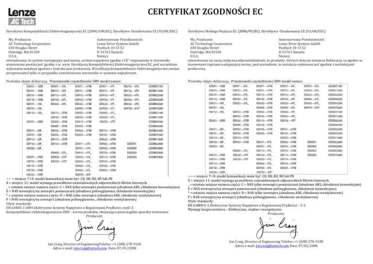 CERTYFIKAT ZGODNOŚCI EC Dyrektywa Kompatybilności Elektromagnetycznej EC (2004/108/EC), Dyrektywa Oznakowania CE (93/68/EEC) Dyrektywa Niskiego Napięcia EC (2006/95/EC), Dyrektywa Oznakowania CE (93/68/EEC) My, Producent: Autoryzowany Przedstawiciel: AC Technology Corporation Lenze Drive Systems GmbH 630 Douglas Street Postfach 10 13 52 Uxbridge, MA 01569 D-31763 Hameln U.S.A. Niemcy oświadczamy, że system występujący pod nazwą „system napędowy zgodny z CE” wyposażony w sterowniki wymienione poniżej jest zgodny z w. wym. Dyrektywą Kompatybilności Elektromagnetycznej EC, pod warunkiem wykonania instalacji zgodnie z instrukcjami producenta. Weryfikację kompatybilności elektromagnetycznej można przeprowadzić tylko w przypadku zamontowania sterownika w systemie napędowym. My, Producent: Autoryzowany Przedstawiciel: AC Technology Corporation Lenze Drive Systems GmbH 630 Douglas Street Postfach 10 13 52 Uxbridge, MA 01569 D-31763 Hameln U.S.A. Niemcy oświadczamy na naszą wyłączną odpowiedzialność, że produkty, których dotyczy niniejsza Deklaracja, są zgodne ze stosownymi zapisami następującej normy, pod warunkiem, że instalacja wykonana jest zgodnie z instrukcjami producenta. Produkty objęte deklaracją: Przemienniki częstotliwości SMV model numer: Produkty objęte deklaracją: Przemienniki częstotliwości SMV model numer: ~~ = miejsce 7 i 8: model komunikacji może być C0, D0, R0, N0 lub P0 X = miejsce 11: model wymaga prawidłowo zainstalowanych odpowiednich filtrów liniowych. _ = ostatnie miejsce numeru części: C = N4X tylko wewnątrz pomieszczeń (obudowa ABS, chłodzenie konwekcyjne) E = N4X wewnątrz/na zewnątrz pomieszczeń (obudowa poliwęglanowa, chłodzenie konwekcyjne) * = ostatnie miejsce numeru części: D = N4X tylko wewnątrz (obudowa ABS, chłodzenie wentylatorem) F = N4X wewnątrz/na zewnątrz (obudowa poliwęglanowa , chłodzenie wentylatorem) Użyte standardy: EN 61800-3 2004 Elektryczne Systemy Napędowe o Regulowanej Prędkości, część 3: Kompatybilność elektromagnetyczna EMC - norma produktu, obejmująca poszczególne sposoby testowania Producent: Jim Craig, Director of EngineeringTelefon: +1 (508) 278-9100 Adres e-mail: [email protected] Data: 07/01/2008 ~~ = miejsce 7 i 8: model komunikacji może być C0, D0, R0, N0 lub P0 X = miejsce 11: model wymaga prawidłowo zainstalowanych odpowiednich filtrów liniowych. _ = ostatnie miejsce numeru części: C = N4X tylko wewnątrz pomieszczeń (obudowa ABS, chłodzenie konwekcyjne) E = N4X wewnątrz/na zewnątrz pomieszczeń (obudowa poliwęglanowa, chłodzenie konwekcyjne) * = ostatnie miejsce numeru części: D = N4X tylko wewnątrz (obudowa ABS, chłodzenie wentylatorem) F = N4X wewnątrz/na zewnątrz (obudowa poliwęglanowa , chłodzenie wentylatorem) Użyte standardy: EN 61800-5-1 Elektryczne Systemy Napędowe o Regulowanej Prędkości – 5-1: Wymogi bezpieczeństwa – Elektryczne, cieplne i energetyczne Producent: Jim Craig, Director of Engineering Telefon: +1 (508) 278-9100 Adres e-mail: [email protected] Data: 07/01/2008