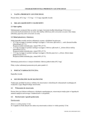 CHARAKTERYSTYKA PRODUKTU LECZNICZEGO 1. NAZWA PRODUKTU LECZNICZEGO Persen forte, (87,5 mg + 17,5 mg + 17,5 mg), kapsułki twarde 2. SKŁAD JAKOŚCIOWY I ILOŚCIOWY 2.1 Opis ogólny Substancjami czynnymi leku są suche wyciągi z korzenia kozłka lekarskiego (Valerianae extractum hydroalcoholicum siccum), liści melisy (Melissae folii extractum siccum) i liści mięty (Menthae piperitae folii extractum siccum). 2.2 Skład jakościowy i ilościowy Jedna kapsułka twarda zawiera substancje czynne o działaniu leczniczym: 87,5 mg wyciągu (w postaci suchego wyciągu) z Valeriana officinalis L., radix (korzeń kozłka lekarskiego) (4-7:1) Rozpuszczalnik ekstrakcyjny: etanol 70% (V/V). 17,5 mg wyciągu (w postaci suchego wyciągu) z Melissa officinalis L., folium (liście melisy lekarskiej) (3-6:1). Rozpuszczalnik ekstrakcyjny: etanol 50% (V/V). 17,5 mg wyciągu (w postaci suchego wyciągu) z Mentha piperita L., folium, (liście mięty pieprzowej) (3-6:1). Rozpuszczalnik ekstrakcyjny: etanol 40% (V/V). Substancja pomocnicza o znanym działaniu: laktoza jednowodna (85,5 mg) Pełny wykaz substancji pomocniczych, patrz punkt 6.1. 3. POSTAĆ FARMACEUTYCZNA Kapsułka twarda 4. SZCZEGÓŁOWE DANE KLINICZNE Tradycyjny produkt leczniczy roślinny do stosowania w określonych wskazaniach wynikających wyłącznie z jego długotrwałego stosowania. 4.1 Wskazania do stosowania Persen forte jest lekiem roślinnym o działaniu uspokajającym, stosowanym tradycyjnie w łagodnych stanach napięcia nerwowego i trudnościach w zasypianiu. 4.2 Dawkowanie i sposób podawania Dawkowanie Dzieci w wieku poniżej 12 lat. Ze względu na brak danych nie zaleca się stosowania u dzieci w wieku poniżej 12 lat. 1 UR.DZL.ZLN.4020.00419.2015 Młodzież w wieku powyżej 12 lat, dorośli i osoby w podeszłym wieku W łagodnych stanach napięcia nerwowego 1 lub 2 kapsułki dwa lub trzy razy na dobę. W trudnościach w zasypianiu 2 kapsułki 1/2 do 1 godziny przed snem. Maksymalna dawka dobowa: 6 kapsułek. Działanie lecznicze obserwuje się w okresie od 2 do 4 tygodni. Sposób podawania Kapsułki można przyjmować niezależnie od posiłków, popijając niewielką ilością wody. 4.3 Przeciwwskazania Nadwrażliwość na substancje czynne, mentol lub na którąkolwiek substancję pomocniczą wymienioną w punkcie 6.1. 4.4 Specjalne ostrzeżenia i środki ostrożności dotyczące stosowania Nie zaleca się stosowania produktu Persen forte u dzieci w wieku poniżej 12 lat ze względu na brak dostępnych danych w tej grupie wiekowej. Zaleca się ostrożność podczas stosowania preparatów zawierających liście mięty pieprzowej lub ich przetwory u pacjentów z kamicą żółciową i innymi chorobami dróg żółciowych. Pacjenci z refluksem żołądkowo-przełykowym powinni unikać stosowania mięty, gdyż może ona nasilić zgagę. Szczególne ostrzeżenia dotyczące substancji pomocniczych Kapsułki Persen forte zawierają laktozę. Nie powinny być stosowane u pacjentów z rzadko występującą dziedziczną nietolerancją galaktozy, niedoborem laktazy (typu Lapp) lub zespołem złego wchłaniania glukozy-galaktozy. 4.5 Interakcje z innymi produktami leczniczymi i inne rodzaje interakcji Nie przeprowadzono badań interakcji lekowych z zastosowaniem tego produktu leczniczego. Dostępne dane dotyczące interakcji farmakologicznych wyciągu z korzenia kozłka lekarskiego z innymi produktami leczniczymi są ograniczone. Nie obserwowano istotnych klinicznie interakcji z lekami metabolizowanymi z udziałem izoenzymów CYP2D6, CYP3A4/5, CYP1A2 lub CYP2E1. Nie zaleca się jednoczesnego stosowania produktu leczniczego Persen forte i syntetycznych leków uspokajających. Podczas stosowania produktu leczniczego Persen forte nie należy pić napojów alkoholowych. 4.6 Wpływ na płodność, ciążę i laktację Ciąża Ze względu na brak danych nie zaleca się stosowania produktu Persen forte u kobiet w ciąży. Karmienie piersią Ze względu na brak danych nie zaleca się stosowania produktu Persen forte u kobiet karmiących piersią. Płodność Brak danych dotyczących wpływu na płodność. 2 UR.DZL.ZLN.4020.00419.2015 4.7 Wpływ na zdolność prowadzenia pojazdów i obsługiwania maszyn Persen forte może zaburzać zdolność prowadzenia pojazdów i obsługiwania maszyn. W takim przypadku nie należy prowadzić pojazdów ani obsługiwać maszyn. 4.8 Działania niepożądane Po zażyciu preparatów korzenia kozłka lekarskiego mogą wystąpić objawy ze strony przewodu pokarmowego (np. nudności, skurcze brzucha). Częstość tych zaburzeń nie jest znana. Po zażyciu preparatów zawierających liście mięty pieprzowej mogą nasilić się objawy refluksu żołądkowo-przełykowego, w tym zgagi. Patrz również punkt 4.4. W razie wystąpienia innych, niewymienionych wyżej działań niepożądanych, należy skonsultować się z lekarzem lub farmaceutą. Zgłaszanie podejrzewanych działań niepożądanych Po dopuszczeniu produktu leczniczego do obrotu istotne jest zgłaszanie podejrzewanych działań niepożądanych. Umożliwia to nieprzerwane monitorowanie stosunku korzyści do ryzyka stosowania produktu leczniczego. Osoby należące do fachowego personelu medycznego powinny zgłaszać wszelkie podejrzewane działania niepożądane za pośrednictwem Departamentu Monitorowania Niepożądanych Działań Produktów Leczniczych Urzędu Rejestracji Produktów Leczniczych, Wyrobów Medycznych i Produktów Biobójczych: Al. Jerozolimskie 181C, 02-222 Warszawa tel.: + 48 22 49 21 301/faks: + 48 22 49 21 309/e-mail: [email protected] 4.9 Przedawkowanie Przedawkowanie korzenia kozłka (około 20 g, co odpowiada w przybliżeniu 40 kapsułkom) może powodować łagodne objawy, takie jak uczucie zmęczenia, kurcze brzucha, ucisk w klatce piersiowej, zawroty głowy, drżenie rąk i rozszerzenie źrenic. Objawy te ustępują w ciągu 24 godzin. W razie nasilenia objawów należy zastosować leczenie podtrzymujące. Nie ma doniesień o przedawk