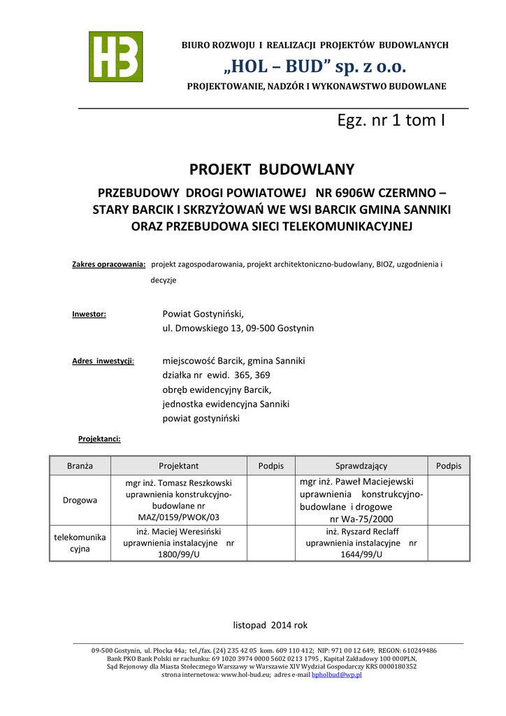 BIURO ROZWOJU I REALIZACJI PROJEKTÓW BUDOWLANYCH „HOL – BUD” sp. z o.o. PROJEKTOWANIE, NADZÓR I WYKONAWSTWO BUDOWLANE Egz. nr 1 tom I PROJEKT BUDOWLANY PRZEBUDOWY DROGI POWIATOWEJ NR 6906W CZERMNO – STARY BARCIK I SKRZYŻOWAŃ WE WSI BARCIK GMINA SANNIKI ORAZ PRZEBUDOWA SIECI TELEKOMUNIKACYJNEJ Zakres opracowania: projekt zagospodarowania, projekt architektoniczno-budowlany, BIOZ, uzgodnienia i decyzje Inwestor: Powiat Gostyniński, ul. Dmowskiego 13, 09-500 Gostynin Adres inwestycji: miejscowość Barcik, gmina Sanniki działka nr ewid. 365, 369 obręb ewidencyjny Barcik, jednostka ewidencyjna Sanniki powiat gostyniński Projektanci: Branża Projektant Podpis Sprawdzający Drogowa mgr inż. Tomasz Reszkowski uprawnienia konstrukcyjnobudowlane nr MAZ/0159/PWOK/03 mgr inż. Paweł Maciejewski uprawnienia konstrukcyjnobudowlane i drogowe nr Wa-75/2000 telekomunika cyjna inż. Maciej Weresiński uprawnienia instalacyjne nr 1800/99/U inż. Ryszard Reclaff uprawnienia instalacyjne nr 1644/99/U Podpis listopad 2014 rok 09-500 Gostynin, ul. Płocka 44a; tel./fax. (24) 235 42 05 kom. 609 110 412; NIP: 971 00 12 649; REGON: 610249486 Bank PKO Bank Polski nr rachunku: 69 1020 3974 0000 5602 0213 1795 , Kapitał Zakładowy 100 000PLN, Sąd Rejonowy dla Miasta Stołecznego Warszawy w Warszawie XIV Wydział Gospodarczy KRS 0000180352 strona internetowa: www.hol-bud.eu; adres e-mail [email protected] BIURO ROZWOJU I REALIZACJI PROJEKTÓW BUDOWLANYCH „HOL – BUD” sp. z o.o. PROJEKTOWANIE, NADZÓR I WYKONAWSTWO BUDOWLANE Egz. nr 1 tom. I PROJEKT BUDOWLANY PRZEBUDOWY DROGI POWIATOWEJ NR 6906W CZERMNO – STARY BARCIK I SKRZYŻOWAŃ WE WSI BARCIK GMINA SANNIKI ORAZ PRZEBUDOWA SIECI TELEKOMUNIKACYJNEJ Spis tomów: I – projekt budowlany – część drogowa II – projekt budowlany – część telekomunikacyjna Spis zawartości: 1. 2. 3. 4. 5. 6. 7. Oświadczenia i zaświadczenia projektanta i sprawdzającego Projekt zagospodarowania działki – część opisowa Projekt zagospodarowania działki – część graficzna Opis techniczny Opinia geotechniczna Informacja dotycząca bezpieczeństwa i ochrony zdrowia Uzgodnienia i decyzje ▬ Decyzja Wójta Gminy Sanniki nr OŚ.6220.3.8.2014 r. z dnia 26.08.2014 r. o środowiskowych uwarunkowaniach ▬ Uzgodnienie z PERN „PRZYJAŹŃ” S.A. ▬ Uzgodnienie z Orenge Polska- warunki techniczne 09-500 Gostynin, ul. Płocka 44a; tel./fax. (24) 235 42 05 kom. 609 110 412; NIP: 971 00 12 649; REGON: 610249486 Bank PKO Bank Polski nr rachunku: 69 1020 3974 0000 5602 0213 1795 , Kapitał Zakładowy 100 000PLN, Sąd Rejonowy dla Miasta Stołecznego Warszawy w Warszawie XIV Wydział Gospodarczy KRS 0000180352 strona internetowa: www.hol-bud.eu; adres e-mail [email protected]